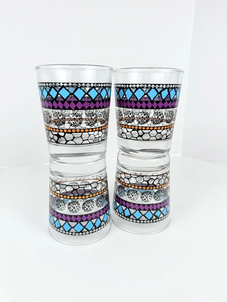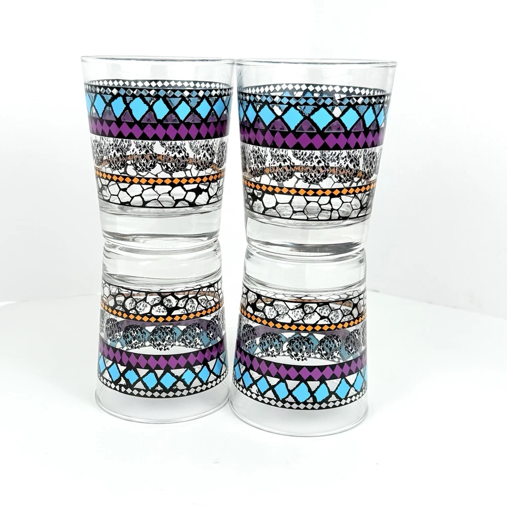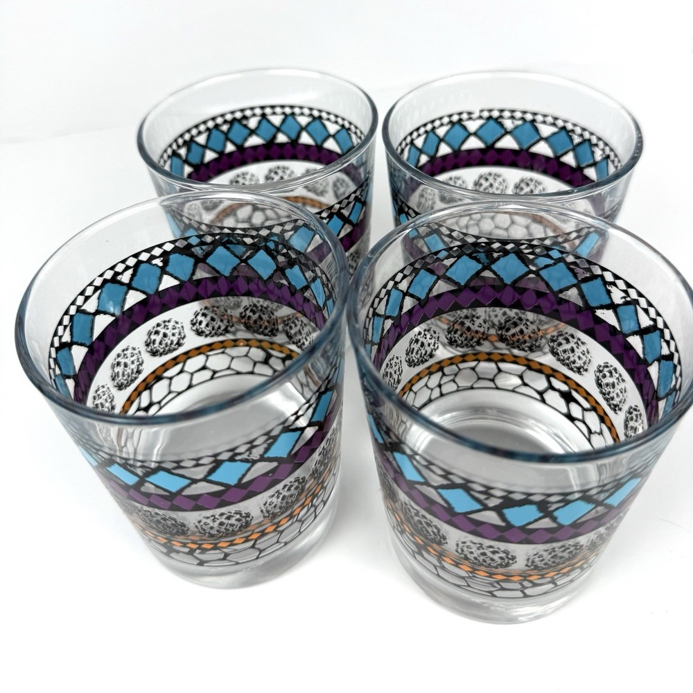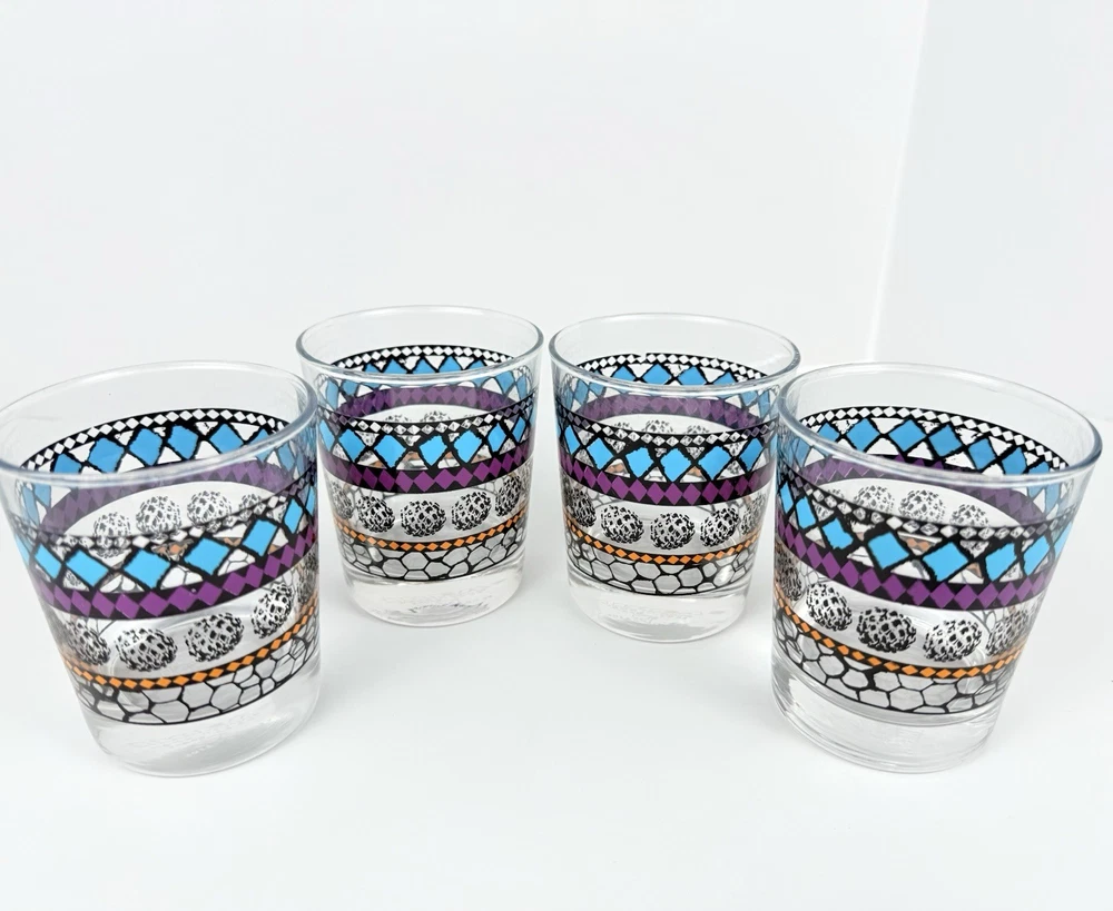 4 IKEA Murkla Cocktail Old-Fashioned Glasses Multicolor Diamond & Dot Bands 8oz 22648 Set of 4 Flat Tumblers/Old-Fashioned Cocktail glasses by IKEA in the discontinued (2013-2021) Murkla pattern. 3 3/4" high, 3 1/8" across, hold 8 oz. Clear glass with a geometric teal, purple, black, and orange band pattern. In excellent condition, no chips, cracks, or wear. Retired glasses from 2015. Let me know what questions you have. Blessings to you!ππ©·ππ€π€ππ©·π