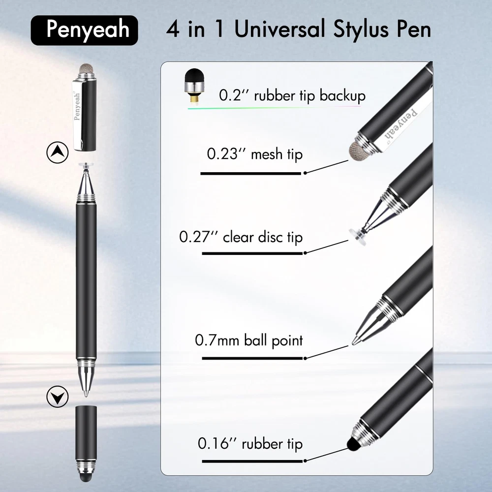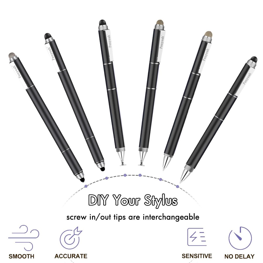 4 In 1 Universal Stylus Pen For Touchscreens With Replaceable Tips And Ballpoint 4-in-1 UNIVERSAL STYLUS: stylus pen for touchscreen include 4 different of touch screen stylus replaceable tips: 1 X 0.27" clear disc tip; 1 X 0.27" mesh fiber tip; 1 X 0.2" rubber tip and 1 X 0.27 " rubber tip; plus a smooth black ink ball point writing pen. One stylus delivers 4 different using experience FULLY COMPATIBLE & VERSITILE: The clear disc stylus is universal and drawing like a fine point stylus; 100% compatible with all capacitive touch screen devices (iPhone,iPad,iPad Pro,Samsung,Galaxy, Android, Cellphone,Laptop,Computer,Kindle,Tablets,HP,Dell,Microsoft,Surface etc.); Perfect for digital signing,browsing,writing,taking notes,drawing apps,playing games; Quick responsive, no battery required, no need for setup; Slim with sturdy pocket clip, easy to use and carry around UNIQUE DESIGN FOR YOUR STYLE: The tablet pens for touch screen is made of high grade metal material, handy comfortable feeling, solid, durable and corrosion resistant. All screw type tips are interchangeable. So you can DIY your-style stylus pen according to your needs and using preference HIGH ACCURATE & PRECISE: The precison stylus for ipad disc tip provides much better flexibility and accuracy, allows you to see exactly where your mark is being made and gives you the accurate point; Mesh fiber tip glides easily on your screens, and rubber tips can help you select small icons exactly, stylus provide you more choice for all your daily use WHAT YOU GET: universal stylus pen x1; High sensitive disc stylus tip x1; Responsive mesh stylus tip x1; 0.2 inch fine point small rubber tip x1; 0.27 inch larger rubber tip x1; Standard D1 pen refill x1; PU leather pen sleeve x1; User manual x1. For replacement accessories please visit store Shipping We offer FREE shipping on all orders! We ship within Three business days of payment, usually sooner. We use a selection of shipping services such as UPS, FedEx, USPS etc. We only ship to the lower 48 states, no APO/FPO addresses or PO Boxes allowed. Local pickups and combined shipping options are not provided at this time. Return You can return a product for up to 30 days from the date you purchased it. Any product you return must be in the same condition you received it and in the original packaging. Please keep the receipt. Payment We accept payment by any of the following methods: PayPal Please pay as soon as possible after winning an auction, as that will allow us to post your item to you sooner! Feedback Customer satisfaction is very important to us. If you have any problem with your order, please contact us and we will do our best to make you satisfied. Contact Us If you have any queries, please contact us via ebay. We usually respond within 24 hours on weekdays. Please visit our eBay store to check out other items for sale! Thank you for shopping at our store.