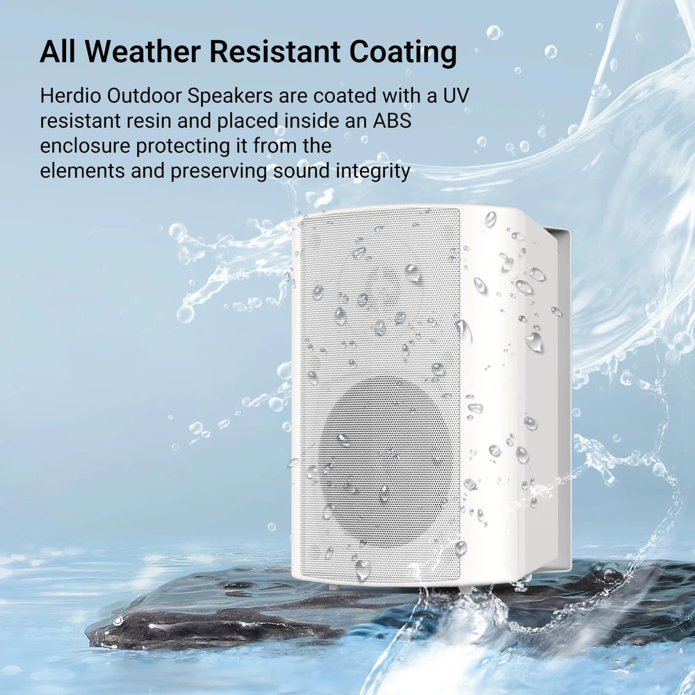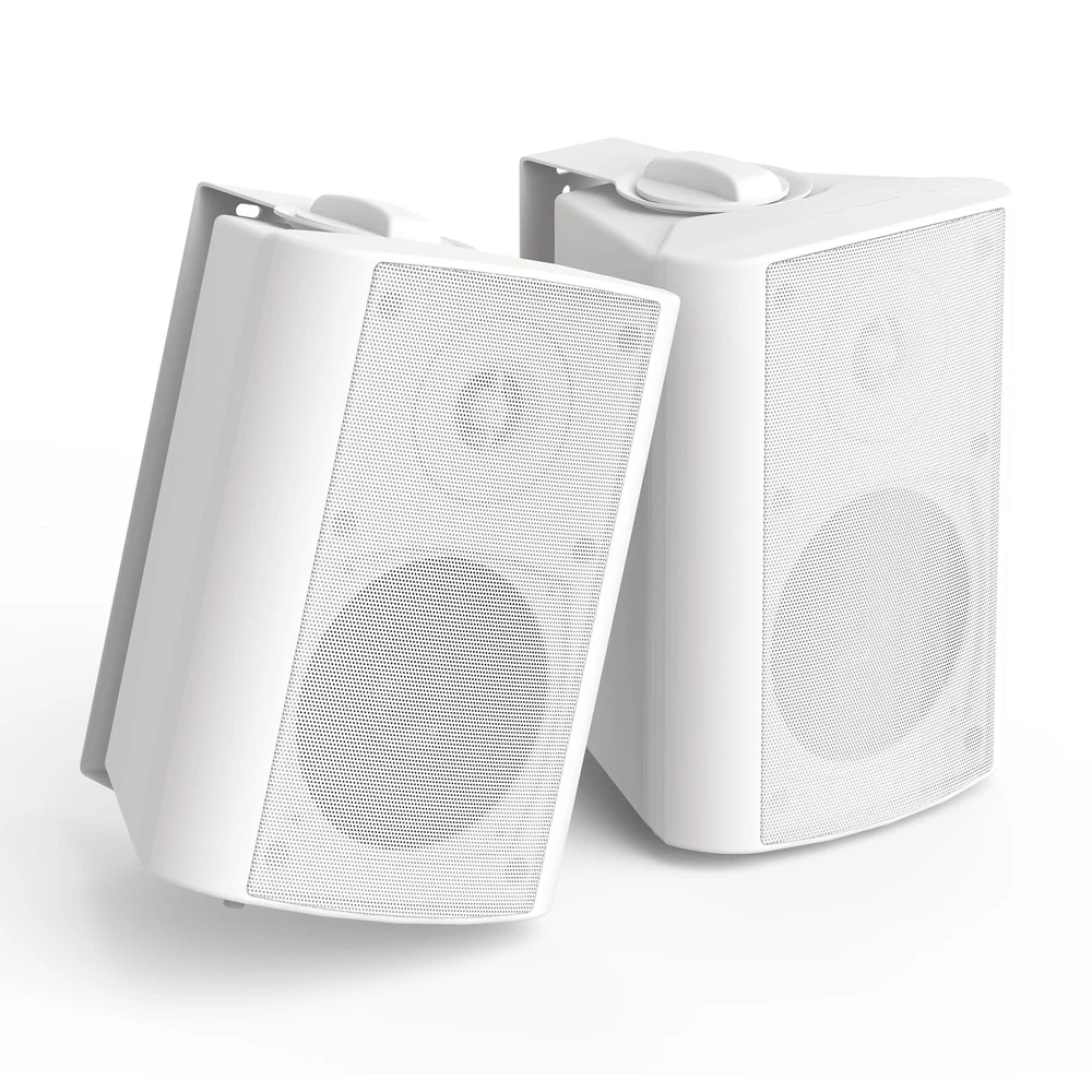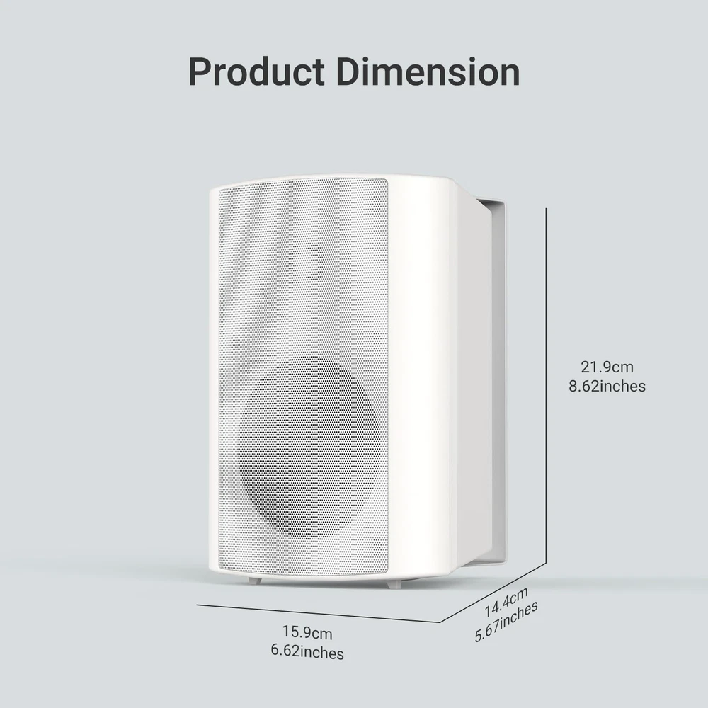 Full Range Sound:The powerful full range indoor outdoor bluetooth speakers wired has a maximum power output of 200watt(100Watt Each) .The outdoor bluetooth speakers’s internal cabinet walls are thick with rigid bracing, allowing for clean clear sound at all the time. Easy installation:Our Outdoor bluetooth speakers with Versatile Swivel Brackets can make sure you will able to place your bluetooth outdoor speakers in your most desired location .Our easy install swivel brackets that allow up to a 90-120 degrees range of motion Ensuring the bluetooth outdoor speakers can easy to install where you want it in the case of patio, garage, basement or in your living room. IP66 Waterproof&Weather Resistant: Our Outdoor bluetooth speakers are is made of durable ABS material and are IP66 grade waterproof making it safe to use in extreme weather.The bluetooth outdoor speakers are excellent for use on Patio,Yard,Poolside,Livingroom.The internal cabinet walls are thick with rigid bracing to prevent unwanted cabinet resonances, allowing for clean clear sound at all levels.and also compatible with Alexa。Caution:the speakers must be plug in the adapter that include in the box. 4" SUBWOOFER with 200W MAX Power: This active + passive outdoor speakers with 200W,pair it with rockin' bass,immerse yourself in the music as it plays. Product Dimensions and What you get:8.62"(219mm) (L) x 5.67"(144mm) (W) x6.62"(159mm) (H).Installs easily on walls and ceiling.The package included 1-Active Outdoor Speakers, 1-Passive Outdoor Speakers,2-Mount Brackets, 1-12V Power Supply and Adapter, 1 DC Cable, 2-speaker wires(16Feet/5meters), 1-Product Manual.