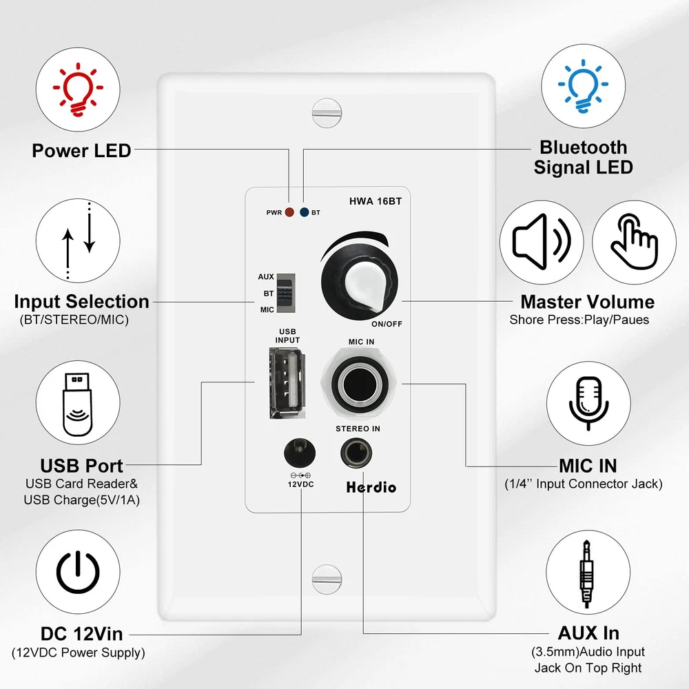 Herdio 4 Inch Bluetooth Ceiling Speakers 160W Flush Mount in Wall Amplifier Receiver Suitable for Indoor Home & Covered Outdoor Porch (Pairs) EASY TO INSTALL: Install this home audio system on any wall in the home or office .The wall mount amplifier has a universal standard wall plate size .Connected with our HCS-418 ceiling speakers and let it give you versatile sound experience that is easily accessible. MIC IN /USB /AUX-IN: It features USB flash memory reader for media playback which also doubles as charging port for your devices. AUX 3.5mm audio input jack lets you connect and stream audio from external devices, The Wall plate receiver adds convenient microphone paging ability along with sample source audio control . IN CEILING SPEAKERS FEATURES: 160WATTS MAX POWER,HCS-418 Ceiling speaker were carefully combined to reproduce sound clearly with outstanding responsiveness. The polypropylene cone with rubber edge will help extending the life of the product Ideal for custom audio applications SPEAKERS DIMENSION: Total Speaker Diameter: 6.4 Inch Cut Out Diameter: 5.7 Inches Total Speaker Depth: 2.6 Inches Mounting Depth: 2.6 Inches What's In the Box: 1x in-wall audio receiver wall plate, 1XAC adapter,2Xscrews 2X in ceiling speakers, 2 x speaker wire SHIPPING Domestic Buyers - We have confidence in our products, but if you are not fully satisfied please contact us within 30 days of purchase and you will get full refund. - We ship within 3 business days of payment, usually sooner - We offer FREE shipping on all orders! - We only ship to the lower 48 states, no APO/FPO addresses or PO Boxes allowed International buyers – please note: Import duties, taxes, and charges aren't included in the item price or postage cost. These charges are the buyer's responsibility. - Please check with your country's customs office to determine what these additional costs will be prior to bidding or buying. * Order Cancellation Policy ** You can return a product for up to 30 days from the date you purchased it. 1. The seller reserves the right to cancel the special case only due to eBay cancellation fee. 2. The decision of seller is the final. 3. The seller will respond to the cancellation request within 2 business days. Please wait for the result of cancellation. 4. In case the cancellation is not completed by some reasons, the buyer can follow the options below to get the refund. 4.1 The buyer can reject the item when it arrives. 4.2 The buyer can send the item back to the seller within 30 days If the buyer receives item (USA Shipment ONLY). The seller will provide the FREE return label to the buyer when the buyer opens " Return Item" case on eBay by using the reason as "Change my mind" ONLY. 5. When buyer has placed the order. The order will be processed and completed by automatic warehouse system within 5 minutes. In case that buyer sends the cancellation request after 5 minutes of placing the order, the request will be rejected. **Sending direct message to cancel the order is not allowed for every case.* Return Policy For the return case - If buyer would like to return the items for refund or replacement, please CONTACT SELLER to receive the free return label from seller. The refund or replacement will be processed with the tracking number of return label which is provided by seller only. The other ways of return which are not approved by seller will not be processed for the refund or replacement.