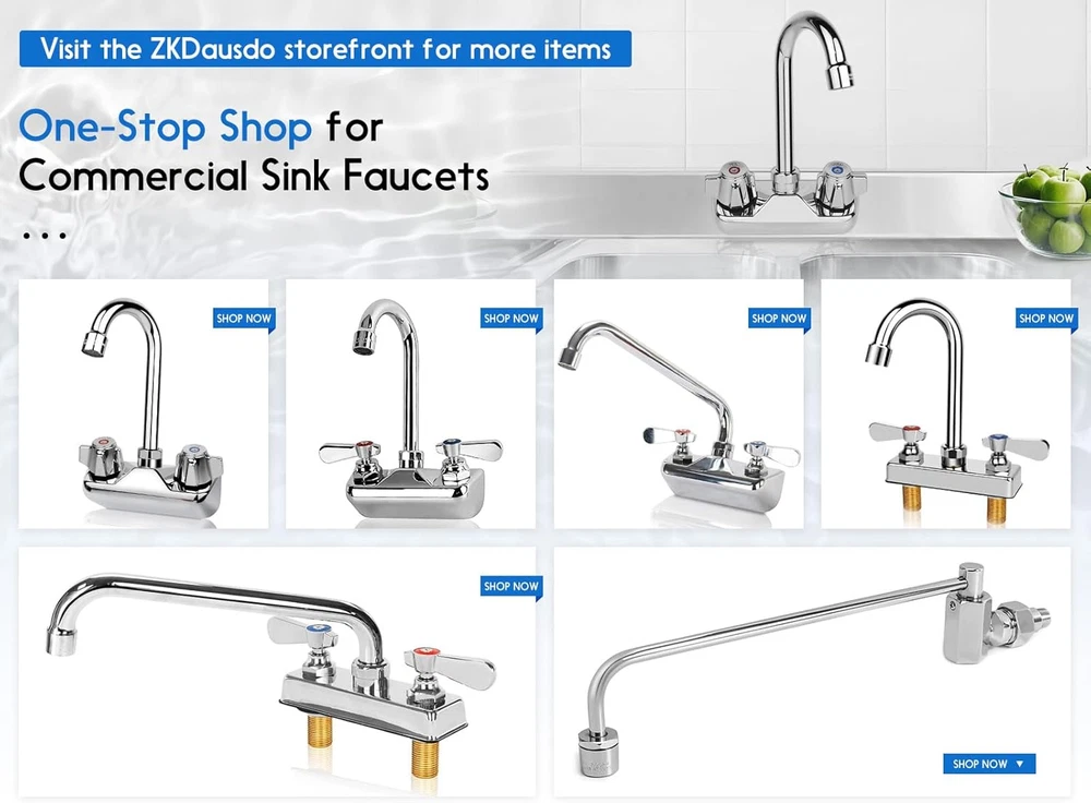 Store New Arrivals Add to Favorite View Feedback 4 Inch Center Commercial Sink Faucet Wall Mount Kitchen Hand Sink Faucet, 1/2" NPT Male Inlet, Brass Constructed & Chrome Polished, with 3-1/2" Gooseneck Spout & Dual Lever Handles Description Item model number ZKD-WKG35L Spout Height 6 Inches Hole Count 2 Spout Reach 3.5 Inches Country of Origin China Is Electric No Maximum Flow Rate 2 Gallons Per Minute Batteries Included? No Handle Location Center Batteries Required? No Finish Chrome Material Brass Installation Type Wall Mount Model Name ZKD-WKG35L Finish Type Chrome Package Dimensions 8.54 x 4.72 x 2.83 inches Item Package Quantity 1 Spout Design Gooseneck Number of Handles 2 Item Weight 2.23 pounds Special Features 360 Swivel Special Feature 360 Swivel Mounting Type Wall Mount Color Chrome Handle Material Brass Recommended Uses For Product Sink, Kitchen Included Components 2 lock nuts,2 ribbed washers,seal tape Handle Type Lever Size 4" center 3.5" gooseneck 4 Inch Center Faucet - Our Wall Mount kitchen faucet with 4" spread center wall mounts are perfect for most commercial kitchen or bar, 3-1/2" Gooseneck Spout and 1/2" NPT male inlet make it ideal to use (If you need luxury style with the Ceramic Cartridge, please search "B0CN38NKTR" in our store to meet your requirement) Commercial High Quality - Sturdy brass construction and polished chrome body for extra durability and longevity. This item also includes reinforced double O-ring valves and ceramic cartridges that ensure that leaks are prevented. Super good choice for commercial duty. Convenient & User-Friendly Design - This faucet features dual temperature lever handles and a double O-ring 3-1/2 inch gooseneck spout which swivels 360 degrees. The dual handles can direct hot or cold water to anywhere you desire. High-Pressure Faucet - Max flow rate is 2 GPM. The faucet comes with an aerator which produces a larger and whiter stream that is SOFT TO TOUCH and NON-SPLASHING. Easy & Hustle Free Installation - We have included the mounting kit of 2 lock nuts and 2 ribbed washers so that you can easily install your faucet. Simply apply seal tape (included) to the inlet of the faucet, and attach supply lines to the inlet. Why Choose Us: ZKDAUSDO specializes in one-stop commercial sink faucets for bar, RV, restaurant, kitchen, laundry, outdoor, and more. We offer luxury models with ceramic valves for a smoother experience and economic options without ceramic valves for everyday use. Visit our ZKDausdo storefront to find the optimal faucet to meet your needs and enjoy quality and affordability Product Description Premium Commercial Sink Faucet for Your Bar Sinks (Click it for deck mount style) Premium Commercial Sink Faucet for Your Cafe Sinks (Click It for 10" Swivel Spout Style) A polished chrome faucet will add a sleek, professional touch to any juice or coffee bar. It creates a clean and inviting space that leaves a memorable impression on customers. In the bustling back kitchen of a restaurant, ZKDAUSDO brass-mounted wall faucet becomes an essential—built to withstand daily use and keep operations running smoothly with reliability and style. ZKDAUSDO specializes in one-stop commercial sink faucets for bars, restaurants, RVs, kitchens, laundry, and outdoor spaces. We offer luxury models with ceramic valves for smoother operation and economical options without ceramic valves for cost-effective and easy maintenance solutions. Learn more↓ One-Stop Shop for ZKDAUSDO Commercial Grade Hand Sink Faucets Add to Cart Add to Cart Add to Cart Add to Cart Add to Cart Add to Cart Add to Cart Customer Reviews 4.4 out of 5 stars 62 4.4 out of 5 stars 190 4.4 out of 5 stars 102 4.5 out of 5 stars 146 4.5 out of 5 stars 130 4.5 out of 5 stars 130 4.4 out of 5 stars 102 Price $54.99 $ 54 . 99 $56.99 $ 56 . 99 $59.99 $ 59 . 99 $56.99 $ 56 . 99 $59.99 $ 59 . 99 $59.99 $ 59 . 99 $59.99 $ 59 . 99 With Ceramic Cartridge? ✔ ✘ ✔ ✘ ✔ ✔ ✔ Installation Type wall mounted wall mounted wall mounted deck mounted deck mounted deck mounted wall mounted Installation Center Distance 4 inches 4 inches 4 inches 4 inches 4 inches 4 inches 4 inches Handle Type 90° quick-turn 90° quick-turn 90° quick-turn 90° quick-turn 90° quick-turn 90° quick-turn 90° quick-turn Spout Reach? 3.5" Reach 3.5" Reach 3.5" Reach 3.5" Reach 3.5" Reach 6" Reach 10" Reach 360° Swivel ✔ ✔ ✔ ✔ ✔ ✔ ✔ Water Flow 1.8 GPM 1.8 GPM 1.8 GPM 1.8 GPM 1.8 GPM 1.8 GPM 1.8 GPM ABOUT US We offer the best prices around on high quality products. Our E-store includes media such as books, movies, music and games while offering electronics, toys, sporting apparel, clothing, tools, general home, garden items and more. SHIPPING We are always working hard to ensure your package arrives as soon as possible. Please understand that some factors like weather, high postal traffic, and the performance of shipping companies are outside of our control. We offer free shipping to the lower 48 states and ship within 2 business days of payment, usually sooner. We do not accept P.O. Boxes. Please provide a physical address. RETURNS We offer a 30-Day Return Policy on items which you are not completely satisfied with. You have the option for a full-refund or an exchange of the item. No returns are available on items shipped outside of the USA. PAYMENT We accept PayPal. CONTACT US This page content is yet to come Please ad us to your favorite seller and visit again later Thank You