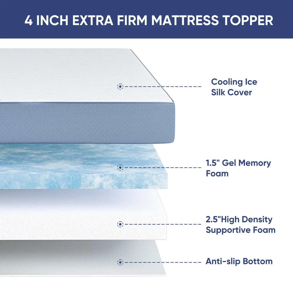 【Advanced 2-Layer Design & Adjustable Firmness】Aivermeil mattress topper features a crafted combination of 1.5" aviation grade gel memory foam and 2.5" high density supportive foam. The top layer provides a relatively moderate feeling while the bottom layer provides a firmer feeling.If you want an extra firm sleep experience, simply flip the foam and use it. 【Moderate Firmness & Relieve Pressure】Our mattress topper achieves a perfect balance of comfort and support. It fits your body contour, evenly distributes weight, and reduces body pressure. At the same time, the high-density support foam at the bottom provides moderate firmness, which is more supportive than ordinary memory foam and can effectively relieve back pain and pressure. 【Removable & Washable Cooling Cover】Aivermeil mattress topper features a skin-friendly nanoparticle ice silk cover, which is cool to the touch and has good breathability. Unique weaving technology is used to enhance air circulation, making it more breathable and cooler than a regular mattress topper. Keeping you cool and comfortable all night long. It's zippered, removable and machine washable, making it very easy to clean and maintain. 【Certified Quality & Anti-slip Design】Aivermeil bed toppers are CERTIPUR-US certified, ensuring low odor, high-quality materials, excellent performance, and durability. Each foam has undergone a rigorous pressure rebound test to ensure long-term durability without collapsing. Adjustable elastic straps and anti-slip bottom keep it stay in place, preventing any unwanted shifting. 【100% Satisfaction Guarantee】 We attach great importance to product quality and offer a year-round worry-free guarantee. If you have any questions or concerns about our mattress topper, please reach out to us at any time. We are committed to providing a satisfactory solution within 24 hours.Please note that due to packaging compression, WAIT FOR 48-72 HOURS after opening for the mattress topper to fully expand.