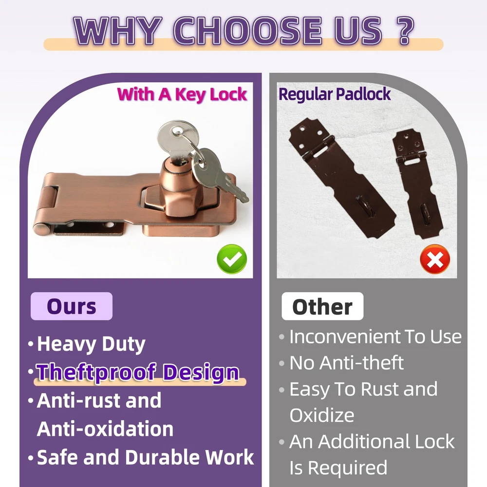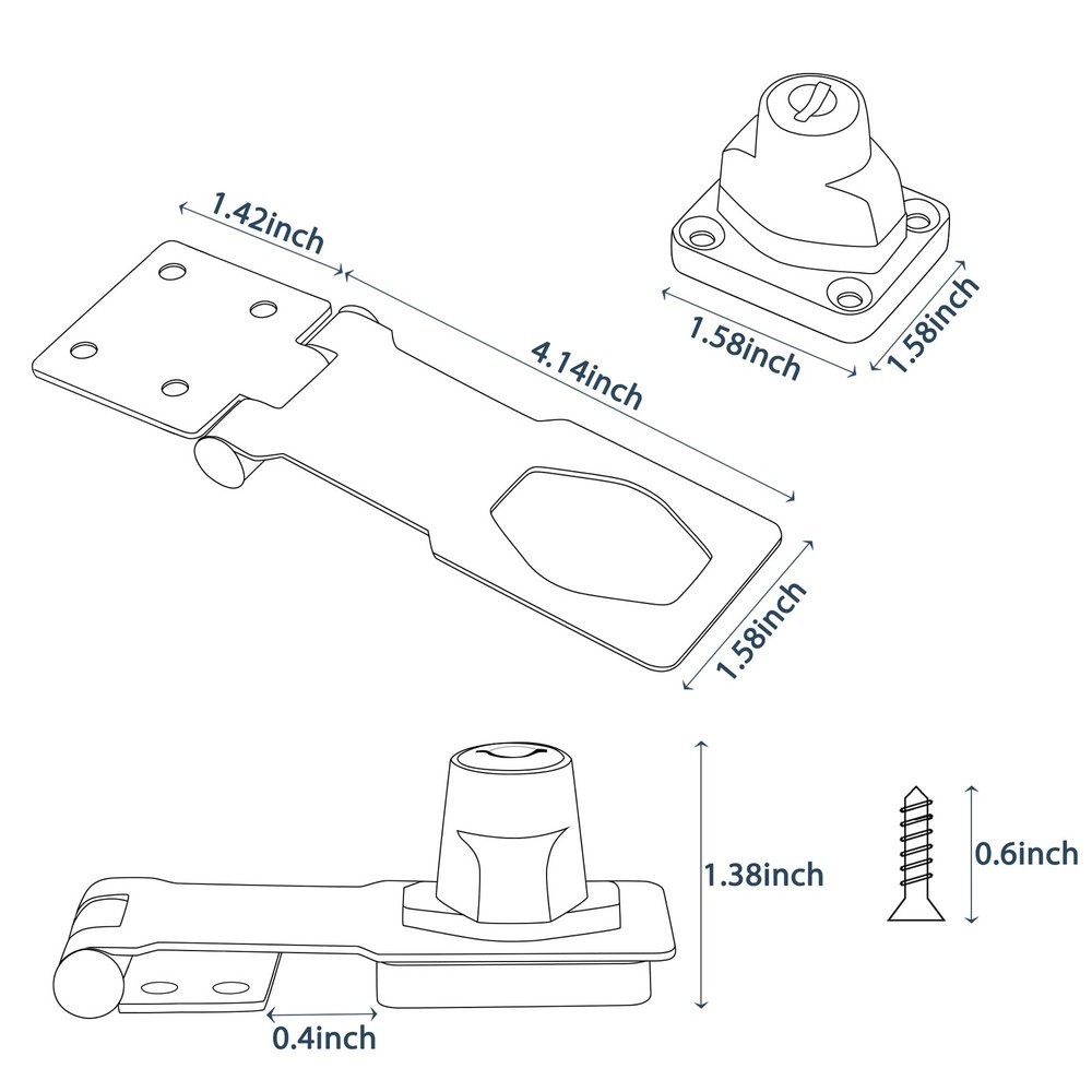 SPECIFICATIONS -Material : alloy metal -Thickness : 2mm -Finish : Red Bronze finish -Installation Method : Screw fixing Package Includes 1 x Keyed Hasp Lock 2 x Keys, Install Screws Buy from Solid metal construction, 2mm-thick, heavy duty design High quality mounting hardwares 30-days return guaranteed 【Premium Material】The hasp lock is made of thickened solid metal material( hi-q solid zinc alloy), ensuring quality and longevity, strong and durable, not easy to rust and oxidation.Brushed finish surface makes it a better looking ,more smooth and beautiful,not easy to oxidation, fading and paint off,which is a good match to modern home. 【Strong Base & Integrated Lock Catch】: The hasp lock latch with lock,has lock plate and lock catch, and the panel has been further thickened and firmer.The lock hasp is integrated molding without welding hinge,which make it hard to damage so that increase security.The base and locks are further thickened, and the surface is chrome -plated, and the abrasion resistance and rust resistance are stronger. 【Automatic Fast Security Lock】With automatic lock cylinder, it can be quickly locked by directly turning it 90°.The keyed hasp lock uses high quality lock core and comes with keys, which is simple but secure and eliminates the need for padlocks, offers reliable protection against intruders. 【Wide Applications】:The locking hasp is suitable for installation in the place where you need to lock protect your house, property, and personal privacy. Such as all kinds of door, window, cabinet, drawer, furniture, pet cage, closets, cupboards, storage containers, sheds, storage bins, garage doors, tool boxes,sliding doors, wardrobes, fence,and etc. 【Easy To Install】 Just install the lock hasp latch with the euqipped screws. Installation and maintenance are simple and practical. The bolt lock can also be mounted on the left or right.