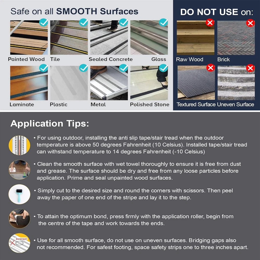 Fast Shipping On All Items 30 Days Money Guarantee Customer Support Excellent Service 100% Satisfaction Satisfaction Guaranteed 4 Inch X 35FT Non-Skid Grip Tape for Stairs Steps Traction Tread Boat Steps Specification Item model number TAPE BLACK 4X35 with ROLLER Number of Items 1 Color Black Material PET Base and Silicon Carbide Special Feature Anti,Anti Slip,Strong Package Dimensions 5.2 x 5.04 x 3.98 inches; 1.57 Pounds Size 4" X 35' + Roller 5.04 inches x 5.2 inches x 3.98 inches. Weight: 1.57 lb Item Description Easy to Install with Roller Included - Anti slip tape measures 4 in by 35 ft a perfect size for all your needs. Simply cut out a piece of any size, peel the protective film, and apply the tape on a clean surface. Finally, press firmly with the roller. That’s so easy! Durable Weatherproof Adhesive - Our grip tape is designed with a highly durable water resistant strong adhesive layer to make sure your tape does not peel off after a few days of use. Our non slip tape for stairs was specifically designed to withstand heavy foot traffic and any weather conditions, including rain, snow, frost, sun, water, and heat. Anti skid tape creates an exceptional long term grip on all smooth surfaces for many years. Prevents Slipping with Perfect Texture - Anti slip tape help you take matters into your own hands when it comes to you and your family's safety. Non skid tape uses a 80 grit aluminum oxide traction pad which boosts foot traction with a subtle texture, giving you and your loved ones the most all-around protection without sacrificing comfort. Reduce the risk of falls, trips and slips for your loved ones, especially the elder, children and pets. Works on Multiple Surfaces - Exceptionally strong grip tape is durable for indoor and outdoor uses as well as stairs, entryways, ladders, concrete, metal, plastic, tile, laminate, mats, shoe grips, skateboard grip, ramp and scooters... Our tape can be used on all smooth surfaces. Enjoy all around protection and ultimate comfort in your home, as well as in hotels, restaurants, businesses and educational establishments. Easy to Use with Our Customer Support - Leyibo has become one of the most professional manufacturers by only making high traction anti slip tape which has been tested by the market for many years. Designed in the USA and produced according to the highest quality standards. Your new favorite anti slip tape is just a few clicks away! If you have any problems, contact us. We will solve it for you! About us We offer the best prices around on high quality products. Our E-store includes media such as books, movies, music and games while offering electronics, toys, sporting apparel, clothing, tools, general home, garden items and more. Shipping We are always working hard to ensure your package arrives as soon as possible. Please understand that some factors like weather, high postal traffic, and the performance of shipping companies are outside of our control. We offer free shipping to the lower 48 states and ship within 2-3 business days of payment, usually sooner. We do not accept P.O. Boxes. Please provide a physical address. For shipping outside of the continental USA, we only use eBay's Global Shipping Program.The item is shipped to KY and then sent to the rest of the world. International customers are responsible for all duties and taxes. Continue to check out to calculate costs for shipping the item to your country. Messages regarding eBay's Global Shipping Program MUST be directed at eBay EXCLUSIVELY. Returns We offer a 30-Day Return Policy on items in which you are not completely satisfied with. You have the option of a full-refund or an exchange of the item. No returns are available on items shipped outside of the USA Satisfaction We try over very best to make sure every customer is completely satisfied. If there's a problem, message us! We're happy to help. Payment Options Shop With Confidence