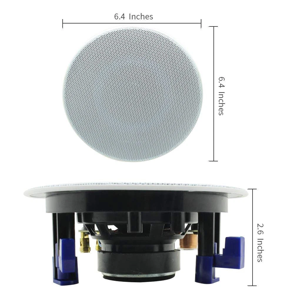 Compatible with Bluetooth:Independent Digital Amplifier box bring you surround sound effects. allows for wired music streaming ability and doubles as a sound processing digital amplifier. You will be able to stream audio from all of your favorite devices (like smartphones, tablets and computers). FLUSH MOUNT DESIGN:Compact flush mount design for simple easy installation in-wall / in-ceiling , or pre-cut speaker openings, for in home use, office, professional, or custom audio applications on any flat surface. PAINTABLE GRILLS with MAGNETS:makes it easy to attach or remove for quick installation. The large mounting clamp with non-slip tread grips ceilings or walls firmly for sure installation. No need for expensive professional installation 160WATTS MAX POWER:ceiling speaker system were carefully combined to reproduce sound clearly with outstanding responsiveness. The polypropylene cone with rubber edge will help extending the life of the product great for custom audio applications MOUNTS ON WALL/CEILING: Total Speaker Diameter: 6.4 Inches (16.2CM).Cut-Out Diameter:5.7Inches (14.5CM).Total Speaker Depth:2.6 Inches(6.5 CM).Mounting Depth:2.6 Inches (6.5CM )