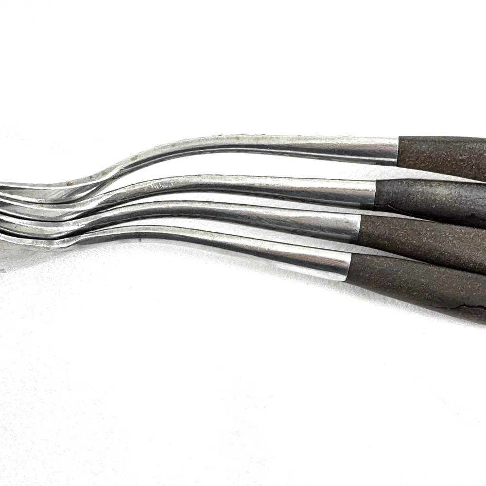 Offering a lot of 4 Interpur INR2 oval soup spoons 7.75” long, mid-century modern style, a discontinued pattern made in Japan. The brown synthetic handles are sturdy and have cracks. The stainless steel is in good condition, no chips, dents, or disposal damage. There are surface scratches and wear consistent with normal use. Please view the photos for details and condition. Measurements and photo colors are approximate. For extra protection your items will be packed in plastic sleeves and shipped in a box. For combined shipping, request an invoice before paying. Shipping is your choice of USPS Ground Advantage or USPS Flat Rate Priority at the rate determined by eBay. Terms of Sale: Photos are of the actual item you will receive and is sold "as is". Placing an order is your agreement that you know what you are buying, have viewed the photos and find the condition acceptable. If you have any questions or concerns about your order, contact me through eBay Messages. Please inspect your item upon arrival and contact me if there are any problems so we may work out a solution, before you leave feedback or request a refund . No returns please.