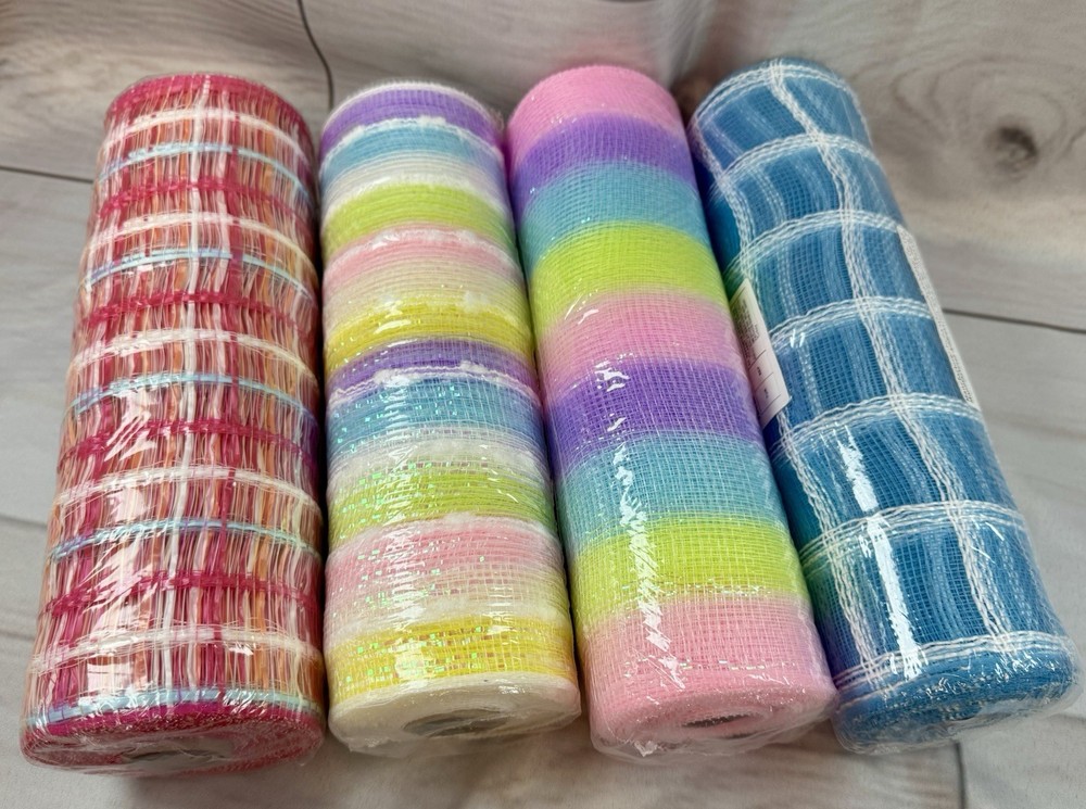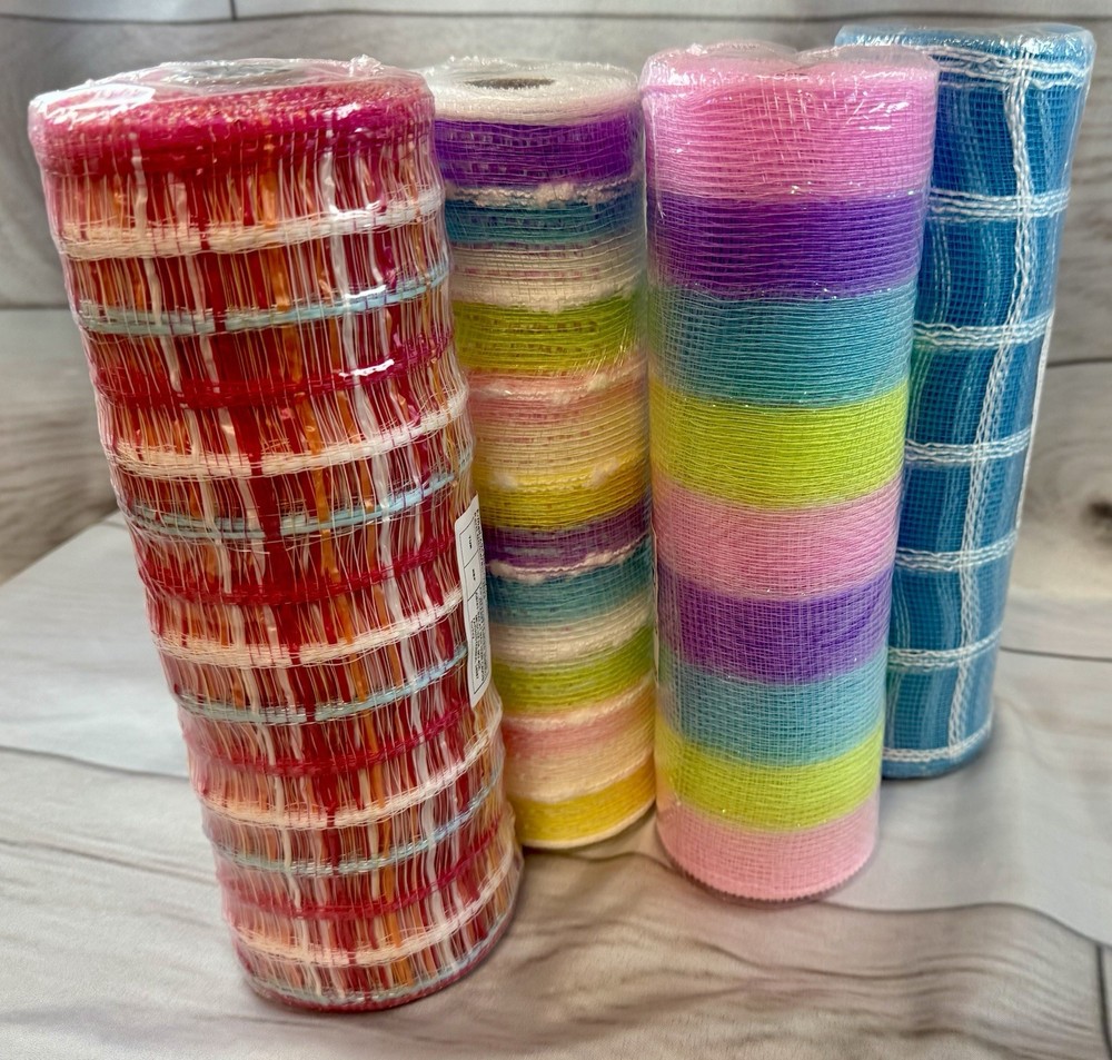 The product is a lot of four mesh ribbon rolls measuring 10 inches wide and 10 yards long, in several colors with a plaid pattern. Specifically designed for crafting and wreath making, these mesh ribbons are perfect for adding a festive touch to spring-themed projects. The Plaid brand ensures quality and consistency in this crafting supply, making it a versatile and decorative addition to various creative endeavors.