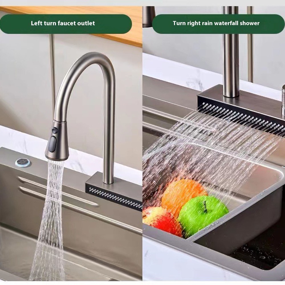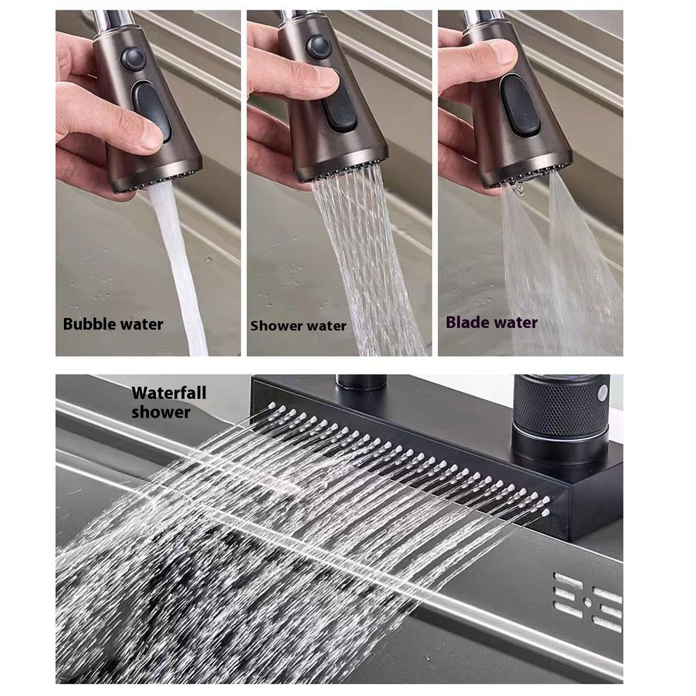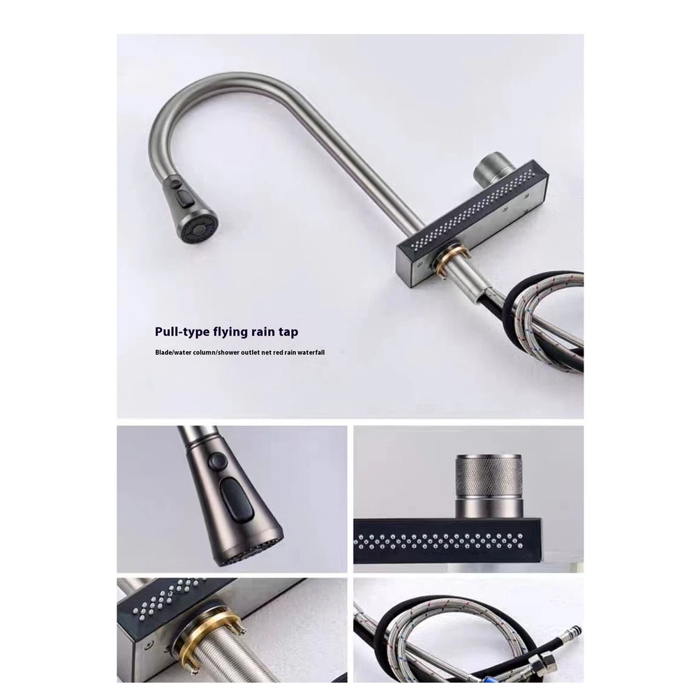 4 Modes Faucet with Pull Down Sprayer Kitchen Sink Silver Faucets 360° Rotation Features: High-quality kitchen faucet: The main parts are made of ceramic material, which is durable and trustworthy. Smooth and bright, beautiful and durable. The design is elegant and stylish, suitable for all kitchen faucets. Four modes of water spraying function: mode is suitable for washing fruits and vegetables; strong pressure mode can produce foam for efficient cleaning; booster mode can quickly rinse dirt; water flow mode is suitable for filling pots and pans; spray mode is suitable for advanced cleaning and has a wide range of uses. Easily complete various kitchen tasks and spend more good with your family. 360° rotation + pull-out, no dead angle for cleaning: 360° rotation + faucet pull-out function, say goodbye to fixed faucets, can be rotated to one side during daily cleaning to reduce collisions, fully expand the water output range, flexible operation, and bring you a more convenient experience. Knob to adjust the water temperature: use of the knob to adjust the water temperature, the new mode is not convenient for washing vegetables and fruits, but also brings a modern and elegant feeling to your kitchen. After- guarantee: If you find any problems with the product, please us and we will solve the problem for you as soon as possible. Product Description: Material: Steel Color: As the picture shows, (Due to the difference between different monitors, the picture may have slight color difference. please make sure you do not mind before ordering, Thank you!) Package weight: 1600g Package size: 53.70x27x7.50cm,(Please allow 1-3mm error due to manual measurement. please make sure you do not mind before ordering.)