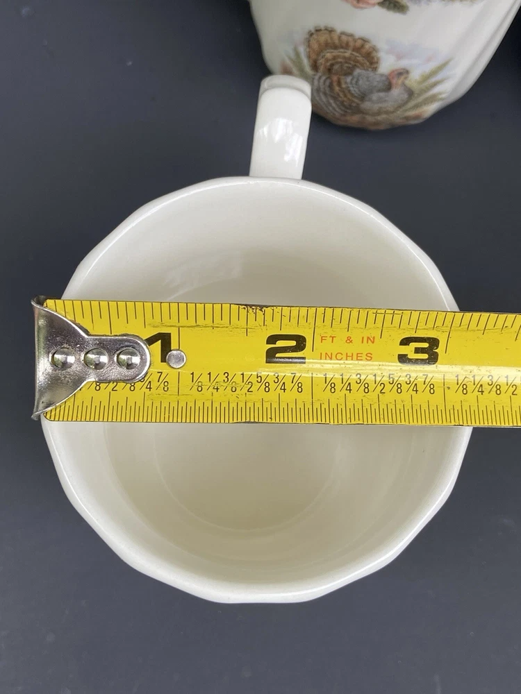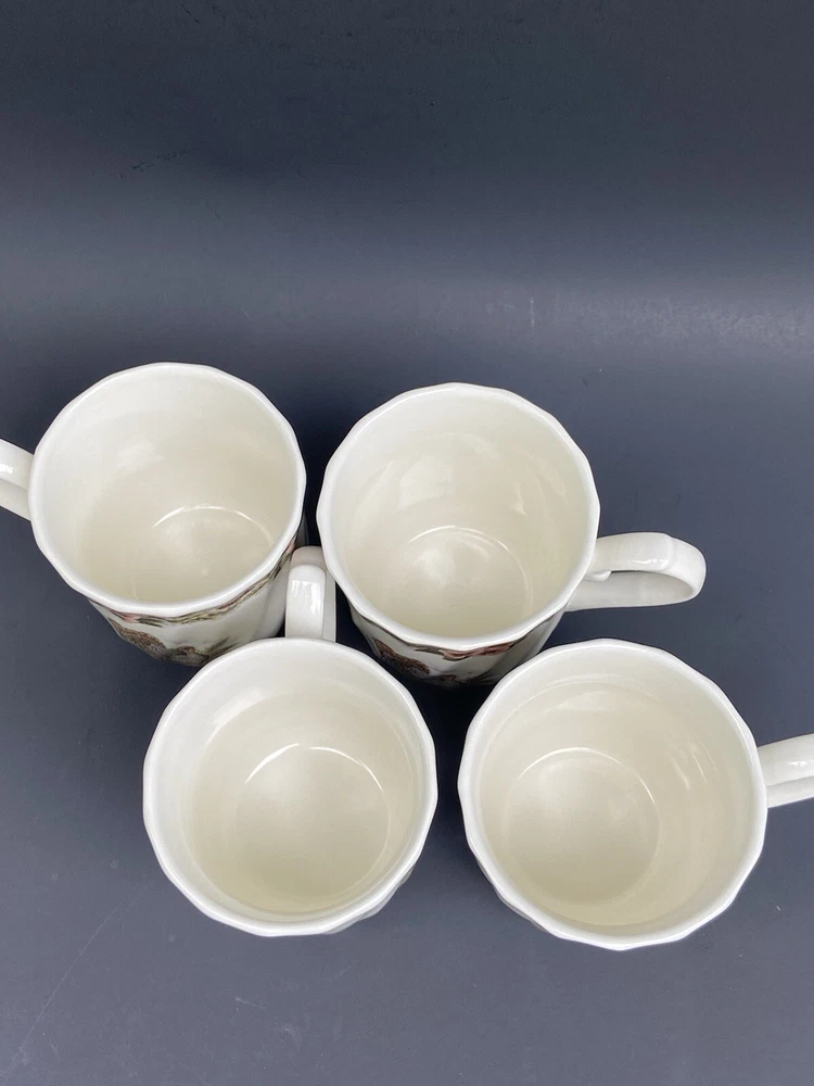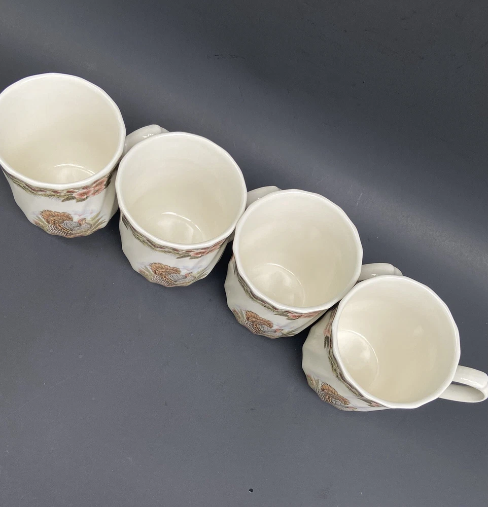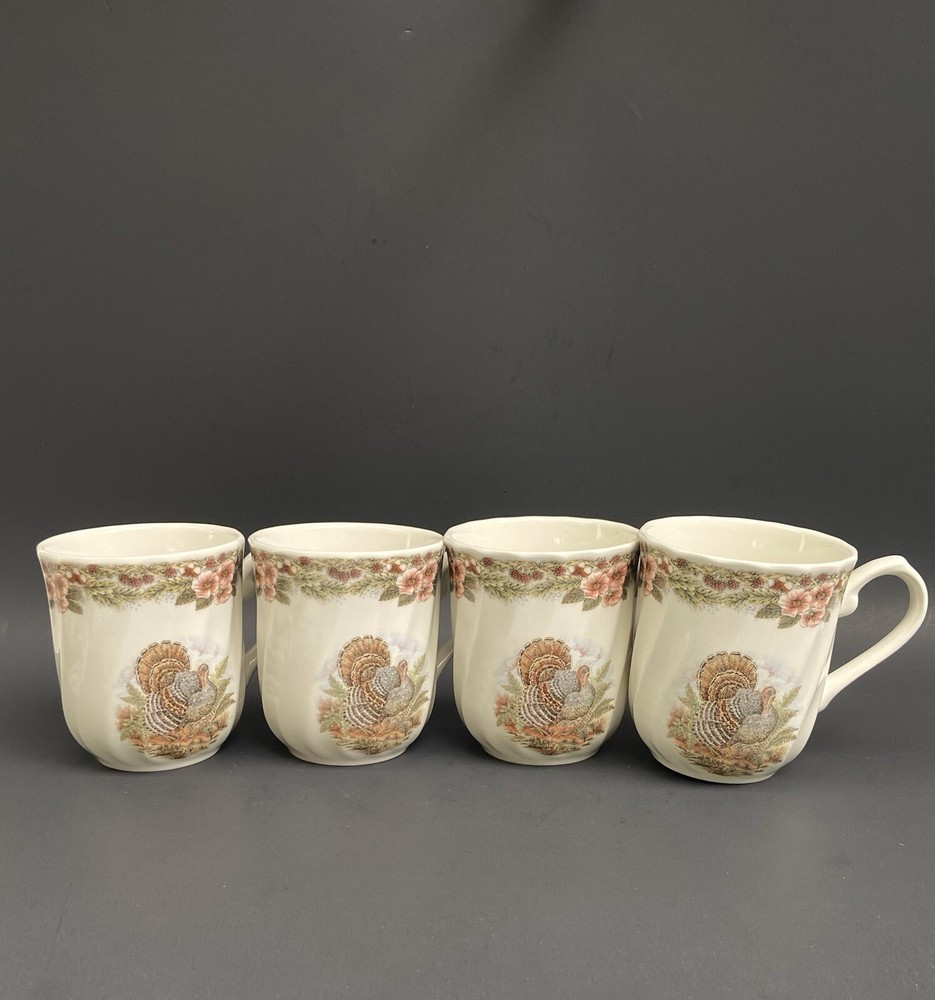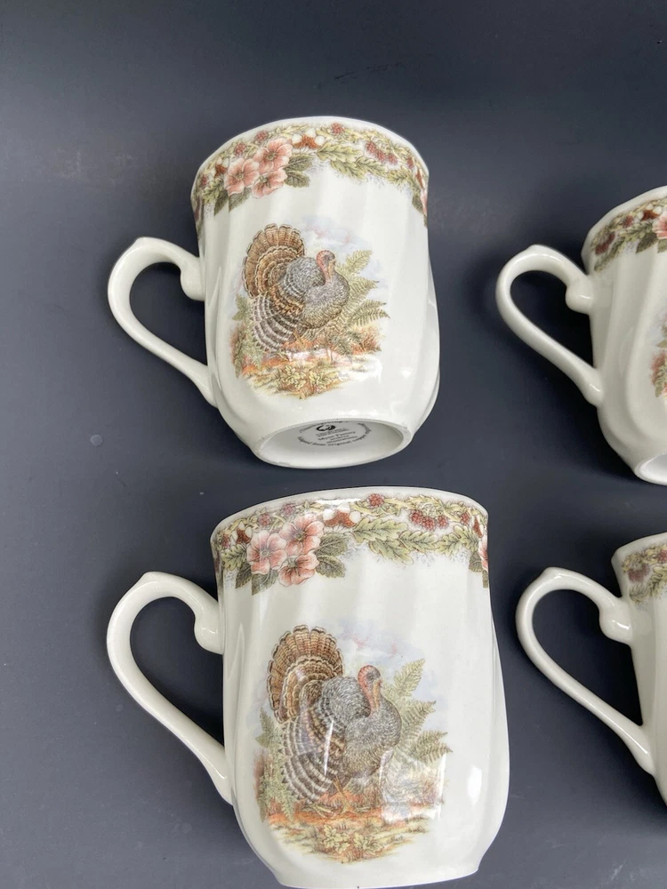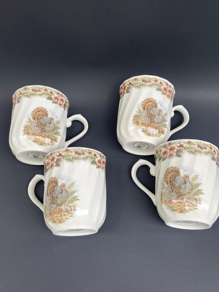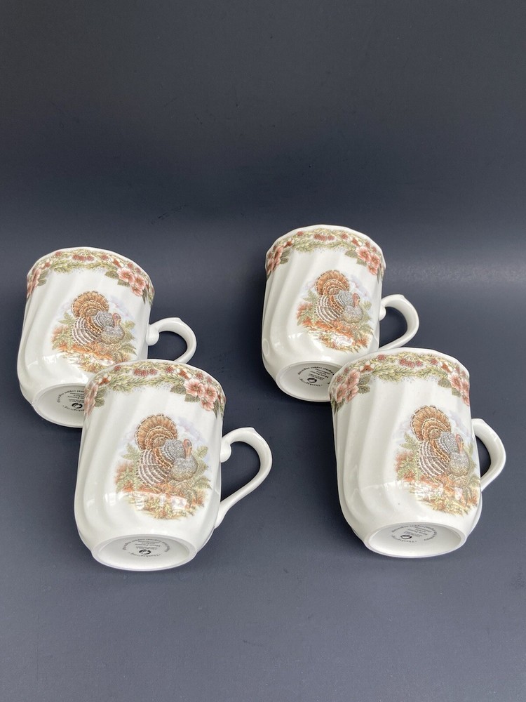 4 Churchill Myott Thanksgiving Tea/Coffee Mugs Turkey Floral Swirls NEW. Approximately diameter of 3.25 inches wide, height 3.75 inches tall and capacity of approximately 10 US fluid ounces. All are unused, glossy and no signs of wear; no surface scratches. No chips, no crazing, no cracks nor chips noted. All of the pictures were taken in natural daylight to capture the closest actual shade of color; however and in person, the mugs might be slightly brighter or darker than the photos due to camera’s autofocusing features. The set weighs approximately 2 pounds and 2 ounces without packaging material. Will package with great care and thank you kindly for your consideration. REASONABLE SHIPPING: Calculated shipping: Weight and distance based shipping via USPS Ground Advantage domestically USA from South Florida. USPS Ground Advantage is lowest shipping cost. Estimated delivery of 2-8 business days. Shipping costs is based on item(s) weight including packaging materials and the distance from the seller’s zip code to the buyer’s zip code. Buyers whose shipping address/zip code is in the East coast of USA tend to have higher shipping costs as distant is longer from seller’s South Florida zip code. Ships globally via Ebay International Shipping Delivery.