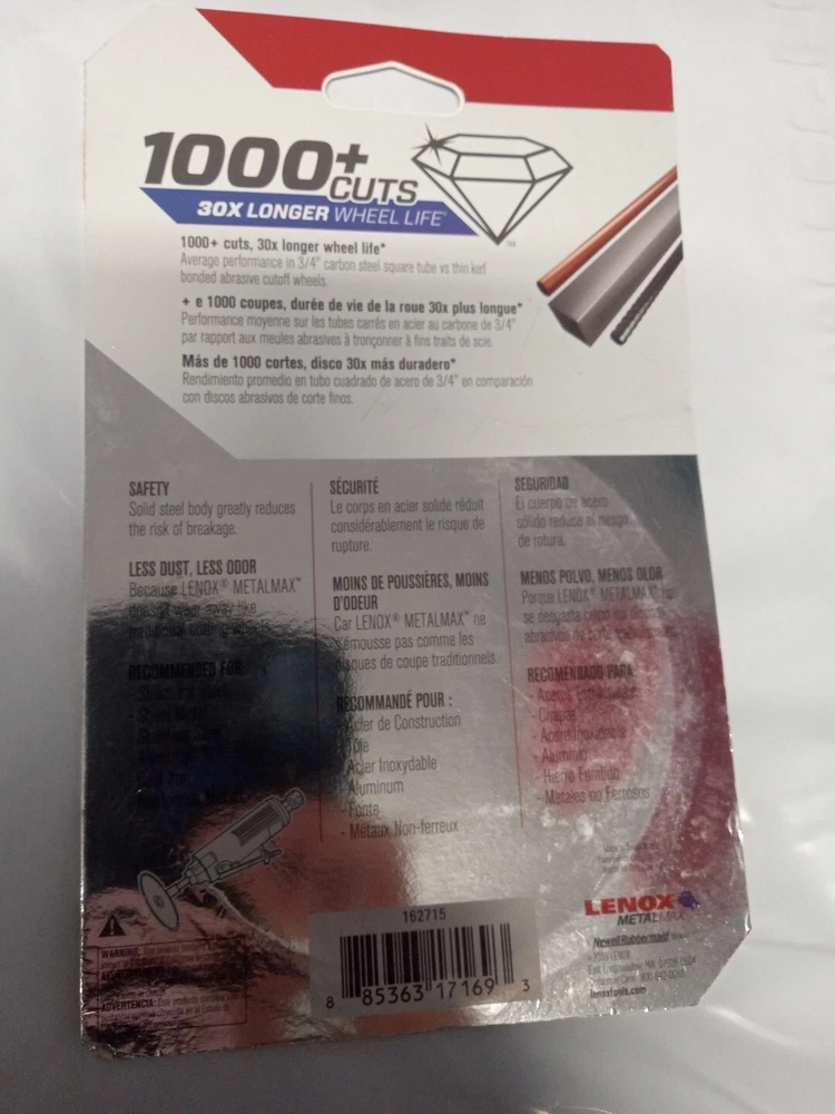 ,Delivers 1,000 or more cuts without changing the wheel and 30X longer life than thin bonded cutoff wheels* Advanced diamond technology provides extreme durability in metal cutting applications, for increased productivity, reduced downtime, and a lower cost per cut compared to thin bonded cutoff wheels Solid steel wheel body greatly reduces risk of breakage for added safety Diamond construction maintains original wheel diameter and cutting depth throughout the life of the blade for better control, reach, and precision Recommended for steel, sheet metal, stainless steel, rebar, cast iron, aluminum** and non-ferrous metals SKU 0685