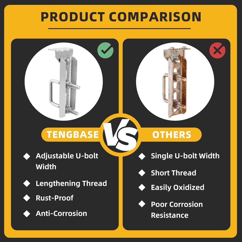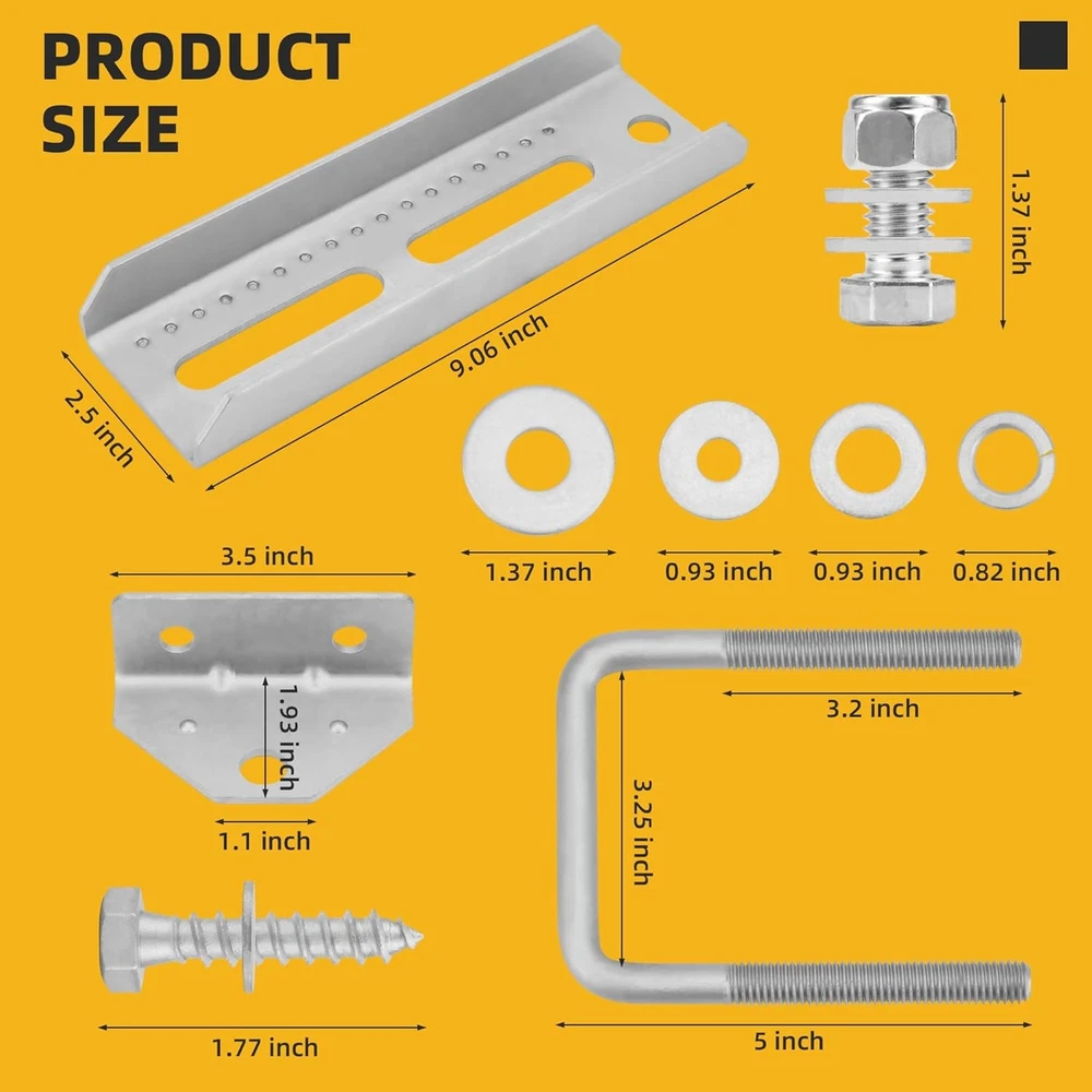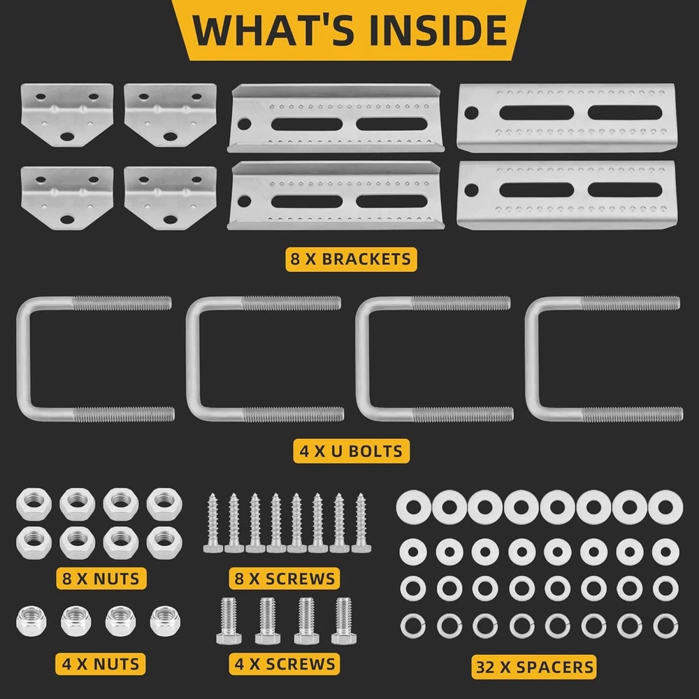 Description Features: UNIVERSAL FIT: 8-inch galvanized swivel top brackets designed to fit 3"x3", 2"x3", and 1.5"x3" boat trailer crossmembers, ensuring a perfect fit for various trailer cross beams and accommodating different widths effortlessly. Corrosion-Resistant Material: Made from heavy-duty galvanized steel, our bunk brackets are engineered for durability and resilience. They resist bending and deformation, making them ideal for both freshwater and saltwater boat trailers, ensuring long-lasting performance. Adjustable Angles: The adjustable top bracket kit allows for easy alignment of your trailer's support points to your boat's hull profile. Whether your hull is angled or flat, you can achieve an optimal fit for your boat with our boat trailer bunk brackets. User-Friendly Installation: Designed with convenience in mind, our boat trailer kit adheres to industry-standard 8" heights and features multiple slotted holes for easy adjustments in height and angle, making installation and customization a breeze. Complete Tool Kit Included: Each kit comes with all necessary components for installation and replacement: 4 rectangular brackets, 4 trapezoidal brackets, 4 U-bolts, and mounting hardware, offering everything you need for a hassle-free setup of your boat trailer bunk brackets. Product Details: Unit Count: 4.0 Count Mounting Type: Surface Mount Finish: Galvanized Item Package Quantity: 1 Included Components: (12) Nut, (12) Screw, (32) Spacer, (4) U Bolt, (8)Bracket Batteries Included?: No Batteries Required?: No Color: Silver Material: Carbon Steel Finish Type: Galvanized