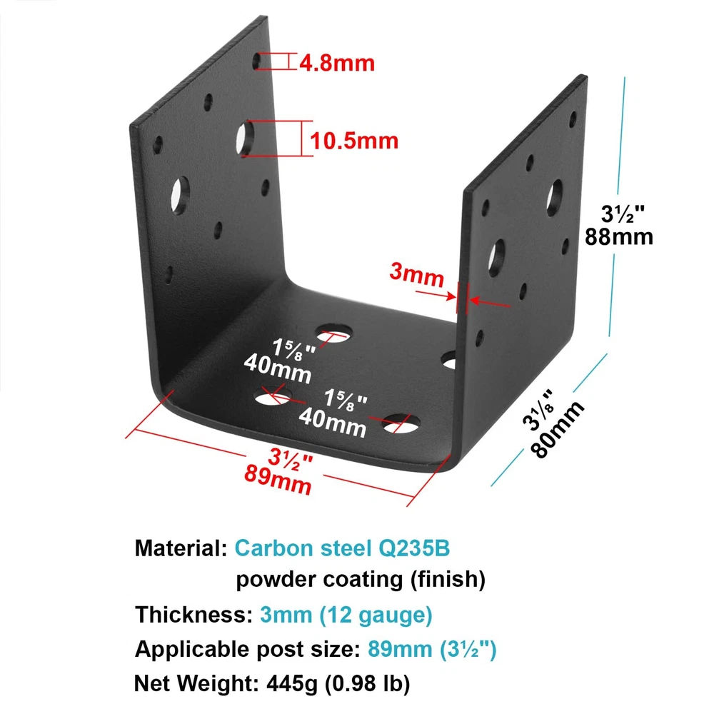 4 PCS Black Half Post Base Fit 4 x 4 Post Anchor Connector, Heavy Duty Steel Mounting Joist Hanger Brackets Support, Inner Size 3 1/2", 11 Gauge Steel Thickness 3mm Specification: Material: Carbon Steel Q235B Surface Treatment: Black Coated Fit 4 x 4 Post Anchor Connector 8 Pilot Holes: Ø3/8"(10.5mm) 12 Nail Holes Diameter: Ø3/16"(5mm) Package size: 38 x 11 x 8.5cm Weight: 0.98lb(445g)-1 piece, 4.12lb(1.9kg)-4 pieces Package Content: 4 x Black Post Base Post Anchor Material: Carbon Steel + Surface Treatment Coated Fit 4 x 4 Post Anchor Connector(Inner Size: 3-1/2"), 11 Gauge Steel Thickness: 3mm 8 Pilot Holes: Ø3/8"(10.5mm). 12 Nail Holes Diameter: Ø3/16"(5mm) Weight: 0.98lb(445g)-1 piece, 4.12lb(1.9kg)-4 pieces Package Content: 4 Pieces Black Post Base