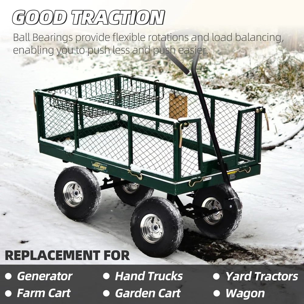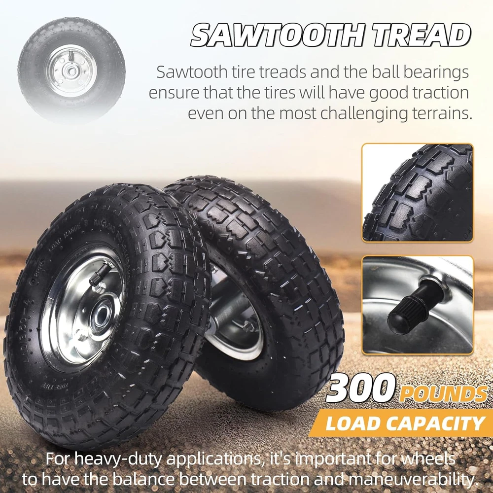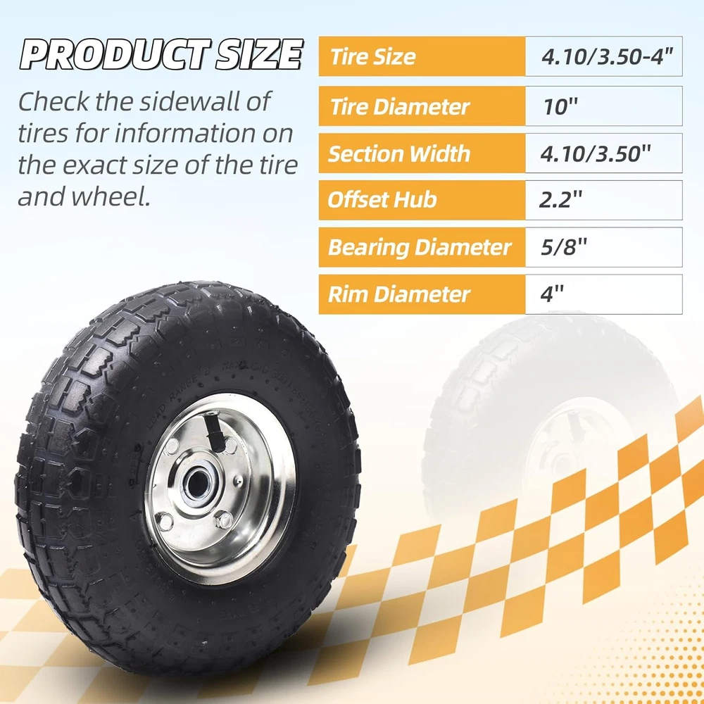 UNIVERSAL 4.10/3.50-4 TIRE AND WHEEL FOR VERSATILE APPLICATIONS - Universal 4.10/3.50-4 Tire and Wheel, featuring 10-inch diameter pneumatic rubber tire and 5/8" (0.625") Axle Bore Diameter. With hub offset of 2.1", this tire fits seamlessly with dollies, walk-behind lawn mowers, hand trucks, wheelbarrows, yard trailers, dollies, trolleys, wagons, snow blowers, pressure washers, air compressors, generators, wood chippers and more. PREMIUM 10" PNEUMATIC TIRE AND WHEEL FOR SMOOTH RIDE - Heavy Duty 10" Pneumatic Tire and Wheel. Crafted with a 100% natural rubber tire and inner tube (PSI 30) and premium-quality steel rim, these wheels offer maximum shock absorption, ensuring a smooth and comfortable ride. Our rubber, 4X thicker than other brands, guarantees durability and performance. SAFETY-FIRST HEAVY DUTY INNER TUBES FOR 4.10/3.50-4 TIRES - Safety first is our motto. We ensure that all our products pass safety standards. These tires' inner tubes have an heavy-duty design that creates an airtight seal in the event of a tire puncture. Ideal for those seeking reliable 4.10/3.50-4 tire tubes to enhance safety on the road. SAWTOOTH TREAD AND DOUBLE-SEALED BALL BEARINGS FOR TOUGH TERRAINS - For heavy-duty applications, it's important for wheels to have the balance between traction and maneuverability. The sawtooth tire treads and the ball bearings ensure that the tires will have good traction even on the most challenging terrains while the ball bearings provide flexible rotations and load balancing, enabling you to push less and push easier. US-BASED CUSTOMER SERVICE - Have questions about your purchase or our products? Reach out to our responsive US-based customer service team. Please verify compatibility before purchase to ensure a match. Suitable for dynamic load-bearing, not recommended for static load-bearing. Your satisfaction and safety are our top priorities. Product Description