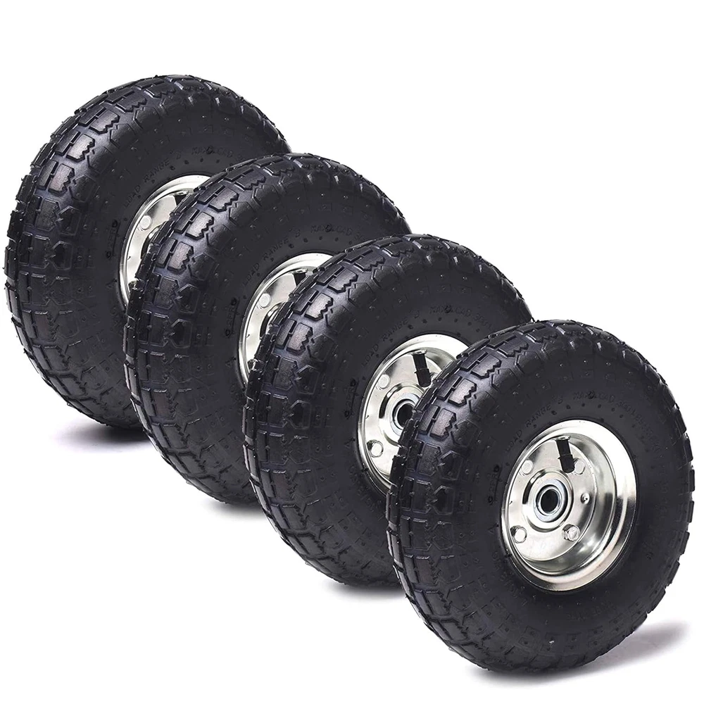 UNIVERSAL 4.10/3.50-4 TIRE AND WHEEL FOR VERSATILE APPLICATIONS - Universal 4.10/3.50-4 Tire and Wheel, featuring 10-inch diameter pneumatic rubber tire and 5/8" (0.625") Axle Bore Diameter. With hub offset of 2.1", this tire fits seamlessly with dollies, walk-behind lawn mowers, hand trucks, wheelbarrows, yard trailers, dollies, trolleys, wagons, snow blowers, pressure washers, air compressors, generators, wood chippers and more. PREMIUM 10" PNEUMATIC TIRE AND WHEEL FOR SMOOTH RIDE - Heavy Duty 10" Pneumatic Tire and Wheel. Crafted with a 100% natural rubber tire and inner tube (PSI 30) and premium-quality steel rim, these wheels offer maximum shock absorption, ensuring a smooth and comfortable ride. Our rubber, 4X thicker than other brands, guarantees durability and performance. SAFETY-FIRST HEAVY DUTY INNER TUBES FOR 4.10/3.50-4 TIRES - Safety first is our motto. We ensure that all our products pass safety standards. These tires' inner tubes have an heavy-duty design that creates an airtight seal in the event of a tire puncture. Ideal for those seeking reliable 4.10/3.50-4 tire tubes to enhance safety on the road. SAWTOOTH TREAD AND DOUBLE-SEALED BALL BEARINGS FOR TOUGH TERRAINS - For heavy-duty applications, it's important for wheels to have the balance between traction and maneuverability. The sawtooth tire treads and the ball bearings ensure that the tires will have good traction even on the most challenging terrains while the ball bearings provide flexible rotations and load balancing, enabling you to push less and push easier. US-BASED CUSTOMER SERVICE - Have questions about your purchase or our products? Reach out to our responsive US-based customer service team. Please verify compatibility before purchase to ensure a match. Suitable for dynamic load-bearing, not recommended for static load-bearing. Your satisfaction and safety are our top priorities. Product Description