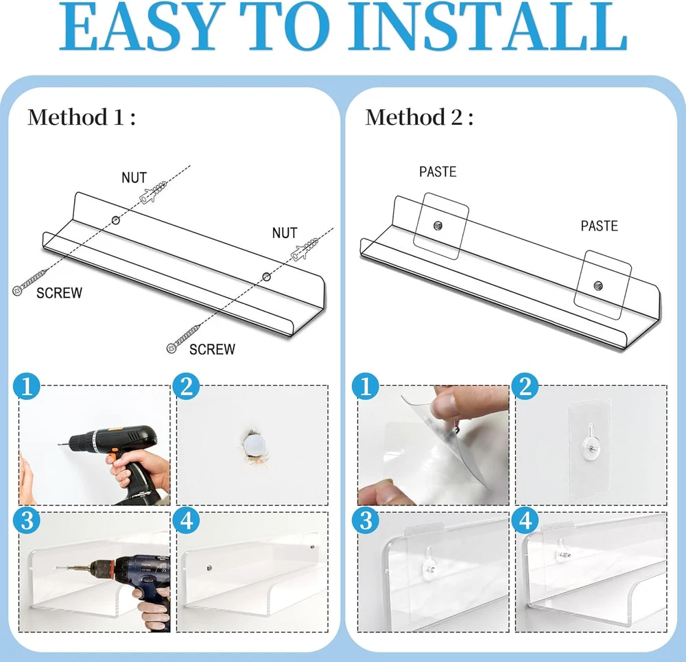 Store New Arrivals Add to Favorite View Feedback Contact 4 Pack 15'' Clear Acrylic Shelves for Wall Mounted Display Ledge Storage Racks Description Style Modern Number of Items 4 Country of Origin China Room Type Office, Bathroom, Bedroom, Study Room Assembly Required Yes Product Dimensions 15"D x 4"W x 1.88"H Installation Type Wall Mount Age Range (Description) Adult Material Acrylic Mounting Type Wall Mount Specific Uses For Product Decorative Items, Kitchen Utensils, Plants, Books Manufacturer Hmdivor Item Package Quantity 4 Product Name Bedroom, Study Room Back Style Backless Item Weight 2.78 pounds Number of Shelves 4 Special Feature Space Saving Shelf Type Floating Shelf Shape Rectangular Recommended Uses For Product Bathroom, Kitchen, Living Room, Bedroom Included Components Installation Instructions, Screwdrivers, Screws, Non-marking Stickers, Screw Expansion Tubes Brand Hmdivor Product Care Instructions Wipe with Dry Cloth Size 15 inch Space Saving: The acrylic shelves can turn the neglected wall into a multi-level storage space, which not only increases your storage space, but also makes your room look more tidy and clean.First Available Date: 4th July, 2023 Easy to install: The 15"X 4"X 1.88" acrylic shelves not only have complete accessories (accessories include screwdrivers, screws, non-marking stickers, screw expansion tubes), but also come with instructions. We provide you with two installation methods, you can choose the method you want and follow the steps to install Easy to clean: The smooth surface of the clear shelf is not only difficult to get dust, but also when you need to clean it, you only need to wipe it with a rag or paper towel to make it look brand new Beautiful and stylish: The transparent color of the acrylic floating shelves complements the popular minimalist style, it can add a stylish charm to your room, and it can also keep your room organized Wide range of uses: The acrylic wall shelves are suitable for displaying figures, books, CDs, certificates, condiments, cosmetics, photo frames, suitable for installation in your study, living room, kitchen, bathroom, etc. in every place you want Product Description Compare these products Add to Cart Add to Cart Add to Cart Add to Cart Customer Reviews 4.2 out of 5 stars 254 4.2 out of 5 stars 254 4.2 out of 5 stars 254 4.2 out of 5 stars 254 Price $14.99 $ 14 . 99 $18.99 $ 18 . 99 $26.99 $ 26 . 99 $34.99 $ 34 . 99 Quantity 4 Pack 6 Pack 8 Pack 12 Pack Size 15 IN 15 IN 15 IN 15 IN Color Clear Clear Clear Clear Material Acrylic Acrylic Acrylic Acrylic Install ✔ ✔ ✔ ✔ ABOUT US We offer the best prices around on high quality products. Our E-store includes media such as books, movies, music and games while offering electronics, toys, sporting apparel, clothing, tools, general home, garden items and more. SHIPPING We are always working hard to ensure your package arrives as soon as possible. Please understand that some factors like weather, high postal traffic, and the performance of shipping companies are outside of our control. We offer free shipping to the lower 48 states and ship within 2 business days of payment, usually sooner. We do not accept P.O. Boxes. Please provide a physical address. RETURNS We offer a 30-Day Return Policy on items which you are not completely satisfied with. You have the option for a full-refund or an exchange of the item. No returns are available on items shipped outside of the USA. PAYMENT We accept PayPal. CONTACT US This page content is yet to come Please ad us to your favorite seller and visit again later Thank You CUSTOMER SATISFACTION We try our very best to make sure every customer is completely satisfied. If there's a problem, message us! We're happy to help.