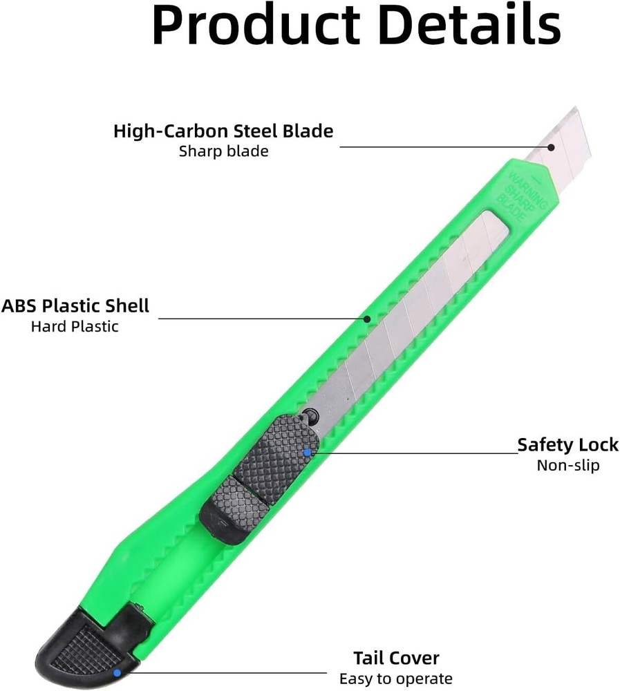 4 Pack Box Cutter Knife, 3-rd Gen Utility Knives, Razor Blade Opener, Utility Knives, Box Cutters Retractable, Small Work Knife by Htaexpu Product Description The Htaxepu Advantage: Join the 5 million+ powered by our leading technlogy Our Essential Tools: Our box cutters are suitable for all aspects of the families, offices and schools, such as artwork, cutting cardboard boxes, duct tape, letters, paper Safty and Easy: Our utility knives blade for deep exact cuts. Prevent blade slipping with the safety lock tab What You Get: 4 Pcs heavy duty retractable box cutters. The razor knife has 4 different colors among which red, yellow, blue and green. Please choose the one you prefer Our Mission: To create a better lifestyle with better products! If there is any problem in the use, feel free to get in touch with our team, we will reply you within 24 hours