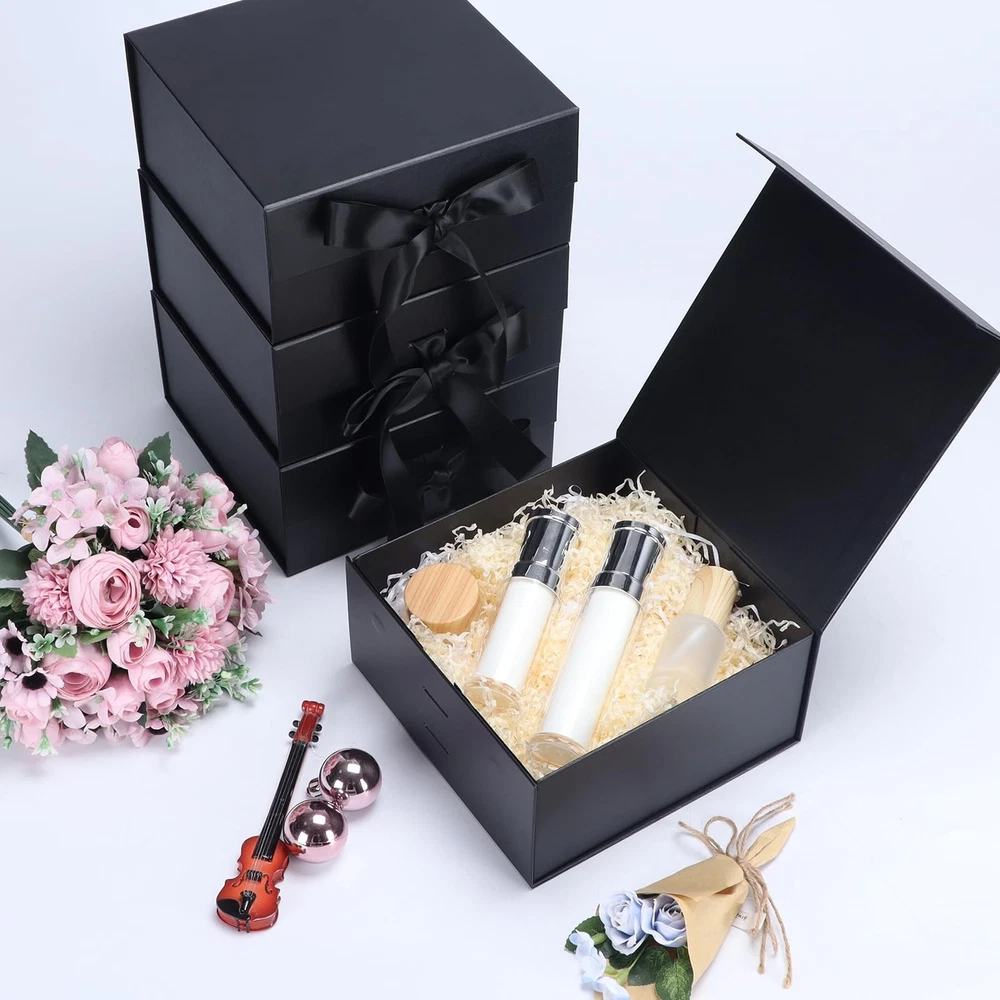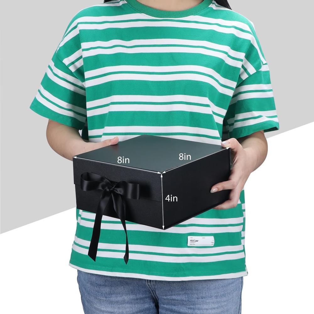 4 pack black 8x8x4 elegant and classy gift boxes with magnetic closure lids are chic, sturdy, well-made, quick and easy to assemble, and can be reused. The small black box for gifts is easy to use and is prettier than a regular cardboard box. The fine matte texture adds a touch of class to the magnetic box for gifts. The ribbon that comes with is also great as a secure closure. These affordable gift boxes have a foldable design for easy storage, transportation, and saving space, tear off the white triangle sticker to easily assemble and glue the box. Brand: Item form: Box Occasion type: Birthday