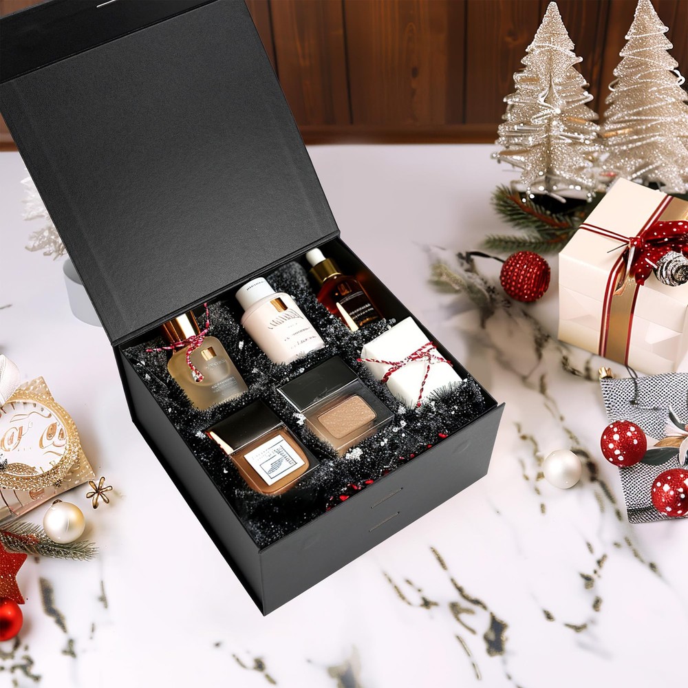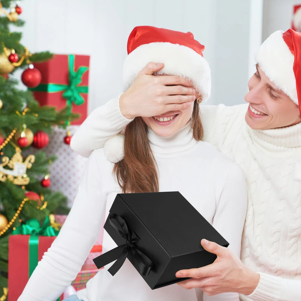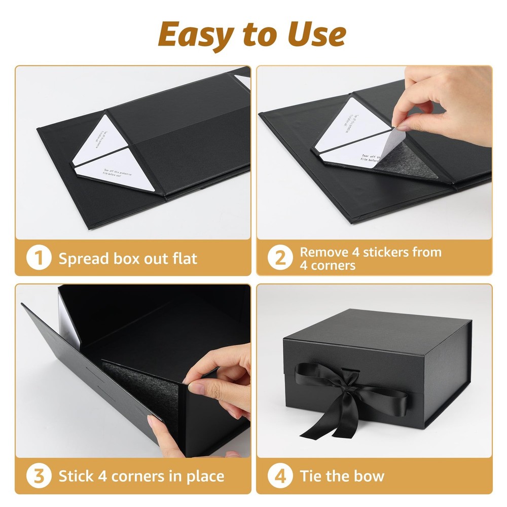 The recyclable gift box with bow, made from hard cardboard with a glossy finish, features a concealed magnetic closure for secure and easy repeated opening, suits for Christmas, bridesmaid proposal, weddings, Mother's Day, Father's Day, birthdays, Valentine's Day, anniversaries, graduations, baby showers. Magnetic boxes for gifts is easy to assemble by peeling off stickers, and comes in a set of four boxes that can hold items like crystal, wine glasses, and more. Classy Gift Boxes Bulk: The recyclable black gift box is made from hard cardboard. The glossy black finish gives the box a sophisticated appearance, elevating the presentation and adding a touch of sophistication and luxury to gift packaging. It just adds so much class to whatever gift you are giving someone Magnetic Closure: The black boxes for gifts with lids, ribbon and magnetic closure. The rectangular gift box features a concealed magnetic closure,makes the contents secure,and making the flip-top easy to open and close repeatedly Versatile Gift Box: The gift boxes with lids for presents offers elegant packaging and protection for presents suited to Christmas, bridesmaid proposal, weddings, Mother's Day, Father's Day, birthdays, Valentine's Day, anniversaries, graduations, baby showers, and beyond Easy to Assemble: The collapsible design allows for convenient storage and simple assembly. Just peel off the triangle stickers, assemble the magnetic gift box, and fasten it - tying the included ribbon into a bow is a breeze. The ribbon is a lovely finishing detail and keeps the box securely closed Size: One package contains four gift boxes with lids. Assembled boxeses outside measure: 12x9x4 inch, inside dimensions: 11.6x8.8x3.9 inch. They are thick and can hold presents like craystal, wine glass, toys, clothing, souvenirs, cosmetics, gift cards, perfume and watches and more