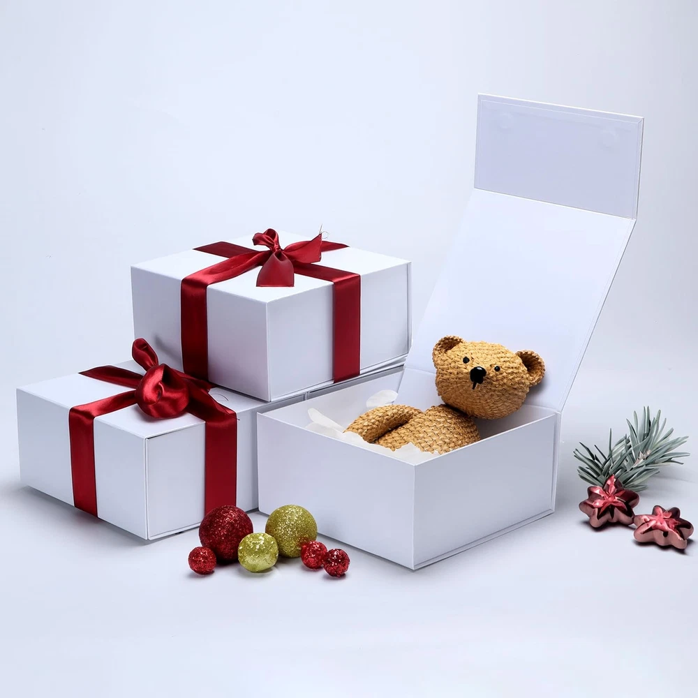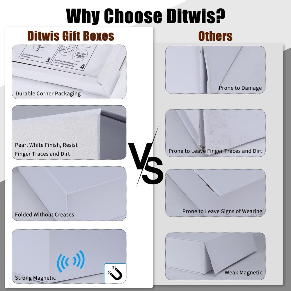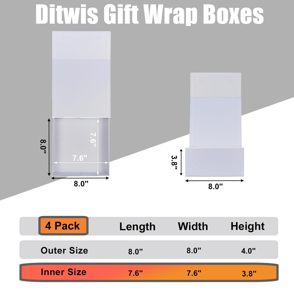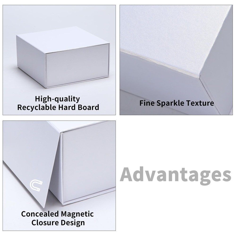 Very Elegant Classy Gift Box If you are terrible at doing gift wrapping, a gift box like this is a lifesaver No need to search for wrapping paper, ribbon, or tape. The fine sparkle texture looks very classy. Using a box like this absolutely “upgrades” any gift you are presenting. Very Elegant & Classy Gift Box: If you are terrible at doing gift wrapping, a white gift box like this is a lifesaver! No need to search for wrapping paper, ribbon, or tape. The fine sparkle texture looks very classy. Using a box like this absolutely “upgrades” any gift you are presenting. Concealed Magnetic Lid Design: Powerful magnet keeps the lid closed even after repeated usage. These gift wrap boxes are made from excellent-strength cardboard. It's waterproof and reusable. The surface of the large gift boxes can be glossy and bright just by wiping them with a cloth. Well-Made Versatile Box: Of course, you can also DIY a unique gift box according to your preferences. Suitable for weddings, birthdays, groomsmen bridesmaid proposals, Mother's Day, baby showers, and other occasions. Great Size: The 4 Pack 8x8x4 inches gift boxes with lids can hold gifts such as chocolates, cosmetics, skincare, perfumes, clothing accessories or handmade products, etc. Not just for gift-giving but also as a more lovely storage option for various office and personal items. Easy to Assemble: These white gift boxes with lids have a foldable design for easy storage, transportation, and saving space, tear off the white triangle sticker to easily assemble and glue the box.