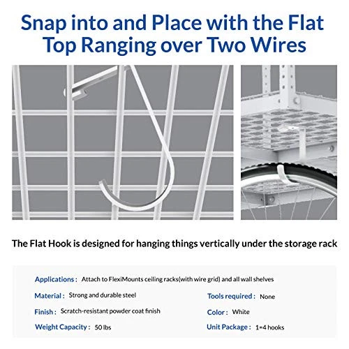 Return Policy Fast Delivery Trusted seller 4 Pack Add On Storage Flat Hook Accessory for Garage Ceiling Rack and Wall Shelving, White Product Description Specially designed for ceiling storage racks and wall shelves- Attached to ceiling racks and wall shelves to maximize your storage space No tools required Made of strong, high quality steel Scratch-resistant powder coat finish Hang bikes, tools, sporting goods, lawn chairs, and much more Shipping Returns Payment Shipping Shipping is FREE to all addresses other than APO/PO boxes in the lower 48 states. All our stock ships from US-based warehouses. Shipped via USPS or UPS (depending on location and package weight) Unless stated otherwise, all orders will ship within 24-72 hours of your payment being processed. Check our feedback to see the great reviews of FAST shipping we offer. Returns Seller does not accept returns Payment We currently accept payment via eBay managed payments only. Once payment is cleared, we will dispatch your shipment within 1-3 business days. Please refer to the "Shipping" tab for more information regarding shipping speed to your destination.