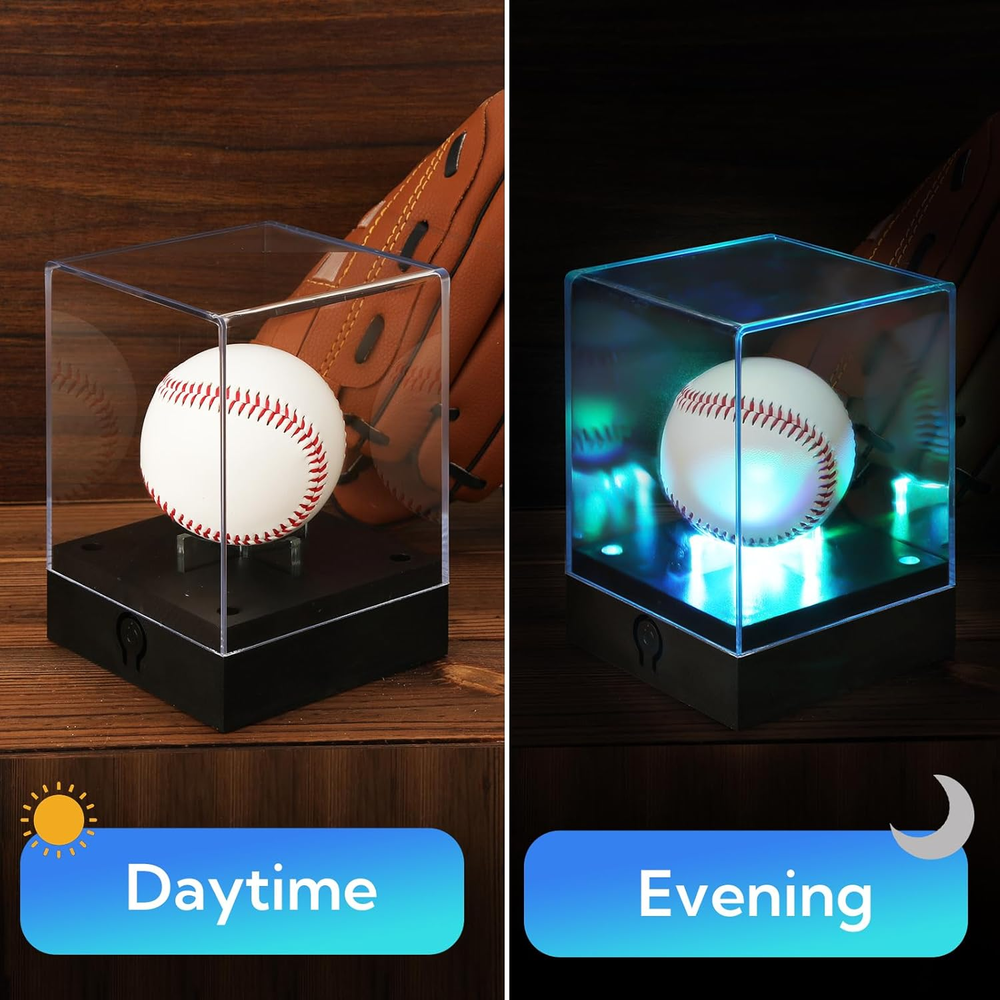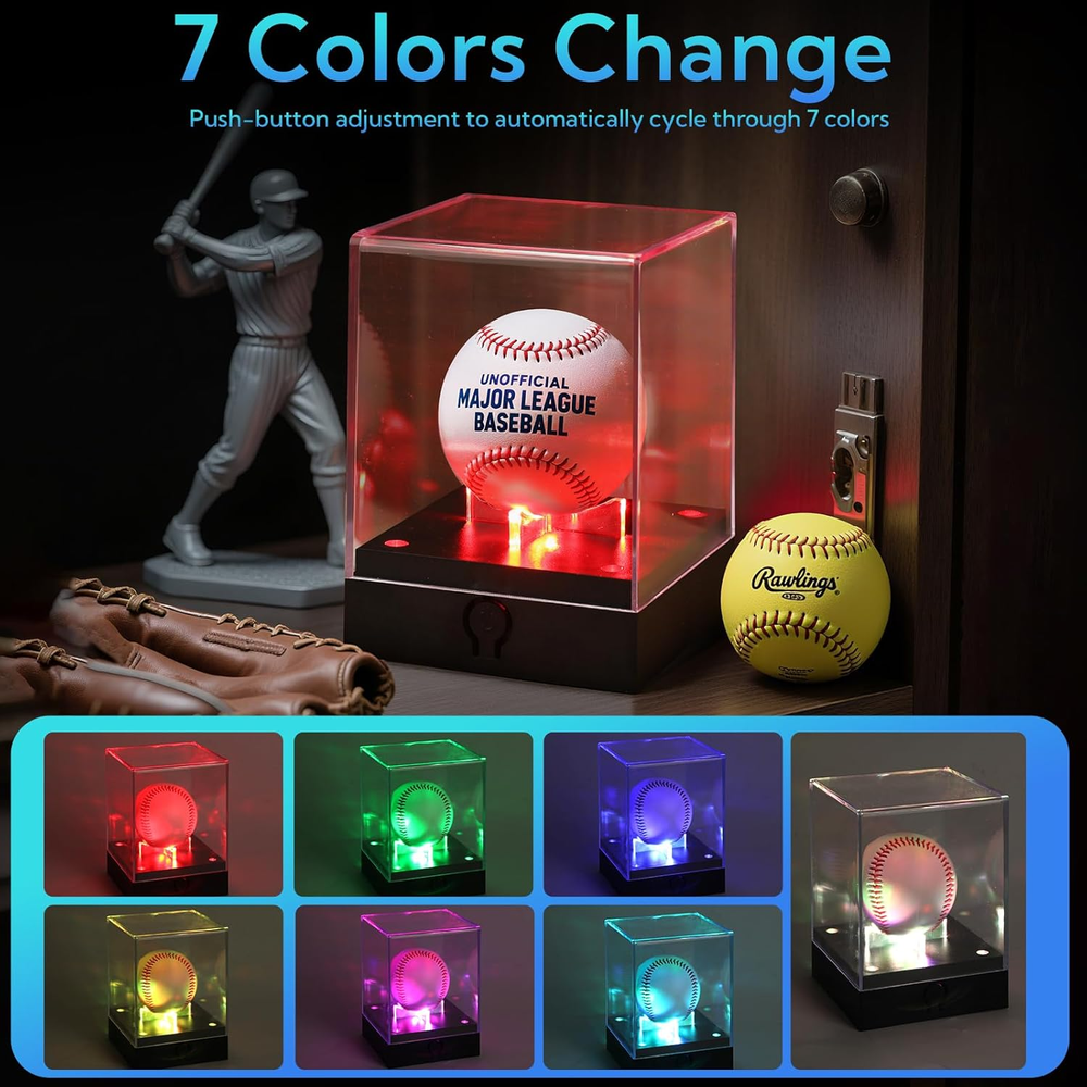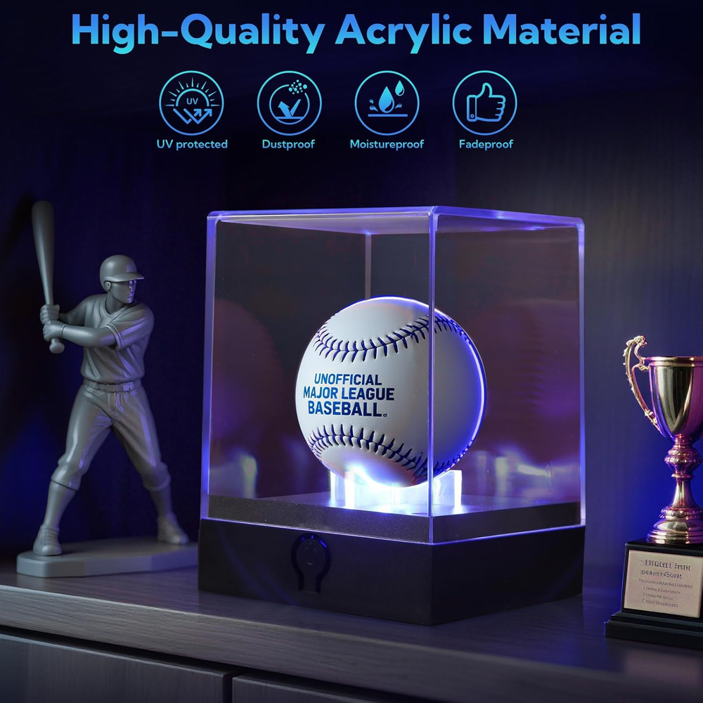 Acrylic 【 Museum-Grade UV Protection 】 Blocks 99% harmful rays to prevent autograph fading - keeps signed balls vibrant for decades unlike non-UV cases. Crystal-clear acrylic showcases every stitch detail under LED lights 【 7-Color Adjustable LED Showcase 】 Cycle static hues or dynamic color flow to match room ambiance - perfect for man caves, trophy rooms. Battery powered (3 AA ) - flexible placement anywhere 【 4X Display Power for Collections 】 Showcase signed balls, game-used softballs, championship golf balls together - ideal for multi-sport memorabilia. Stackable cubes create gallery-style exhibits 【 Pro-Grade Acrylic & Anti-Dust Seal 】 5mm thick shatterproof acrylic vs. flimsy 3mm competitors - survives bumps during fan gatherings. Tight-seal lid blocks dust from precious collectibles 【 Instant Memorabilia Gallery in 3 Mins 】 Place ball, snap lid, plug in lights - ready to impress guests. Doubles as jewelry/artifact display - versatility beats single-use holders Turn Signed Treasures into Dazzling Heirlooms - No Museum Needed! Does your signed ball collect dust in a box? Unleash the only UV-shielded display with dynamic LEDs - trusted by 1,000+ collectors to turn memorabilia into conversation centerpieces. Why Collectors Choose Us “My ’98 World Series ball FINALLY looks like a trophy!” - Coach Dave, HOF Memorabilia Club UV Defense → Stops signature fading under spotlight glare Color-Changing Drama → Cycle team colors during game nights 4 Cubes = Endless Display Magic Collection Type Pro Showcase Tip Signed Baseballs “Blue light makes ink signatures pop!” Game-Used Softballs “Green hue highlights scuff marks!” Championship Golf Balls “Rotating colors wow at country clubs!” Jewelry & Coins “Display grandpa’s watch beside his ball!” Ready to Showcase Your Legacy? 👉 [Add to Cart] - Preserve History in Style!