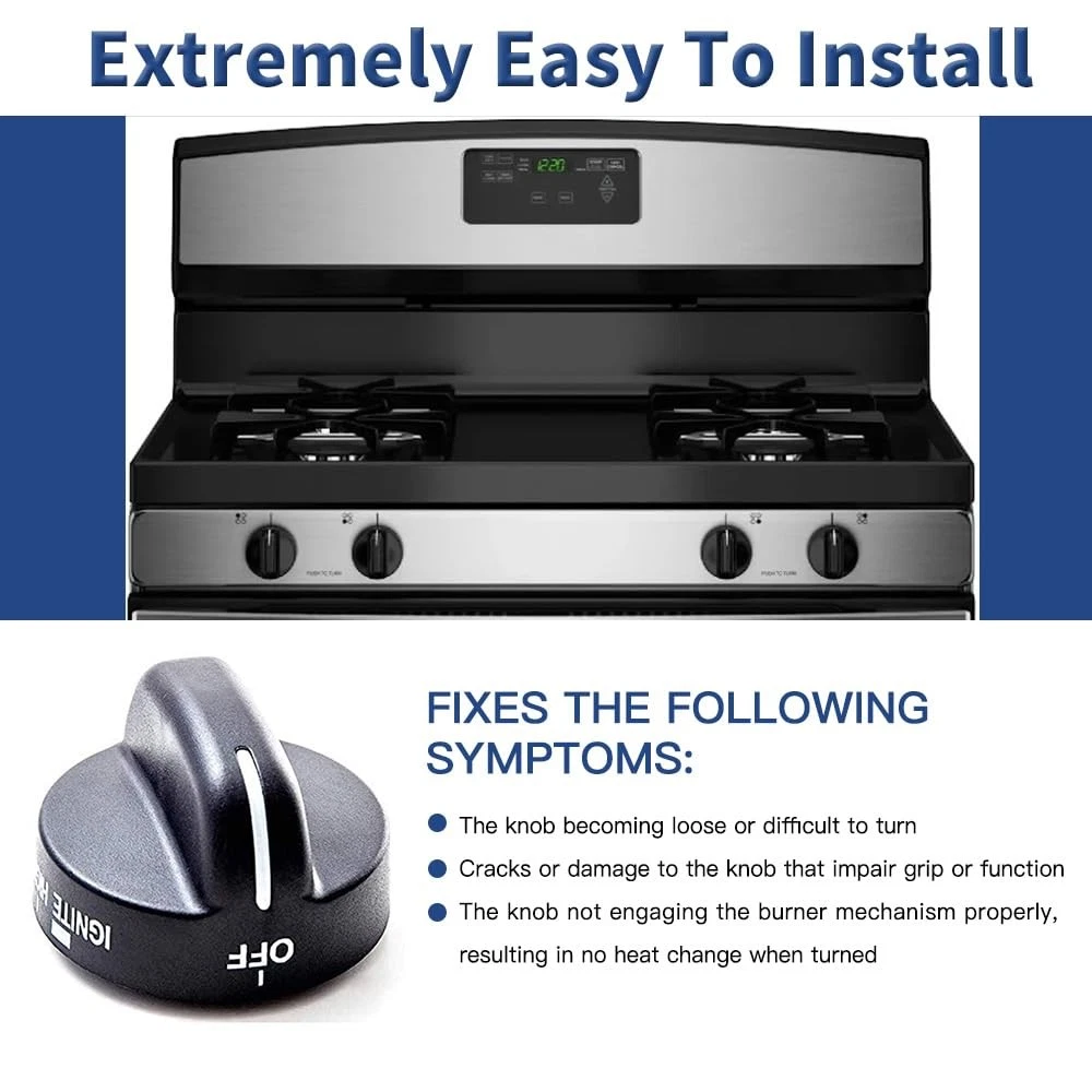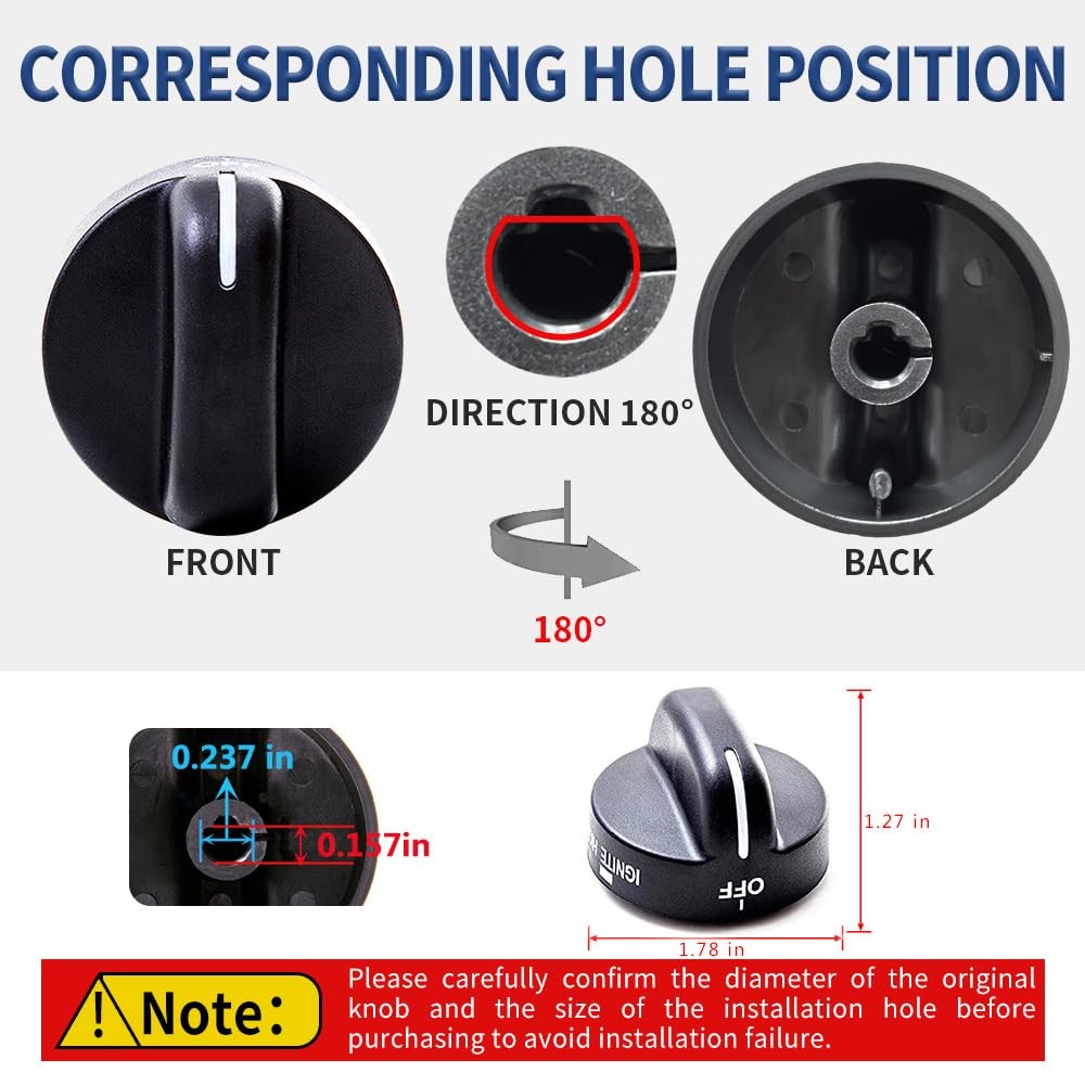 's Knobs are direct replacement for your Kitchen. This knob accepts a D-shaped shaft. No tools are required for completing repair. A stove top power burner knob, directly fit replacement for your worn, broken or missing knob. Replaces the following parts: 8273107, 8273111, PS11745570, AP6012363, AP3085376, PS393678, EAP393678, ER8273103,WP8273103, WP8273103VP Compatible brands and models include but are not limited to: TGS326MS0, TGS326MS1, TGS326MS2, etc. FGS326RD0, FGS326RD1, FGS326RD2, FGS326RD3, etc. SF368LEPQ0, SF368LEPQ1, SF368LEPQ2, SF368LEPQ3, SF368LEPB0, SF362LXTB2, SF315PEGT6, etc. AGR5630BDB0, AGR5630BDB1, AGR5630BDB2, AGR5630BDS2, AGR5630BDW0, AGR5630BDW1, AGR5630BDW2, etc. Fixes the following symptoms: 1. Selection will not set 2. Will not turn. 3. Will not stay on. Specifications: 1. Material: Plastic 2. Color: Black 3. Product Dimensions: 1.7"Φx 1.27"H (4.3 x 3.3cm) 4. Diameter of install hole: 0.24" (6mm) 5. Quantity: 4 Pcs 【Perfect Replacement】NOTE: Please carefully confirm the mounting hole size of your original knob before buying to avoid failure to install. Our 4 Pcs WP8273103 Range Burner Control Knobs Black replace part numbers: 8273103, 8273107, 8273111, 831219, AP3085376, AP6012363, ER8273103, PS11745570, PS393678, WP8273103VP. The Product Dimensions approx: 1.78''L x 1.78"W x 1.27"H. 【Widely Applicable】The Range Control Knob is compatible with various Whirlpool Gas Range Stove, models including GS395LEGB5 SF262LXSB0 SF272LXTD0 SF315PEGN5 SF325PEGN5 SF340BEHB0 SF341BEKW0 SF356BEKB0 SF357PEKB1 SF362LXSB0 SF365PEGN5 SF367LEHN5 SF368LEPB0 SF369LEPB1 SF377PEGB5 SF378LEPB0 SF379LEKB0 SF380LEPB0 SF385PEGB5 SF387LEGN5 WFG361LVB0 YSF315PEGQ6 YSF379LEKB0, etc. 【Premium Quality】Made of durable, high-quality material and well-tested by the manufacturer. Meets OEM standards. Ensure long-lasting and effective performance. 【Save Time & Money】Saves you a service fee from the appliance guy! Inexpensive way to fix or repair a cooktop/ range. Easy to install and use, no tools needed. 【Buy With Confidence】Don’t hesitate to solve your range problems easily! If you have no idea about model number or have any questions in use, we are always ready to solve your problems. High-quality products and customer service is our priority.