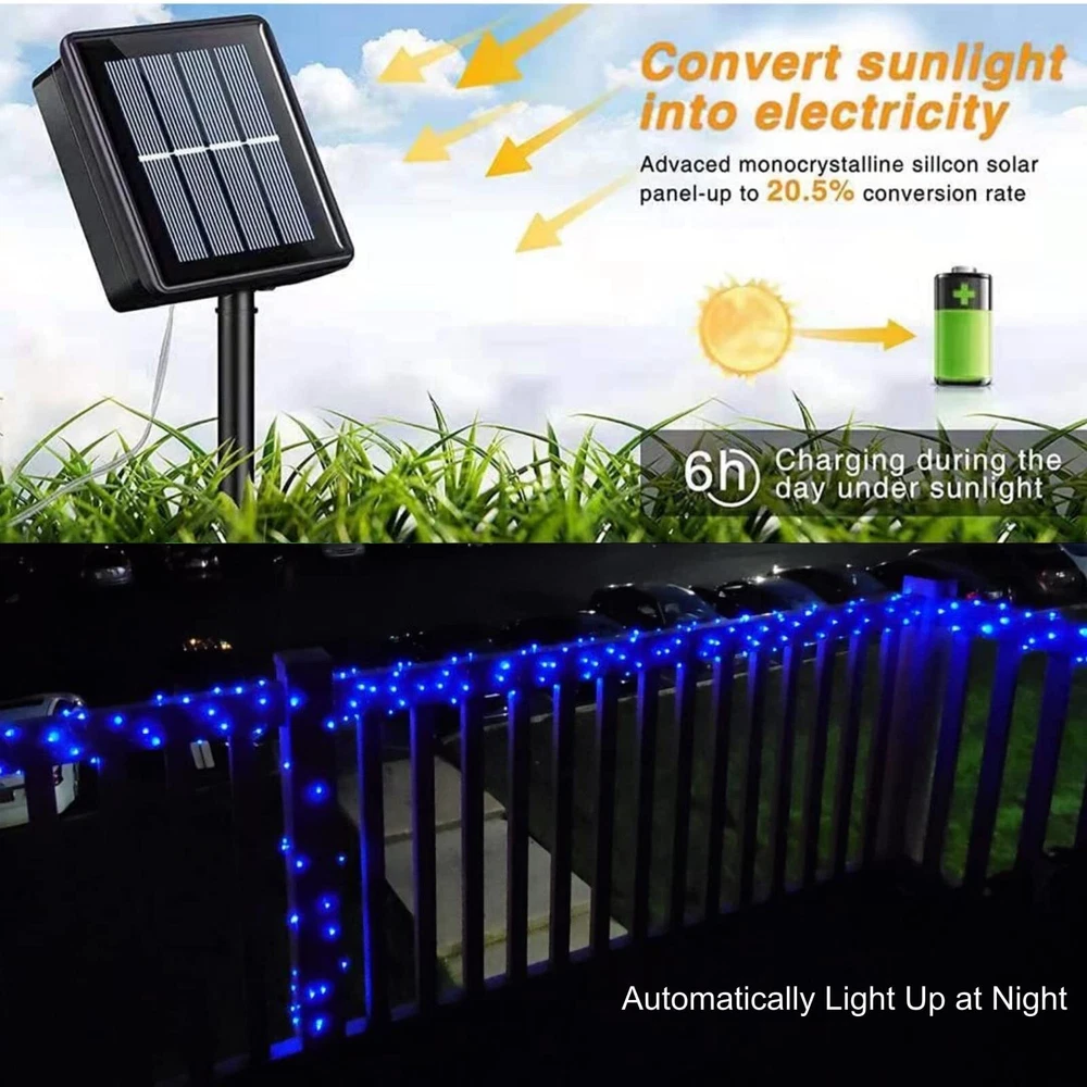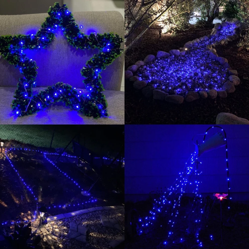 solar fairy lights 8 Impressive Lighting Modes Solar Christmas Lights: There are 8 different settings on the back of the solar panel to creates a dreamy feeling and your garden looks like a enchant fairy land at night. Blue solar christmas lights are an amazing addition to your yard, create a pleasant mood for events, parties or weddings! New Update Solar Powered Fairy Lights: Equipped with upgraded solar panel and built-in rechargeable battery, blue solar fairy lights are with up to 20.5% of energy conversion rate, which keeps christmas string lights for 10 to 12 hours after 6 hours direct sunlight charge. Outdoor solar fairy lights automatically turn on at dusk and off at dawn. Brilliant Outdoor Christmas Decor: 100 LED starry-style solar string lights with blue light accent your space with a unique, inviting glow. 33ft length is perfect to put around a garden or porch railing.Blue solar string lights the finishing touch for a back yard bbq, party, wreath, fence, patio, pools, bush, Christmas, indoor, outdoor. In the dark, the wire fades to invisible, leaving only the fairy lights, create a classy and romantic atmosphere. Flexibility & Waterproof Blue Solar Lights: You can shape flexible silver wire into a heart, wrap around tree trunks or gazebos, making twinkling bonsai/plants arrangement, added a touch of whimsy to garden. Be your designer and light up your home decoration. Both the silver wire and the solar panel of the solar copper lights are IP44 Waterproof, they are still shining bright in heavy rain and snow. What You Get: 4*100 LED blue solar fairy lights, 4*stake, 4*stand, quick and friendly customer service.Give your surrounding a whole new look with our solar lights,a hedge with several sparkling blue twinkle lights will surely attract all the eyes of passers-by,and your garden will stand out.