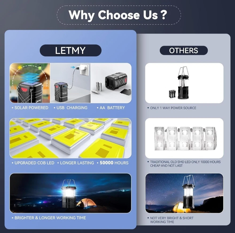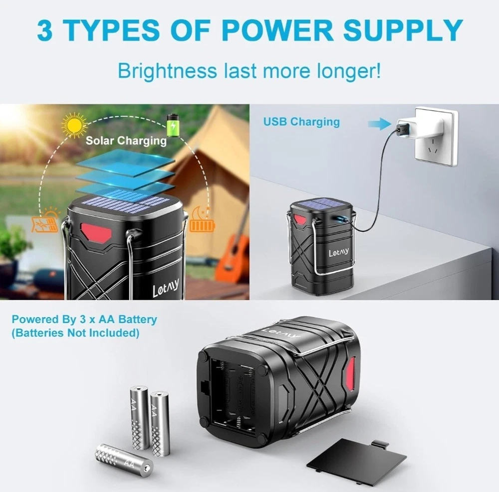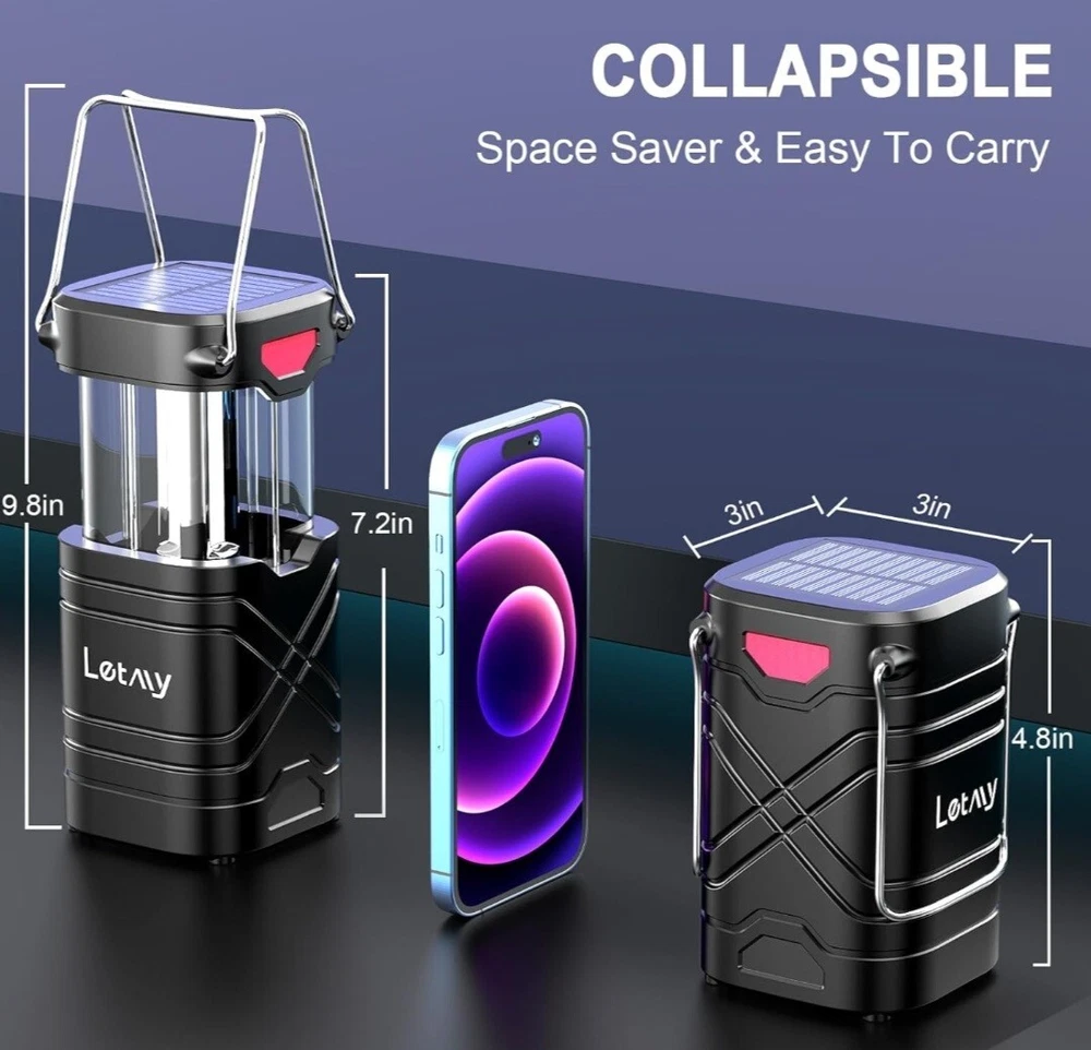 4 Pack Camping Lantern, Rechargeable LED Lanterns, Solar Lantern Battery Powered Hurricane Lantern Flashlights with 3 Powered Ways & USB Cable for Emergency, Power Outage, Hurricane Supplies Patented 3 Power Sources Design Solar/USB Rechargeable/AA Battery Powered Lantern. Our camping lantern have 3 ways power supply. With a built-in battery, you can use the included USB cable or the solar panel or 3x AA battery(AA batteries not included) to power the solar lantern. Never need worry about running out of batteries for your lanterns for power outages.This versatile solar lanterns outdoor are perfect for all adventures. (No Standalone lithium batteries are sold with the product). Ultra Bright & Long Lasting The powerful upgraded COB LED design of the rechargeable lantern offers 360-degree blazing illumination that far outshines the standard 30 LED camping lanterns. This solar camping lanterns emits 600lumens illumination, which can light up an entire room. Our rechargeable camping lights can deliver up to 12+ hours. Never leave you in sudden darkness.Perfect for any adventure, this camping lantern rechargeable is a must-have for your outdoor gear Tough & Water-resistant Lantern Flashlight Our rechargeable camping lantern is built to withstand outdoor leisure use in all weather; The lanterns for power outages are made of long-lasting military grade ABS body, no glass, shock resistant, heatproof, crashproof and water resistant. Most reliable camping lights for indoor&outdoor activities. CE/FCC/ROHs certified. This LED lantern rechargeable is an essential companion for your outdoor adventures Collapsible, Portable & Easy to Use Collapsible design makes this solar lantern camping space saving, compact and portable. Simply extend the camp lantern to turn on or adjust the brightness. When not in use, collapse and store the rechargeable lantern flashlight in your backpack or emergency survival kit. This camping lights & lanterns are ideal for any outdoor excursion or emergency situation. Replace your old, bulky lantern with one that weighs less and space saver Must Have for Home & Outdoor Every home needs such a solar camping lantern as backup. When power outages, camping, BBQs, car repairing, camping, fishing, hurricane, earthquakes, our solar camping lights can as emergency lights, hurricane supplies, camping gear or camping accessories, which is the ultimate reliable lighting accessory for home, emergency, outdoors. We provide 60 days replacement for our led lanterns for power outages Payment ●Payment must be received within 3 business days of auction closing. ●Please Note: Import duties, taxes and chargers are not included in the item price or shipping charges. These charges are the buyer's responsibility. Shipping ●Items will be shipped within 3 days after the cleared payment. All items will be checked carefully and packages in good condition. ●We will ship to ebay's address only. Please make ¬sure your address on ebay is the same with your shipping address before you pay. ●Shipping and Handling will be determined based upon the ship to address ●If you didn't receive your package, this time schedule, please do not hesitate to contact us. Within 24 hours we will try to update you with the latest tracking details of the shipment. Return and Feedback ●We sincerely hope that you can leave us a positive feedback. If, for any reason you are not satisfied with your purchase, please contact us through "Ask Seller Questions" before leaving neutral or negative feedback ●If you are not satisfied about your received item, please return it within 30 days for a refund. ●We will accept any return and give a full refund (without shipping cost) on any item. The item must be returned to us in original condition and the buyer need to pay return shipping cost