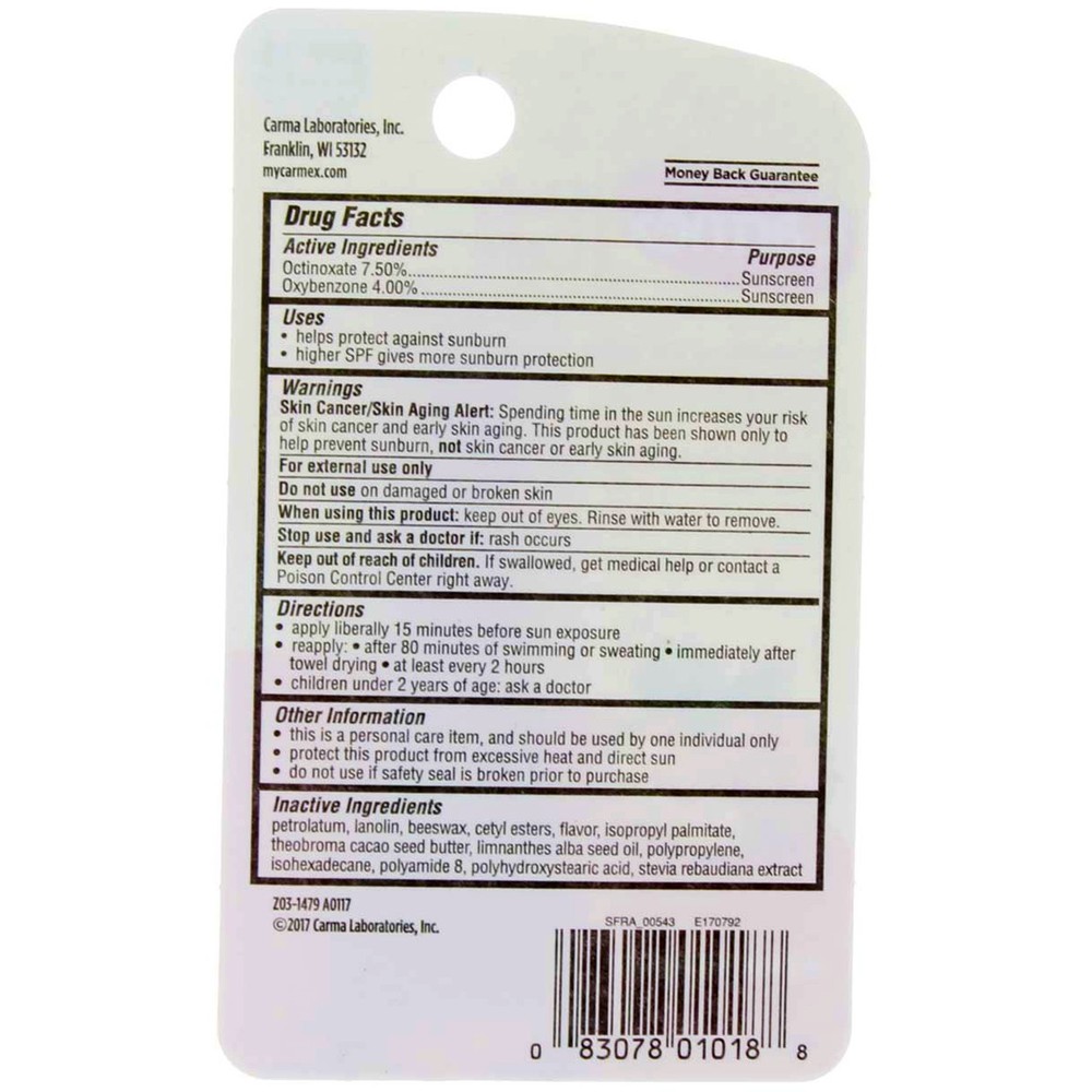 Product Description SPF 15 Sunscreen Water Resistant (80 Minutes) Moisturizing Lip Balm It Soothes. It Soothes. It Softens. Everyday Sun Protection & HydrationUses Helps protect against sunburn Higher SPF gives more sunburn protection. Smoothes, soothes and softens lips Everyday SPF 15 sun protection and water-resistant up to 80 minutes Keeps lips looking and feeling healthy with daily use Ingredients Octinoxate 7.50%, Oxybenzone 4.00%, petrolatum, lanolin, beeswax, cetyl esters, flavor, isopropyl palmitate, theobroma cacao seed butter, limnanthes alba seed oil, polypropylene, isohexadecane, polyamide 8, polyhydroxystearic acid, stevia rebaudiana extract Instructions Apply liberally 15 minutes before sun exposure Reapply: After 80 minutes of swimming or sweating Immediately after towel drying At least every 2 hours Children under 2 years: ask a doctor Product Description SPF 15 Sunscreen Water Resistant (80 Minutes) Moisturizing Lip Balm It Soothes. It Soothes. It Softens. Everyday Sun Protection & HydrationUses Helps protect against sunburn Higher SPF gives more sunburn protection. Smoothes, soothes and softens lips Everyday SPF 15 sun protection and water-resistant up to 80 minutes Keeps lips looking and feeling healthy with daily use Ingredients Octinoxate 7.50%, Oxybenzone 4.00%, petrolatum, lanolin, beeswax, cetyl esters, flavor, isopropyl palmitate, theobroma cacao seed butter, limnanthes alba seed oil, polypropylene, isohexadecane, polyamide 8, polyhydroxystearic acid, stevia rebaudiana extract Instructions Apply liberally 15 minutes before sun exposure Reapply: After 80 minutes of swimming or sweating Immediately after towel drying At least every 2 hours Children under 2 years: ask a doctor Suggested Use This is a personal care item, and should be used by one individual only Warnings This product has been shown only to help prevent sunburn, not skin cancer or early skin aging. For external use only Do not use: on damaged or broken skin. Stop use and ask a doctor if: rash occurs. When using this product: keep out of eyes. Rinse with water to remove. Keep out of reach of children. If swallowed, get medical help or contact a Poison Control Center right away. Disclaimer The product descriptions and instructions provided by vitabox.com are for informational purposes only and are qualified in their entirety by the information available from manufacturers of the products. You should carefully read all product packaging, and contact the manufacturer with any questions before using a product. While we endeavor to ensure that product descriptions are current, manufacturers sometimes change their products. We are not liable for inaccuracies or misstatements about products. We do not provide medical advice or recommendations. You should not use the information provided by vitabox.com for diagnosing or treating a health problem or disease. If you have or suspect that you have a medical problem, immediately contact your health care provider. Information and statements regarding dietary supplements have not been evaluated by the Food and Drug Administration or any other government agency and are not intended to diagnose, treat, cure, or prevent any disease.