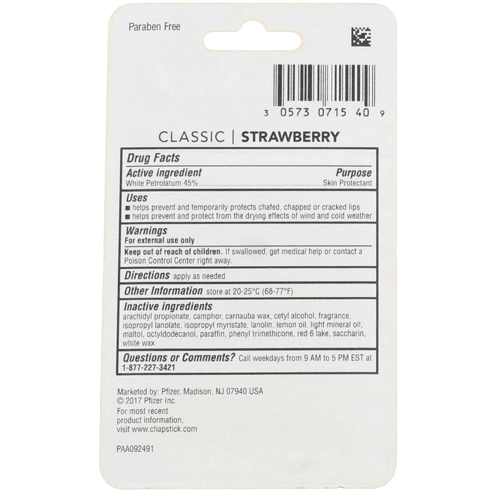 4 Pack Chapstick Classic Lip Balm, Classic Strawberry, 3 Ct, 0.15 oz Warnings Disclaimer The product descriptions and instructions provided by vitabox.com are for informational purposes only and are qualified in their entirety by the information available from manufacturers of the products. You should carefully read all product packaging, and contact the manufacturer with any questions before using a product. While we endeavor to ensure that product descriptions are current, manufacturers sometimes change their products. We are not liable for inaccuracies or misstatements about products. We do not provide medical advice or recommendations. You should not use the information provided by vitabox.com for diagnosing or treating a health problem or disease. If you have or suspect that you have a medical problem, immediately contact your health care provider. Information and statements regarding dietary supplements have not been evaluated by the Food and Drug Administration or any other government agency and are not intended to diagnose, treat, cure, or prevent any disease. Disclaimer The product descriptions and instructions provided by vitabox.com are for informational purposes only and are qualified in their entirety by the information available from manufacturers of the products. You should carefully read all product packaging, and contact the manufacturer with any questions before using a product. While we endeavor to ensure that product descriptions are current, manufacturers sometimes change their products. We are not liable for inaccuracies or misstatements about products. We do not provide medical advice or recommendations. You should not use the information provided by vitabox.com for diagnosing or treating a health problem or disease. If you have or suspect that you have a medical problem, immediately contact your health care provider. Information and statements regarding dietary supplements have not been evaluated by the Food and Drug Administration or any other government agency and are not intended to diagnose, treat, cure, or prevent any disease.