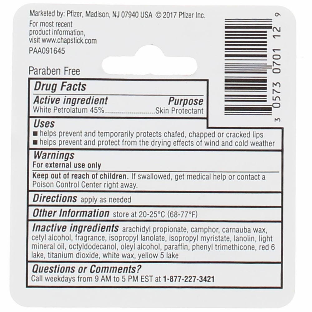 Product Description ChapStick Classic lip care goes on smoothly to soften and protect delicate lip skin. Spring, summer, winter or fall, make ChapStick lip balm a part of your daily skincare regimen for softer, smoother lips. Tuck one in your purse, backpack, desk drawer and car to keep trusted lip protection within reach. Classic ChapStick is one accessory that’s always in style. Smoothens and softens lips Helps prevent and heal dry, chapped lips 0.15 Ounce. Product Description ChapStick Classic lip care goes on smoothly to soften and protect delicate lip skin. Spring, summer, winter or fall, make ChapStick lip balm a part of your daily skincare regimen for softer, smoother lips. Tuck one in your purse, backpack, desk drawer and car to keep trusted lip protection within reach. Classic ChapStick is one accessory that‚Äôs always in style. Smoothens and softens lips Helps prevent and heal dry, chapped lips 0.15 Ounce. Suggested Use Original ChapStick is perfect for everyday use to help prevent and heal dry, chapped lips. Disclaimer The product descriptions and instructions provided by vitabox.com are for informational purposes only and are qualified in their entirety by the information available from manufacturers of the products. You should carefully read all product packaging, and contact the manufacturer with any questions before using a product. While we endeavor to ensure that product descriptions are current, manufacturers sometimes change their products. We are not liable for inaccuracies or misstatements about products. We do not provide medical advice or recommendations. You should not use the information provided by vitabox.com for diagnosing or treating a health problem or disease. If you have or suspect that you have a medical problem, immediately contact your health care provider. Information and statements regarding dietary supplements have not been evaluated by the Food and Drug Administration or any other government agency and are not intended to diagnose, treat, cure, or prevent any disease.