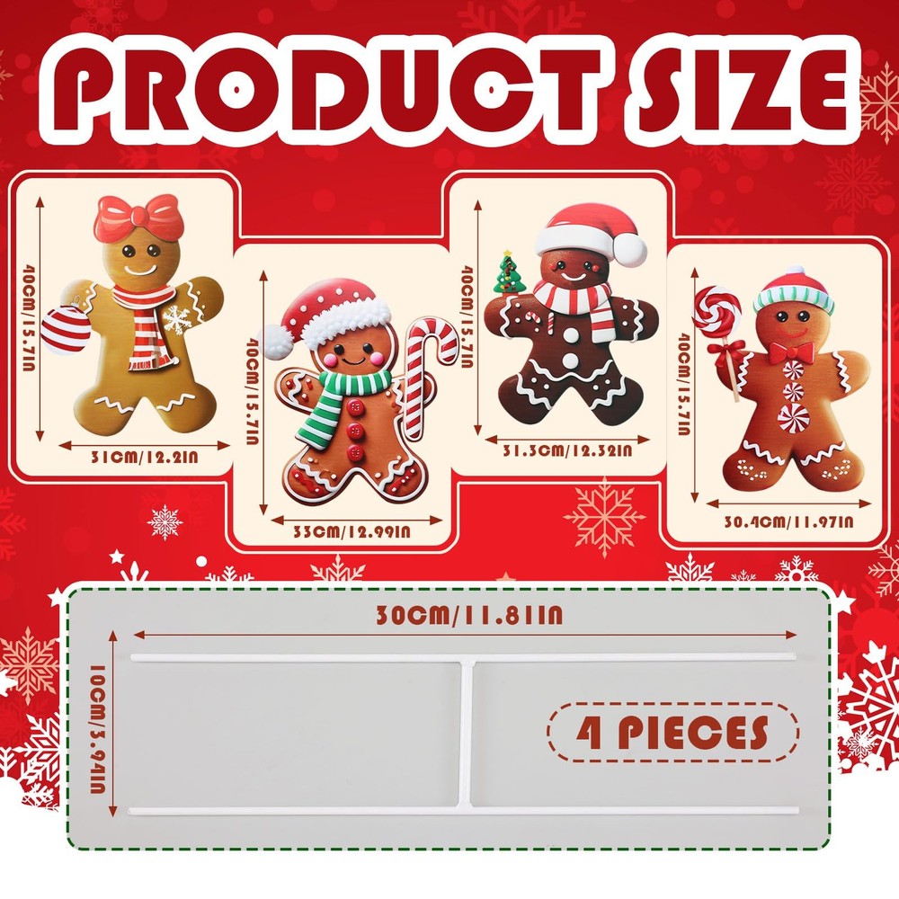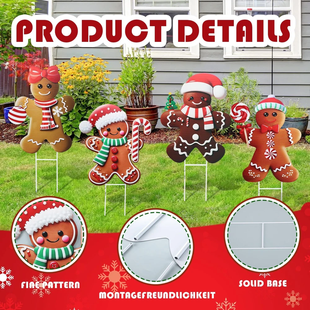 Features: Durable and Weatherproof Experience peace of mind knowing your summer yard sign is both durable and weather-resistant. Made to withstand outdoor conditions, these signs maintain their charm regardless of wind or rain, making them a reliable decor choice. Idea for Any Occasion Whether for a backyard party, a special event, or daily enjoyment, these colorful iron signs serve as the ideal decoration. Suitable for lawns, gardens, or patios, they add fun to any setting, enhancing your seasonal celebrations. Specifications: Material: metal Color: colorful Size: 15.7 inch Package includes: 4 x Christmas gingerbread yard decoration Notes: Manual measurement, please allow slight errors on size. The color may exist a slight difference due to different screen displays. What You Get: you will receive 4 pcs exquisite Christmas gingerbread metal stake, with 4 pcs H shaped stakes, they are about 12.99 x 15.75 inches/ 33 x 40 cm, large and eye catching, can decorate your yard and let everyone who passes by feel the taste of Christmas Gingerbread Man Design: our Christmas metal stakes feature a playful gingerbread design, each gingerbread man has a different depth of brown, with different Christmas hats and accessories, and the overall color uses the classic red, green and white color scheme of Christmas, adding fun and festive atmosphere to your holiday Quality That Lasts: gingerbread decorations are made of metal and finished with a durable, waterproof coating, these iron signs are designed to can be applied and preserved for a long time; Their colorful printing ensures they'll remain a vibrant addition to your outdoor decor for years to come Ideal Christmas Decoration: the colorful iron gingerbread man is an ideal decoration choice for Christmas, suitable for lawns, courtyards, balconies, gardens, entrances, parties and other special occasions, adding a lot of fun to your space Ideal Christmas Gift: if you are Looking for an ideal holiday present, our Christmas metal stakes make for a heartwarming gift that people would love; Our gingerbread metal stakes can convey the joy of the festival and share good wishes