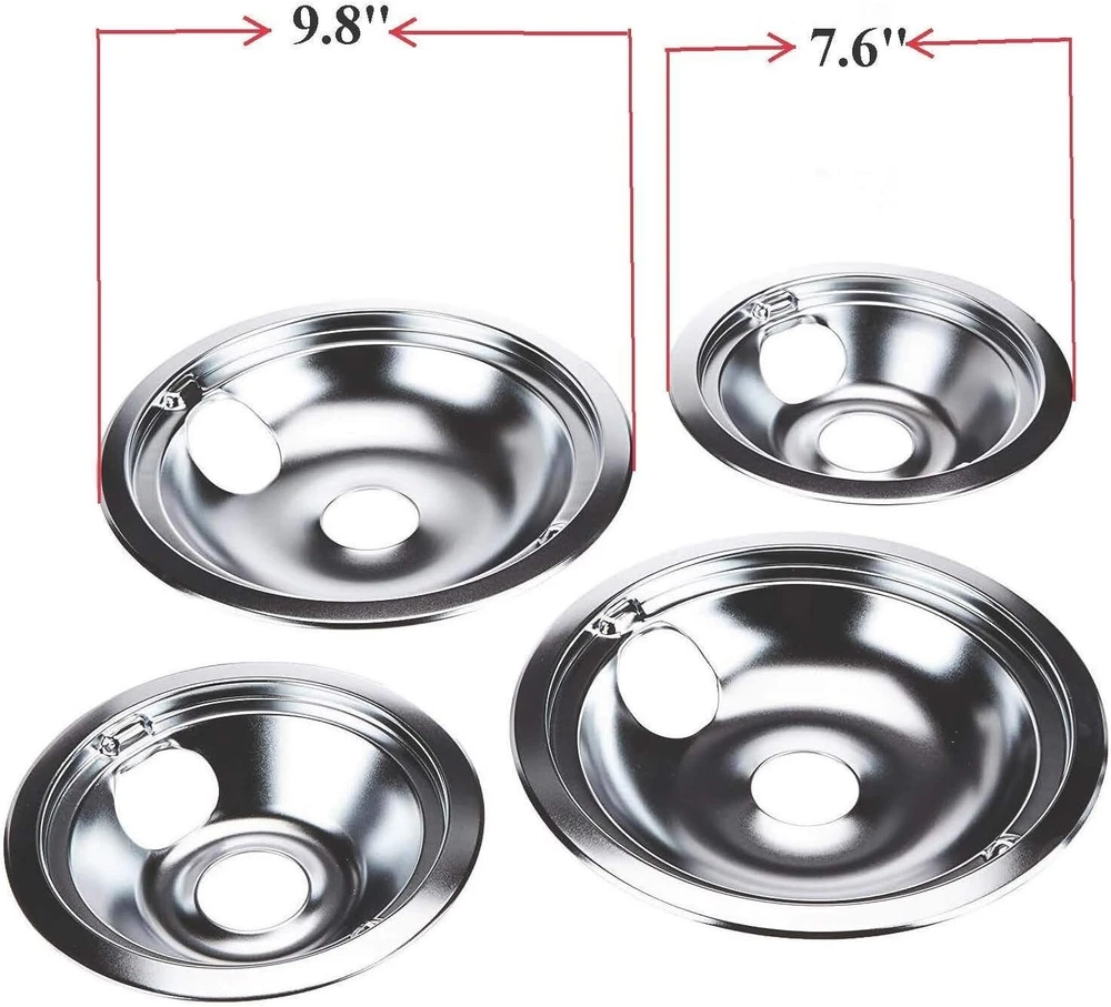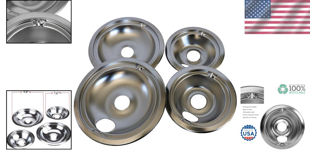 4 Pack Chrome Burner Drip Pan Bowls - 2 6-Inch & 2 8-Inch Eco-Friendly USA Made ‹ › ‹ › ‹ › ‹ › ‹ › ‹ › ‹ › ‹ › ‹ › ‹ › ‹ › 4 Pack Chrome Burner Drip Pan Bowls - Eco-Friendly USA Made Replaces GE General Electric GENF0 GE68C Product Details: Includes 2 x 6" pans (measuring 7.6") and 2 x 8" pans (measuring 9.75") 6 inch pan compatibility: WB32X5075, DP164, GE68C, WB31T10010, WB32T10008, WB32X10015 8 inch pan compatibility: WB32X5076, DP165, GE68C, WB31T10011, WB32T10009, WB32X10014 Replacement for WB31T10010 and WB31T10011 among others Features: Constructed from high-quality chrome for a stunning finish. Eco-friendly plating techniques ensure responsible manufacturing. Compatible with a wide range of electric range models, including Camco, GE, Hotpoint, Kenmore, and more. Easy to install and designed for durability. Why Choose Our Burner Drip Pan Bowls? Transform your cooking experience with our expertly crafted 4 Pack Chrome Burner Drip Pan Bowls. Designed with both functionality and aesthetics in mind, these pans are not only easy to install but also ensure your kitchen remains clean and stylish. Crafted from eco-friendly materials in the USA, you can feel good about your choice while enjoying a fabulous finish that complements any range. Upgrade your kitchen accessories with our durable and compatible drip pans - a must-have for the modern home chef. Order your 4 Pack Chrome Burner Drip Pan Bowls today and experience the difference in quality and design! Shipping Free & Fast Shipping - We offer free shipping to most of the USA with a normal delivery time of 3-7 days. However, due to the current situation, additional delivery time (up to 3 weeks) may be required for some items. Alternative Carriers - We may use alternative carriers (e.g. USPS, FedEx, UPS, etc.) to ensure your package arrives safely and on time. Due to the use of multiple carriers, we are unable to provide a tracking number automatically. Handling Time - Orders are processed and shipped within 1-2 business days of receiving cleared payment. Shipping Restrictions - Shipping to Alaska, Hawaii, Puerto Rico, Guam, and other US territories may incur shipping charges or delivery restrictions. Please contact us before ordering, or your order can be refunded/cancelled. State Restrictions - There may be restrictions based on your state of purchase. For example, certain items may not be shipped to California due to state regulations. Contact for Tracking Updates - If you require tracking updates or have any concerns about the delivery of your order, please feel free to contact us, and we will be happy to assist you. Return 30-Day Hassle-Free Returns - We want you to be completely satisfied with your purchase. If you are not, you can return the item within 30 days of receiving it for a full refund or exchange. Easy Return Process - To start a return, simply contact us and we will provide you with a prepaid return shipping label and detailed instructions. Restocking Fee - There are no restocking fees for returns. However, the buyer is responsible for return shipping costs if the return is not due to a seller's error. Refund Processing Time - Refunds will be processed within 5 business days of receiving the returned item in its condition. Payment We accept all major credit cards, PayPal, and Apple Pay for your convenience. Your payment information is secure and encrypted to ensure a safe and seamless transaction. Please complete your payment within 3 days of purchase to avoid any delays in shipping. Feedback Your feedback is extremely important to us. We strive to provide the best products and customer service possible. If you are satisfied with your purchase, please take a moment to leave us a positive review. If you have any concerns or issues with your order, please contact us before leaving negative feedback. We are committed to resolving any problems and ensuring your satisfaction. Contact Us If you have any questions or concerns, please feel free to out to our customer support team. You can contact us through the eBay messaging system. We are available Monday to Friday, 9:00 am to 5:00 pm EST, and we will do our best to respond to your inquiry within 24 hours. Buy it now and enjoy a pleasant shopping experience! Model: Burner Drip Pan Replacement Item Weight: 1.21 lb Unit Quantity: 4 Set Includes: Burner,(2) 6" Chrome Burner Drip Pan,(2) 8" Chrome Burner Drip Pan Suitable For: Cooktop Compatible Model: GE GE68C Type: Drip Pan Color: Chrome Finish: Chrome Number of Items in Set: 4 Item Depth: 2 inches Unit Type: lb
