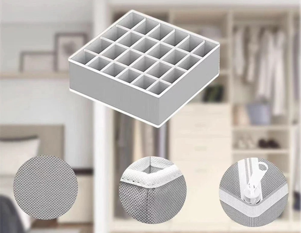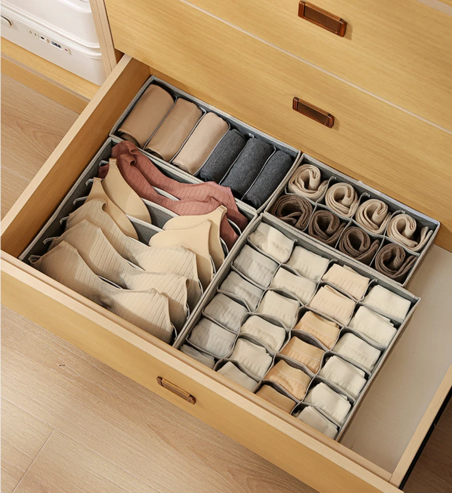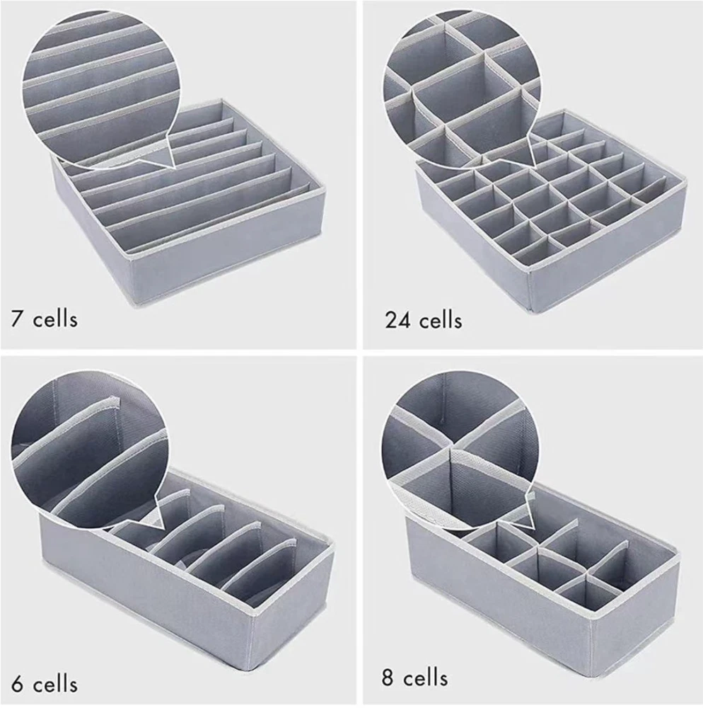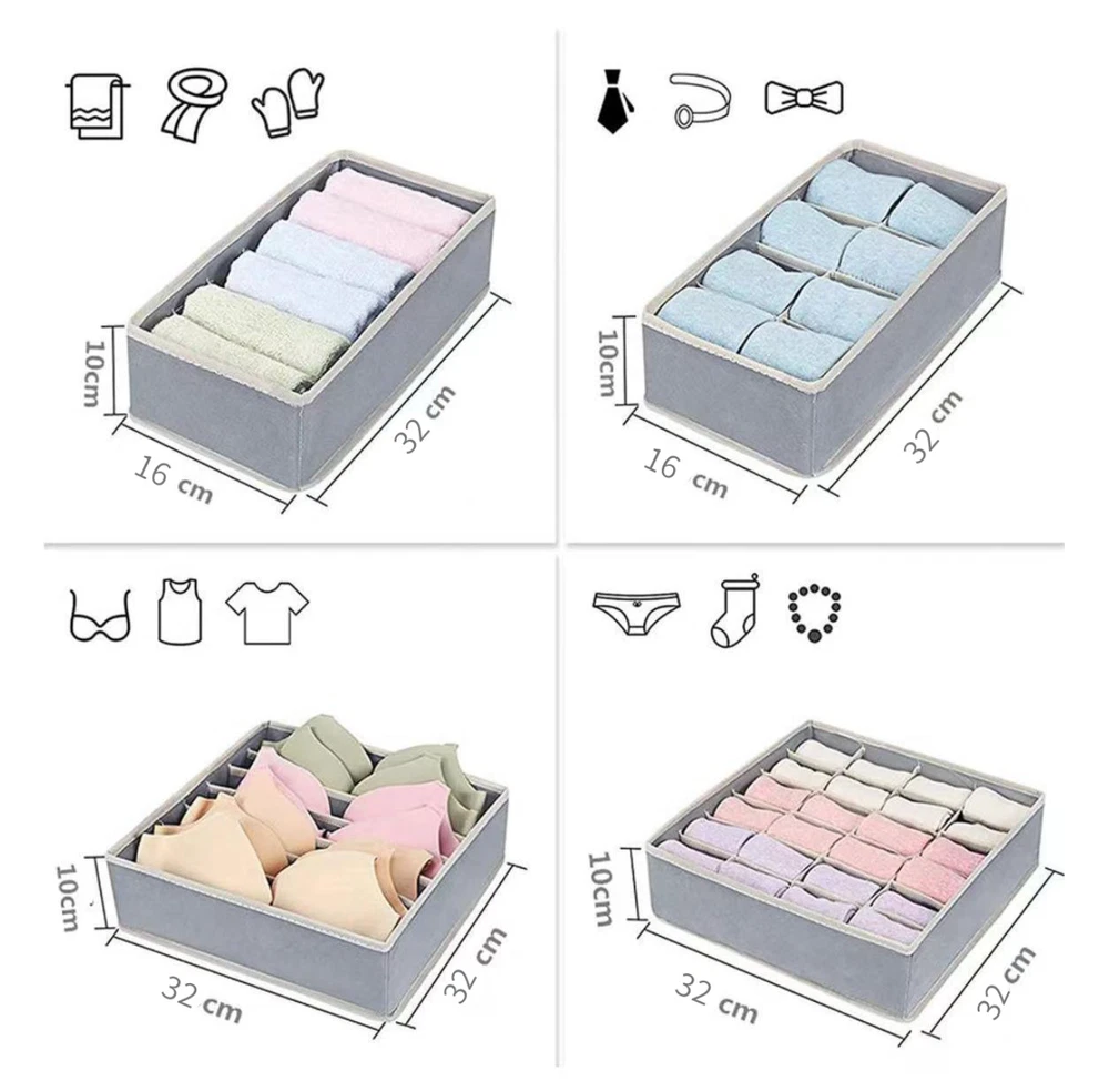 4 Packs Foldable Non-woven Drawer Organizer Dividers Fabric Storage Box Closet Dresser Organizer Cube Containers Basket Bins for Bedroom, Nursery Baby Clothes, Underwear, Bras, Socks, Panties (Grey, Set of 4) 【 4 Pack Drawer Organizer set 】 Our 4-pack drawer organizer set offers an impressive 45 compartments, perfect for various storage needs. Whether it's knee socks, men's boxer briefs, or women's leggings, this set ensures everything fits neatly. Ideal for closet organizers and storage, drawer organizer clothes, and underwear drawer organizer, it helps keep your space tidy and efficient. This is a must-have for bedroom organization, dorm room essentials, and anyone looking to streamline their storage solutions. 【 Fits All Drawers 】 Measuring 4 inches high, these dresser drawer organizers are designed to fit most dresser drawers. The set includes 4 organizer bins: One 7-cell bins for shirts or bras (12.6”x12.6”x3.94”), one 24-cell bins for socks (12.6”x12.6”x3.94”), one 8-cell bins for ties or belts (12.6”x6.3”x3.94”), and one 6-cell bins for scarves or baby clothes (12.6”x6.3”x3.94”). This versatility makes it a perfect fit for any drawer in your home, making it an excellent underwear organizer for drawer, sock drawer organizer, and clothing drawer organizer. 【 Quality Construction 】 Made of 80gsm thick non-woven fabric and reinforced stitching, our wardrobe clothes organizers are built for long-term use. The addition of 3.0mm plastic boards at the four sides ensures they are breathable, making them ideal for nursery room use. Sturdy and stackable, these bins maintain their shape and durability over time, perfect for drawer organizer for clothes, bra organizers, and fabric drawer organizers. 【 Easy to Assemble and Space-Saving 】 Lightweight and foldable, these dresser organizers can be easily assembled and stacked inside deeper drawers, doubling your storage capacity. When not in use, simply unzip and fold them flat for compact storage, freeing up space in your closet or dresser. This makes them a great choice for small drawer organizers, closet organizer drawers, and bathing suit organizers. 【 Multi-Use Storage Solution 】 These fabric bins are not only great for organizing clothing but also serve as storage drawers for hanging shelves, household supplies, makeup items, perfume, and hair accessories. Whether in the bedroom, bathroom, nursery, or office, they help keep your belongings organized and easily accessible. Perfect for underwear storage organizers, sock organizers for drawers, and nursery drawer organizers. Enhance your storage solutions with these versatile and durable organizers, ideal for any part of your home. Our 4-pack drawer organizer set offers an impressive 45 compartments, perfect for various storage needs. Whether it's knee socks, men's boxer briefs, or women's leggings, this set ensures everything fits neatly. Ideal for closet organizers and storage, drawer organizer clothes, and underwear drawer organizer, it helps keep your space tidy and efficient. This is a must-have for bedroom organization, dorm room essentials, and anyone looking to streamline their storage solutions. Measuring 4 inches high, these dresser drawer organizers are designed to fit most dresser drawers. The set includes 4 organizer bins: One 7-cell bins for shirts or bras (12.6”x12.6”x3.94”), one 24-cell bins for socks (12.6”x12.6”x3.94”), one 8-cell bins for ties or belts (12.6”x6.3”x3.94”), and one 6-cell bins for scarves or baby clothes (12.6”x6.3”x3.94”). This versatility makes it a perfect fit for any drawer in your home, making it an excellent underwear organizer for drawer, sock drawer organizer, and clothing drawer organizer. These fabric bins are not only great for organizing clothing but also serve as storage drawers for hanging shelves, household supplies, makeup items, perfume, and hair accessories. Whether in the bedroom, bathroom, nursery, or office, they help keep your belongings organized and easily accessible. Perfect for underwear storage, drawer dividers for baby clothes, and nursery drawer organizers. Features: Classified Storage, Neat and Clean: Keep different types of items separate and organized. Open and Use, Storage Does Not Take Up Space: Easy to access and doesn't clutter your space. Non-Woven Fabric Material, Good Air Permeability: Keeps items fresh and well-ventilated. Making Storage More Handy: Simplifies the process of organizing and finding items. Notes: Please allow slight size errors due to manual measurement. Color differences may occur between different screens.