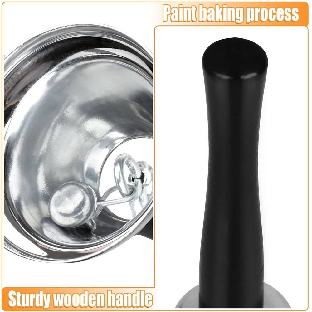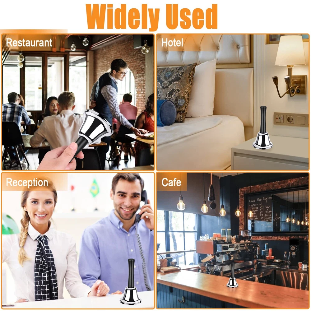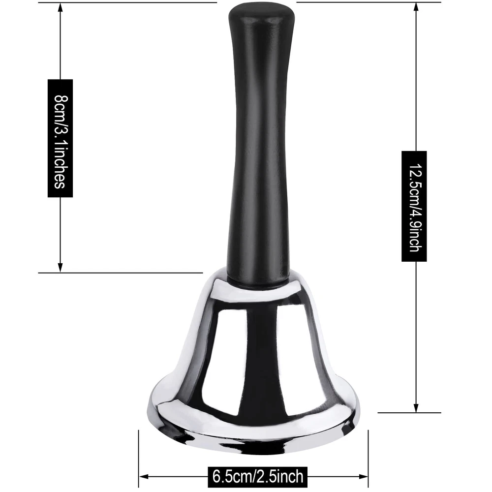 IRON-HAND BELLS: The package includes two silver steel bells. Made of high-quality iron. Electroplated and painted, shiny. Durable, rust without fading. LOUDLY&CLEAR: Our dinner bells are metal balls designed to provide a clear crisp ring. Metal balls can make a clear and loud voice that can quickly attract their attention. EASY PORTABLE: Each ringing bell measures 2.5 x 4.9 inches. This is a very convenient and lightweight bell you can bring anywhere or for use in your restaurant, hotel, store, and home environment. WIDE APPLICATION: Our dinner bell can be perfectly used in the service call, dinner, restaurant, hotel, reception, coffee shop, elderly, patient, disabled, pet bell, etc. WHAT YOU GET: 4 Pack Hand Bell (Silver), our 7*24 friendly customer service for peace of mind.
