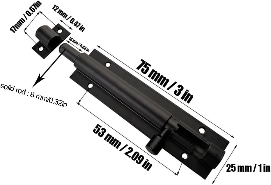4 Pack 3 Inch Barrel Bolt Lock, Heavy Duty Slide Latch Lock, Security Sliding Size -- Main Part Size (L*W*H): 3" x 1" x 0.43" ( 75 x 25 x 11mm ); Thickness: 0.05" ( 1.3mm ). Please make sure the size is your need before purchase. Aluminium Slide Bolt -- The Barrel Bolt Lock is made of high-quality aluminum alloy, this latch is durable, rust-resistant, and built to last, designed for doors, gates, and other entry points. Thickening Design -- This barrel bolt lock is designed with security in mind. Overall thickening design is stronger than the ordinary door barrel bolt, keeping you and your property safe. Easy to Install -- The sliding bolt lock comes with screws for installation, it can be used on left or right-handed doors. The latch is adjustable, so you can customize it to fit your specific door or gate. Wide Range of Application -- Our barrel bolt latch is ideal for barn doors, wooden fence, cabinets, swivel windows, garage, shutters, shed, etc.