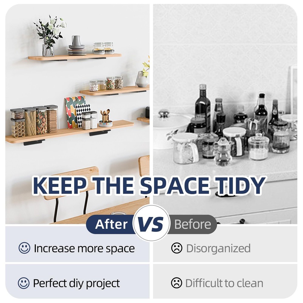 Real Hidden Brackests: These black shelf brackets have no lips and can be truly hidden. The base can be blocked by the plank, creating an amazing floating illusion. Compared with other floating shelf brackets, this bracket is easier to install Heavy Duty: This kind of metal bracket is thicker and heavier, each one has a solid weight and density. Weight capacity of 150 lbs per pair. The surface of the frosted particles has a richer texture, has anti-scratch and anti-rust functions, and can be used for life. Hardware Included: The package includes 4 supports, 16 long screws, 8 short screws and 16 anchors. The countersunk screw hole guarantees that the nut stays flush with the bracket without being obtrusive. Perfect DIY Project: Improve item storage efficiency. Make the most of your family space. Including but not limited to kitchen, bathroom, bedroom, office, warehouse. You can even use it as a cat climbing wall support. Two Installation Methods: Our floating shelf brackets can be installed upwards or downwards, and it is certain that no matter which installation method is chosen, it can be easily done.