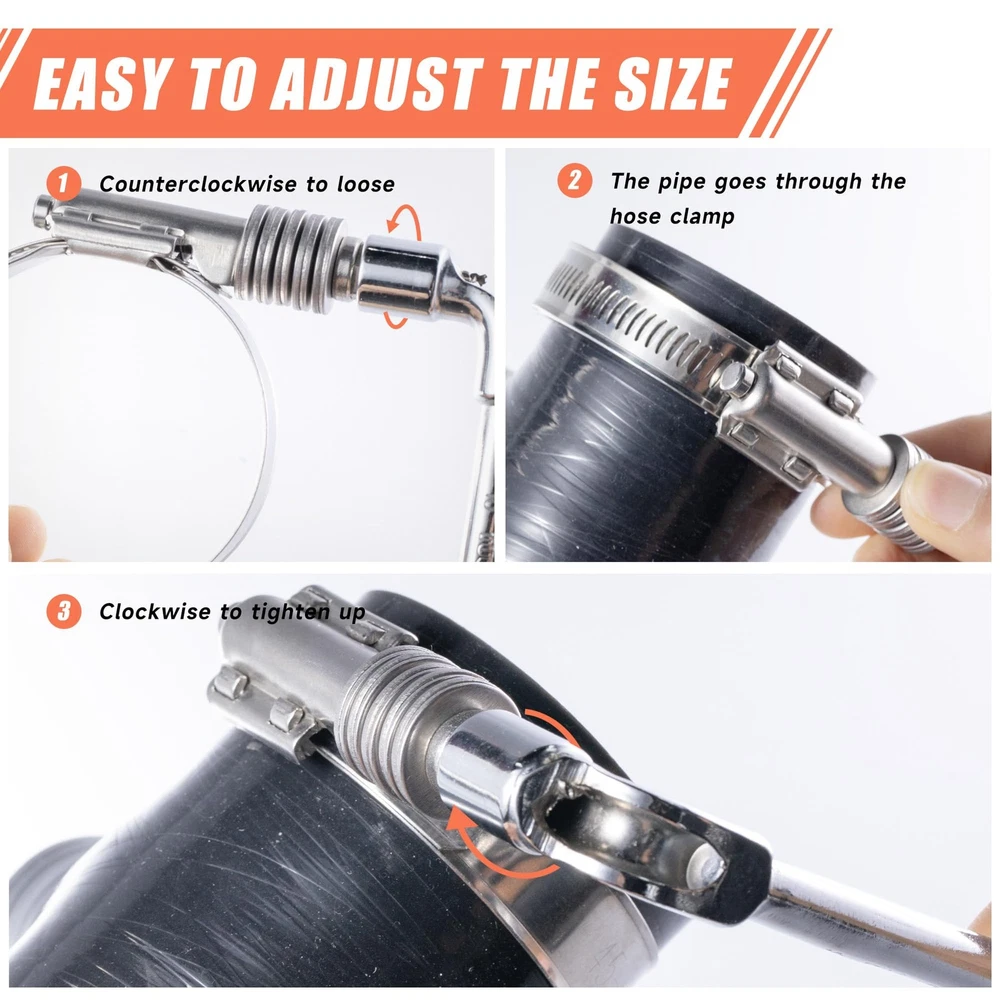 4 Pack Worm Hose Clamp, Adjustable Range 2 1/4"-3 1/8" (57-79mm) 307 Stainless Steel Worm Gear Drive Hose Clamps for Water Pipe, Plumbing, Automotive and Mechanical Application 【Hose Clamps Size】 The heavy worm hose clamp adjustable work range 2 1/4"-3 1/8" (57-79mm); Band Width: 0.62"(15.8mm); Thickness:0.03"(0.8mm);WARM TIPS: Please carefully check and measure your hose outside diameter to fit working range before purchasing our products. 【High Quality】The hose clamp is made of 304 stainless steel, which can resist corrosion and rust in the marine environment. Constant tension spring maintains clamping pressure through a wide range of temperatures. 【Exquisite Craftsmanship】The Worm Gear Drive Hose Clamps has beautiful appearance, precision polishing, and the surface is smooth and burr-free. 【Easy To Use】just use a screwdriver to loosen the screw of the hose clamp, then pass the pipe through the hose clamp and adjust the size to fit the size of the hose and tighten the screw. 【Reusable】These hose clamps are exactly what you need when repairing your house or car. They are reusable and durable, and the connection is leak-free.