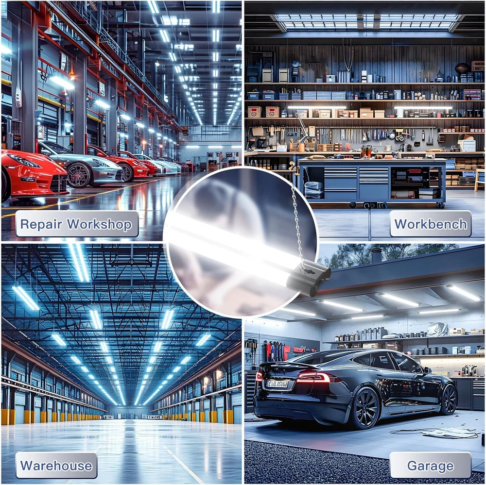 4 Pack Linkable LED Utility Shop Light, 4400 LM, Super Bright 6500K Cool Daylight, 4 FT Integrated Fixture for Garage, 40W Equivalent 250W, Surface + Suspension Mount, Black Color Black Shape Linear Material Polycarbonate (PC) Light Source Type LED Shade Material Polycarbonate (PC) Super brightness: With 4400 lumens brightness at 6500K cool daylight white, these 4ft led shop lights only consume 40W while provide the bright illumination with 250W (6 times more than conventional fluorescent lights). It is an amazing LED Efficiency of 110 lm/w, which can save the electricity expense for you. "D" shaped tube for durability: This shop lighting adopts brand new and creative "D" shaped design aiming to solve 3 major problems that customers encounter most, respectively bending tubes, dark spots and dead lights. Simple installation: Follow our installation guide for a quick and easy setup with included mounting hardware (56in Power Cord with Plug)! Directly mount to the ceiling or suspend from the ceiling for instant bright shop light in your garages, basements, warehouses, and storage area. Daisy-chain linkability: 4ft linkable led shop light can seamlessly connect up to 4 lights with plug connections for energy savings in your home, office or any workspace. Wide application: led shop lights can be applied in multiple areas, such as home garages, attics, barns, workshop, workbench, utility room, shed