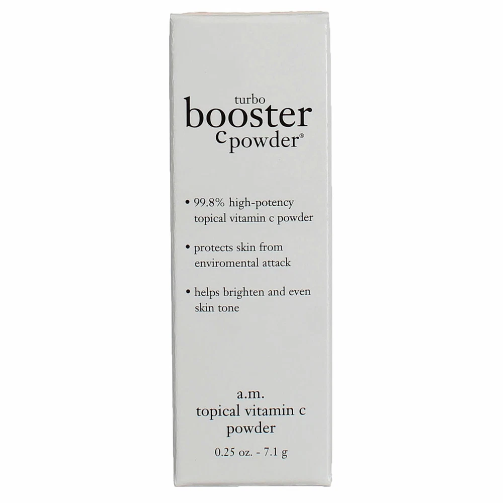 Product Description Personalize your skincare with Philosophy's new 100% topical pro-vitamin B5 powder. This waterless formula gives your skin a vitamin boost for long lasting hydration Philosophy Turbo Booster cpowd. 0.25 oz 99.8% Topical Vitamin C_powd. Helps Brighten and Even Skin TonePhilosophy Turbo Booster Vit. C powd._.25 oz Gives your skin the vitamin boost it needs to help improve the skin barrier and provide 48-hour hydration Transforms your favorite serum or moisturizer into a supercharged moisturizing 8% concentrated treatment RESULTS: Clinically proven 48-hour hydration in 100% of women after 1 application* 81% of women showed improved skin barrier function over time** *Based on a 48-hour clinical study on 31 subjects age 25-55; after single product application in a regimen test of When Hope Is Not Enough Serum **Based on a 1-week clinical study with 27 women age 25-65; once a day usage in a regimen test of When Hope Is Not Enough Serum Ingredients Ingredients: ALCOHOL, parf (frag.), AQUA (WATER), LIMONENE, ETHYLHEXYL METHOXYCINNAMATE, DIETHYLAMINO, HYDROXYBENZOYL HEXYLBENZOATE, CITRAL, CINNAMAL, LINLOOL, BHT Product Description Personalize your skincare with Philosophy's new 100% topical pro-vitamin B5 powder. This waterless formula gives your skin a vitamin boost for long lasting hydration Philosophy Turbo Booster cpowd. 0.25 oz 99.8% Topical Vitamin C_powd. Helps Brighten and Even Skin TonePhilosophy Turbo Booster Vit. C powd._.25 oz Gives your skin the vitamin boost it needs to help improve the skin barrier and provide 48-hour hydration Transforms your favorite serum or moisturizer into a supercharged moisturizing 8% concentrated treatment RESULTS: Clinically proven 48-hour hydration in 100% of women after 1 application* 81% of women showed improved skin barrier function over time** *Based on a 48-hour clinical study on 31 subjects age 25-55; after single product application in a regimen test of When Hope Is Not Enough Serum **Based on a 1-week clinical study with 27 women age 25-65; once a day usage in a regimen test of When Hope Is Not Enough Serum Ingredients Ingredients: ALCOHOL, parf (frag.), AQUA (WATER), LIMONENE, ETHYLHEXYL METHOXYCINNAMATE, DIETHYLAMINO, HYDROXYBENZOYL HEXYLBENZOATE, CITRAL, CINNAMAL, LINLOOL, BHT Suggested Use HOW TO USE: Scoop, mix, apply; it's that simple Mix fresh daily; combine 1 scoop in the palm of your hand with your water-based moisturizer or serum in the AM, then store in a cool, dry place Disclaimer The product descriptions and instructions provided by vitabox.com are for informational purposes only and are qualified in their entirety by the information available from manufacturers of the products. You should carefully read all product packaging, and contact the manufacturer with any questions before using a product. While we endeavor to ensure that product descriptions are current, manufacturers sometimes change their products. We are not liable for inaccuracies or misstatements about products. We do not provide medical advice or recommendations. You should not use the information provided by vitabox.com for diagnosing or treating a health problem or disease. If you have or suspect that you have a medical problem, immediately contact your health care provider. Information and statements regarding dietary supplements have not been evaluated by the Food and Drug Administration or any other government agency and are not intended to diagnose, treat, cure, or prevent any disease.