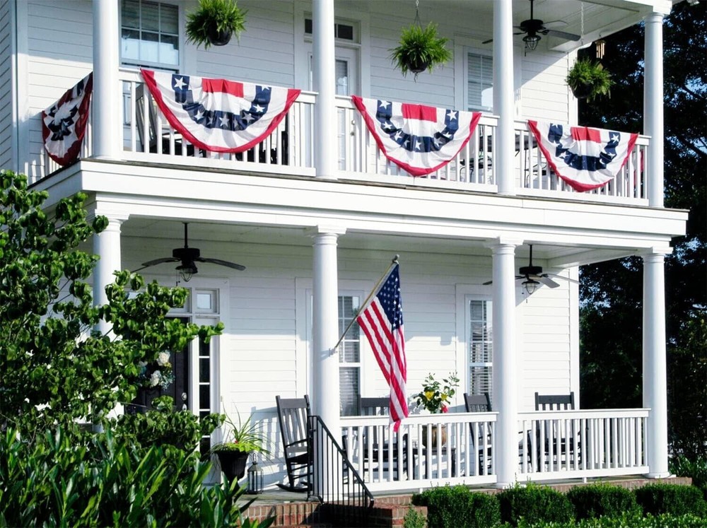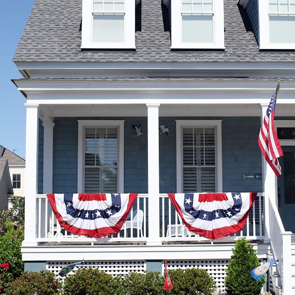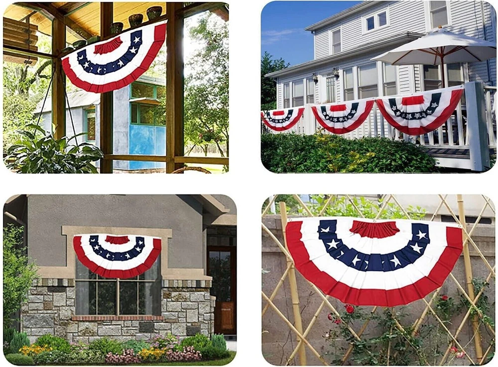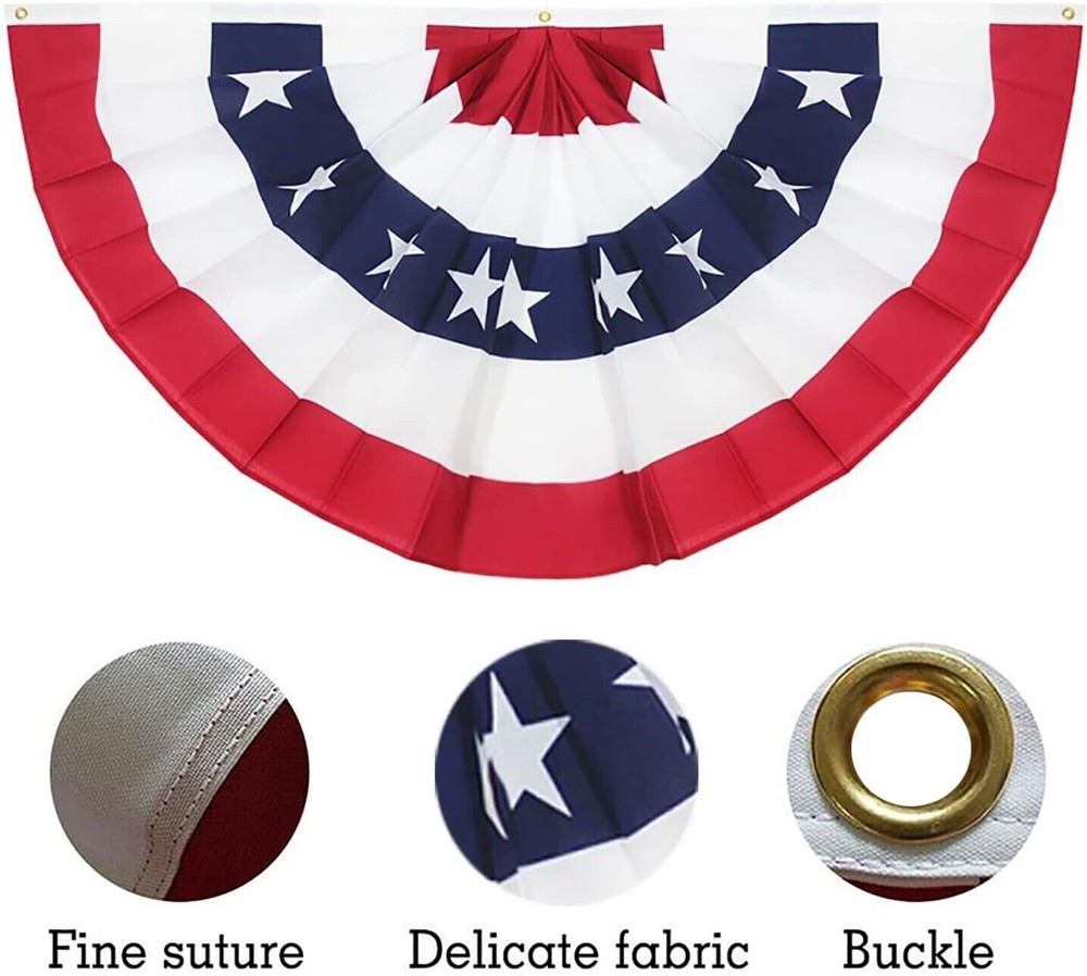 REAL FABRIC WITH REAL PLEATS. BEWARE OF PLASTIC PRINTED BUNTINGS WITH MAKE BELIEVE PRINTED PLEATS READ THE FEEDBACKS BEFORE YOU BUY. EXQUISITE WORKMANSHIP: The American bunting banner is crafted with double-line crimping and back stitch reinforcement. Enhanced with thicker metal buttonholes, this design ensures the pleated fan flag stays intact, resisting line removal or edge loosening, thereby extending its lifespan. EXCEPTIONAL DURABILITY: With vibrant, sharp colors achieved through screen printing technology, this flag boasts excellent fastness and fade resistance, making it ideal for outdoor display. EXPRESS YOUR NATIONAL PRIDE: Featuring typical American flag elements, this banner enhances the festive atmosphere of any party and is a proud display of love for the country. ELEGANT DECORATION: Equipped with 3 brass grommets for effortless hanging, it’s perfect for decorating awnings, front porches, fireplace railings, and more. A splendid choice for gardens, porches, offices, indoors or outdoors. VERSATILE USE: This flag is perfect for various national celebrations, including Independence Day, Memorial Day, Flag Day, Armed Forces Day, and Presidential Elections. It's also a great addition to everyday settings, reflecting a continuous spirit of patriotism.