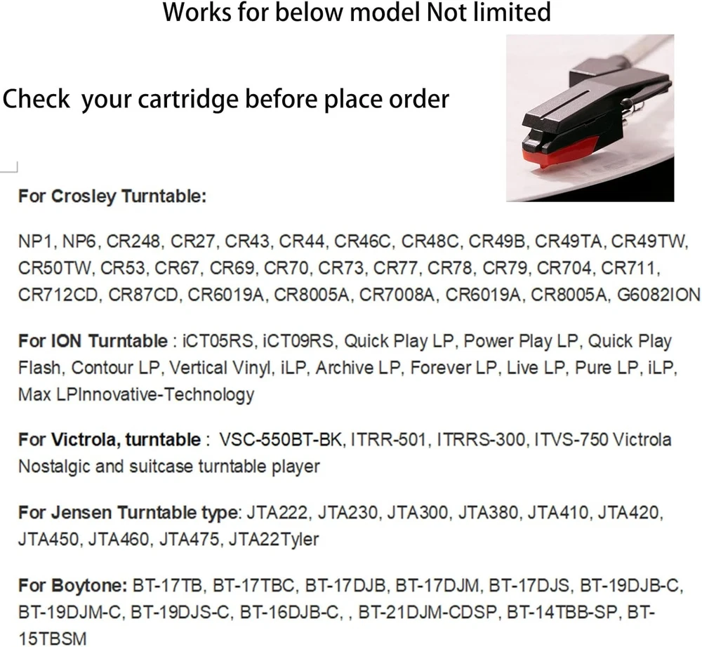 4 Pack Ruby Record Player Needle Turntable Stylus Replacement for ION Red Product Details Package Dimensions: 2.56 x 2.52 x 0.75 inches Item Weight: 1.12 ounces Item model number: 43528-39555 Is Discontinued By Manufacturer: No Manufacturer: Ywhomal Brand: Ywhomal Connectivity Technology: RCA Maximum Rotational Speed: 78 RPM Included Components: 4 Turntable Needles Special Feature: Ceramic turntable needle, ION Record Player Needle Turntable Stylus Material: Acrylonitrile Butadiene Styrene Item Weight: 0.07 Pounds Style: Retro Color: Red Compatible Devices: Speaker 1: Ruby Ceramic Record player needle: Compatible with most record player in the markets now. like:Crosley,ION,Victrola,1byone,Jenson,Innovative-Technology, Boytone, TechPlay,Capehart and more If you do not confirm fitting with your turntable, you can contact with us first. 2: Easy to Install: No tools required, you can install the record needle easily by your hand. Plays 33 1/3, 45, 78PRM records player. 3.Upgraded Material: High-Grade ABS Plastic and Aluminum arm,With conical diamond Ceramic needle design for long playing life and great rendition of voice and music. 4: High Sound Quality: Strong tracking ability. Channel balance (at 1kHz): below 2 dB : Two-channel (stereo) , Step up cartridge, with an conical stylus, giving better bass response and greater realism. 5: Well Packed Turntable Needle Stylus: Protective form protect turntable needle from damaged ,Check your turntable cartridge first before order..