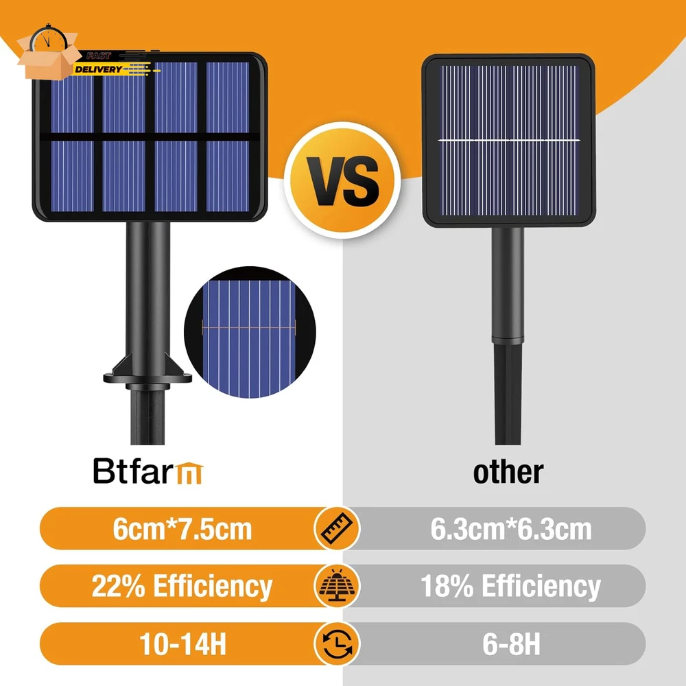 Store New Arrivals Add to Favorite View Feedback Contact 4 Pack Solar String Lights Outdoor - 320LED 132FT Solar Fairy Lights Waterproof 8 Modes, Copper Wire Solar Powered Twinkle Lights for outside Tree Garden Christmas Wedding Party Decor (Warm White) Description Item model number SL24 Light Source Type LED Style Modern Number of Items 4 Power Source Solar Powered Number of Light Sources 320 Control Method Touch Theme Christmas, Thanksgiving, outdoors garden Wedding Party Yard Style Number SL24 Controller Type Button Control Wireless Communication Technology NO Occasion Type Engagement, Christmas, New Year, Wedding, Congratulations, Thanksgiving Seasons Autumn, Winter, Summer, All Seasons, Spring Additional Features Energy Efficient, Twinkling, Automatic On-Off, Timer, 8 lighting modes,memory function, auto on/off, IP65 waterproof rate, 2 in 1 install ways. Package Dimensions 12.91 x 9.02 x 0.71 inches; 0.32 ounces Indoor/Outdoor Usage Outdoor Material Type Copper Light Color warm white Water Resistance Level Waterproof Item Weight 8.98 g Occasion Engagement, Christmas, New Year, Wedding, Congratulations, Thanksgiving Special Feature function(f) {var _np=(window.P._namespace("DetailPageProductOverviewTemplatesJava"));if(_np.guardFatal){_np.guardFatal(f)(_np);}else{f(_np);}}(function(P) { P.when('A').execute(function(A){ A.on('a:truncate:po-attribute-truncate-3:updated', function(data) { var isTruncated = !data.truncateInstance.getIfTextFits(); var seeMoreElement = document.getElementById('po-attribute-see-more-id-3'); if(seeMoreElement) { seeMoreElement.style.display = isTruncated ? '' : 'none'; } }) }); })); Energy Efficient, Twinkling, Automatic On-Off, Timer, 8 lighting modes,memory function, auto on/off, IP65 waterproof rate, 2 in 1 install ways. See more Color Temperature 2700 Kelvin Color Warm White Indoor Outdoor Usage Outdoor Included Components Batteries included Style Name Modern Size 4 Pack 4 Packs Solar String Lights for Outside: Each Ultra-Bright twinkle lights solar with 80 LED 33 FT (26.5 ft light string +6.5 ft lead wire), total 320 LED 132 FT. Enough length and lights to increase the decorative range, to meet your different embellish needs Waterproof Design for All Weather: Light string and solar panel are IP65 waterproof to withstand any weather, either rain, sun, or snow. Safe for outdoor use, Don't worry about short circuits or bad weather damage (can't soak in water). Emit a warm white light after rain, romantic and beautify the yard 8 Modes and Memory Function: 8 Lighting modes of diversified decorate: combination, in waves, sequential, slow glow, chasing, slow fade, flash, steady on. You can choose your favourite mode, add distinction to holiday and life! Built-in memory function will save last mode settings, no need to reset again every day(The mode will reset if the light string is manually turned off) Widely Used for Your House: btfarm Outdoor led fairy lights like stars, creating a cheerful mysterious decorative effect, suitable for various occasions and seasons. Perfect Decoration for yard, wedding, xmas, holiday, bush ornament and so on, bringing the finishing touch to the backyard High Efficiency and Auto ON/OFF: Larger size of the new solar panel translates to a greater surface area for capturing sunlight. Solar power tree wrap lights charge during the day and light up automatically at night. After charging in direct sunlight for 6-8 hours and can lasting for 10-14 hours. Make sure you press the on/off button before charging Product Description Btfarm Upgraded Outdoor Solar String Lights Waterproof - Your Best Decorative Choice 4 Pack solar fairy string lights total 320LED 132FT, each 80LED 33FT (26.5ft light string +6.5ft lead wire), come with 8 lighting modes, waterproof, auto on/off, memory function, glows with a 2700K warm white light in the dark/evening and creates a romantic, magical, elegant, and fun environment. Decorate for outdoors, Christmas, trees trunk, lawn, wedding, garden, party, New Year, holiday, etc. 8 lighting modes add fun and variegation, easily meet the different needs of Christmas, weddings, birthdays, party, Thanksgivings, halloween, holidays. New Upgraded Solar Panel-Improved Charging Efficiency Btfarm solar panels are equipped with more busbars (wires) that enable efficient current collection and transmission, reducing power loss and maximizing charging efficiency. The upgraded solar panels can reach an output of 2V 280mA, while other twinkle lights solar are only 1.2V 100mA. Coupled with an 800mAh high-capacity battery, our solar lights weatherproof only need 6-8 hours charging time to work for 8-14 hours. Wrap Around and Lighten Trees Soft wire can easily be wound around a tree trunk or a pavilion; In the dark, each LED emits bright lights to romanticize your yard and garden. IP65 Waterproof Design The solar string lights and solar panels are water proof, which makes it able to withstand all kinds of bad weather, such as rain, snow, wind and frost, high temperature, etc. Safe to Touch & Easy to DIY The outdoor fairy lights waterproof are made of durable copper wire that can be bent and folded into any shape you like. The lamp bead is safe voltage and can be safely touched. Multi-scene Decoration These solar lights for outside are perfect for outdoor spaces such as patio, garden and yard, but are versatile enough to enhance indoor décor as well.These solar-powered fairy lights from Btfarm are a great investment to add a touch of magic to your surroundings, both in terms of value and aesthetics. FAQ: Q:1. Why solar string lights are not light up? A: The solar tree lights should tear the film of the solar panel before first use, then turn on the switch and fully charge in direct sunlight for at least 8 hours. Q: 2. Why has the solar string light been charged for several hours, and the lighting time is still short? A: The solar panel should be placed in a place without shade to get maximum sunlight during daylight. The charging a