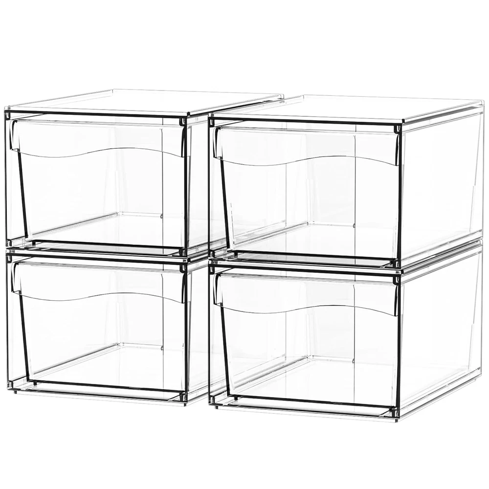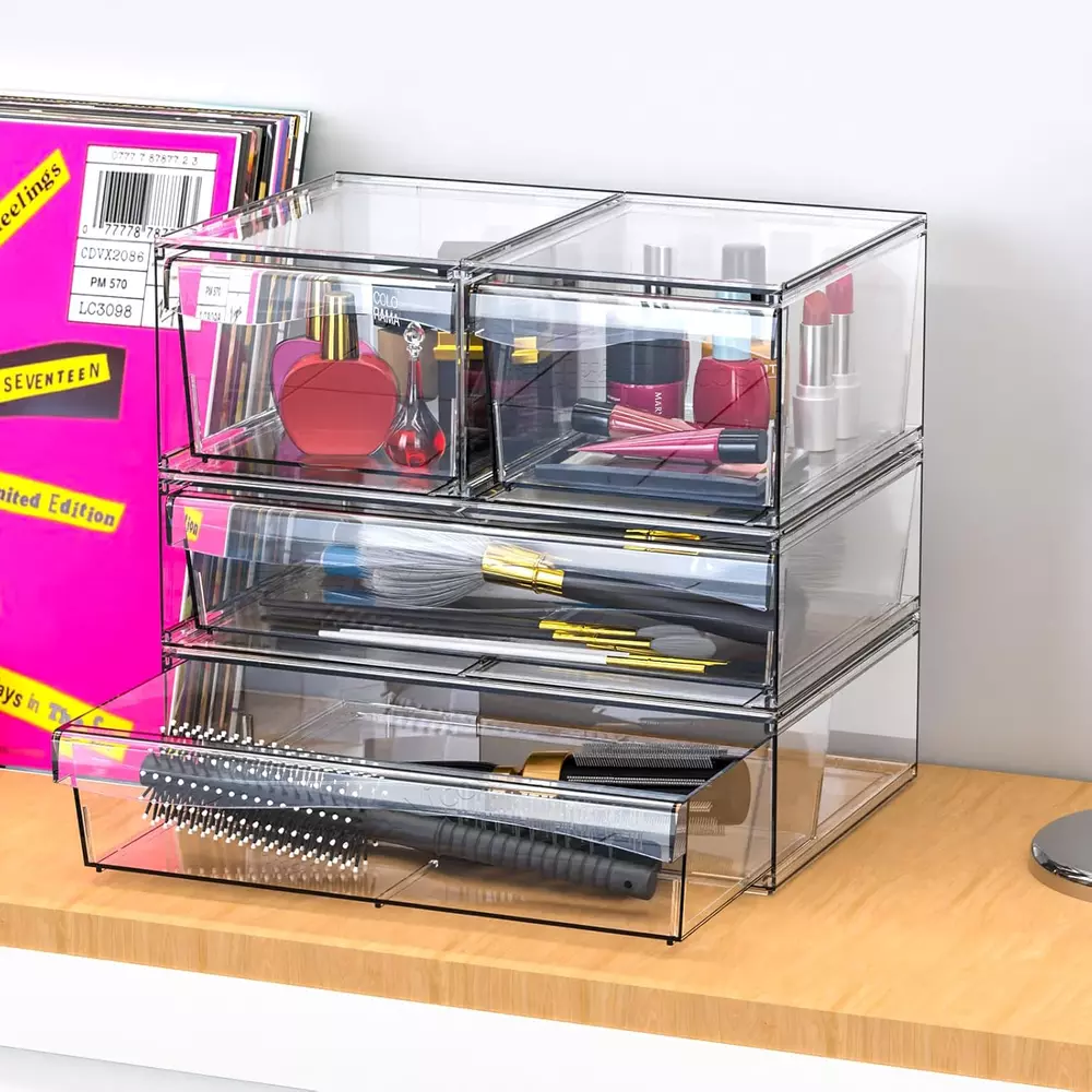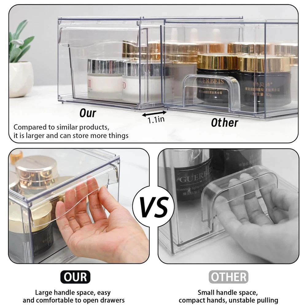 eBay 【Large Stacking acrylic organizers】- The make up storage has 4 independent drawer organizers, They can be used as organizers and storage for makeup, bathroom countertop, kitchen or laundry under sink, medicine cabinet, pantry, vanity. 【Multifunctional clear storage bins】Design of drawers of different sizes makes it a perfect under the sink storage for storing medicine,lotion,skin care,facial cleanser, lipsticks, eye shadows, concealers, and other skin care products 【Stackable Drawers Design】-clear organizers can stack each other,You can use each drawer separately,It is very suitable to be placed on the dormitory,bedroom,Vanity Countertop,dressing table,office desktop,Bathroom Counter clear organizing containers 【This clear stackable storage bins is Perfect Gift】 - Perfect choice as a under sink organizer and Makeup organizer gift to women,Girl,girlfriend, daughter, wife, mom, and friends. College dorm room essentials for girls. 【Stylish and Durable cabinet organizers and storage】: This organizer is also a must-have for beauty bloggers, makeup artists, and college students. Very suitable as: desk storage, under sink storage, makeup storage, under bathroom sink organizer Product Description Stackable Organizer Drawers Maximizes Countertop and Cabinet Storage Capacity Organizer can stack each other,You can use each drawer separately or match it with Our other drawers from our brand,the medicine organizer compact and simple design, does not deform, and is shiny. A great helper for desk organizer Vanity Can be placed on the makeup table, to store your makeup supplies, such as brushes, loose powder, powder, mask, foundation liquid, sunscreen and so on cosmetics, so that your desktop clean and orderly, items classification, transparent design can make you very simple to find what you need. Coffee bar This acrylic stacking box can be placed next to the coffee table, used to store your coffee and various coffee seasonings, will keep the whole table very clean, so that you can quickly find your things next time. The effect of two boxes stacked together Two kinds of acrylic stacking boxes together also have a certain degree of beauty, but also can put different kinds of things, as a storage or a better choice, just can also be placed in a small cabinet, transparent design is also easier to find things Stacked prevents products from moving when drawers are opened Product size Acrylic stacking box is composed of two parts, drawer and shell, the size is not the same, the drawer size is7.7*5.8*3.9inches.the shell size is7.9*6*4.5inches.