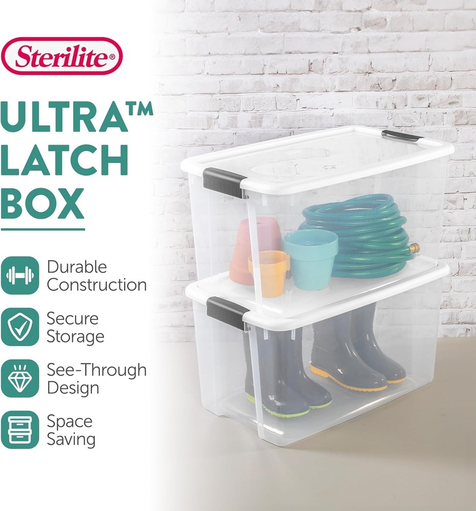 Nullify Dimensions & Size: The storage boxes have outside dimensions of 26 1/8" x 16 1/4" x 13 1/2" and interior dimensions at the bottom of 20" x 13 1/2" x 12 5/8", making them ideal for storage needs. Durability & Security: Sterilite's Ultra Latch Boxes provide a durable storage solution. Equipped with heavy-duty latches, the lid attaches securely to the base, keeping contents protected. Transparent & Convenient: The clear base design allows for effortless viewing of stored items, helping you quickly identify and access what you need. Organize Effortlessly: A stackable design makes efficient use of vertical space in closets, basements, garages, and attics, ensuring areas remain tidy and items are easily accessible. Sterilite products are proudly made in the USA since 1939 and are BPA and phthalate-free. On Nov 13, 2025 at 15:35:18 PST, seller added the following information: