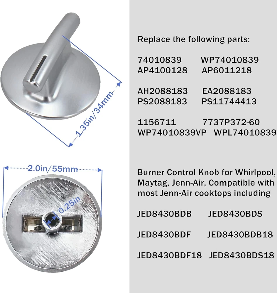 Problem Solving: The Most Common Cause is Cracked or Old, Won't Start, Won't Turn, and Replacing the Burner Knob Allows You to Control the Heat of Your Gas Stove, an Affordable Way to Extend the Life of Your Machine. Dimensions: 2 x 2 x 1.354 Inches, Mounting Hole Diameter: 0.25" (6.3 mm) Quantity: 4 Pcs Warm. Burner Knob is Chrome-plated With a Plastic Finish, An Ultra-durable, High-quality Material that Resists Wear and Tear Over Time. Replace the Following Parts: 74010839 , WP74010839 , AP4100128 , AP6011218 , 1156711 , 7737P372-60 , AH2088183 , EA2088183 , PS2088183 , PS11744413 , WP74010839VP , WPL74010839 .Burner Control Knob for Whirlpool, Maytag, Jenn-Air, Compatible With Most Jenn-Air Cooktops Including JED8430BDB , JED8430BDS , JED8430BDF , JED8430BDB18 , JED8430BDF18 , JED8430BDS18 . Easy to Install: Pull the Knob Straight Out of the Post, Remove It, and Screw in a New Knob. (No Installation Tools Required to Quickly Get Your Gas Stove Up and Running) Quality Assurance: This is a Replacement for a Manufacturer's Specific Design, But is Functionally Equivalent to the Previous Part, Which has Been Internally Tested to Meet or Exceed the PerfOrmance of the OEM Replacement. Product Description PRODUCT DIMENSIONS 2 x 2 x 1.354 Inches, Mounting Hole Diameter: 0.25" (6.3 mm) Quantity: 1 PcsWarm. Burner Knob is Chrome-plated With a Plastic Finish, An Ultra-durable, High-quality Material that Resists Wear and Tear Over Time. PROBLEM SOLVING This is an Affordable Way to Extend the Life of Your Machine. Replace the Following Parts: 74010839 , WP74010839 , AP4100128 , AP6011218 , 1156711 , 7737P372-60 , AH2088183 , EA2088183 , PS2088183 , PS11744413 , WP74010839VP , WPL74010839 . Burner Control Knob for Whirlpool, Maytag, Jenn-Air, Compatible With Most Jenn-Air Cooktops Including JED8430BDB , JED8430BDS , JED8430BDF , JED8430BDB18 , JED8430BDF18 , JED8430BDS18 . Cracked or Old Won't Start Won't Turn OE ADAPTATION PERFORMANCE This Accessory Is A Pro Grade Quality Replacement Manufactured By A Professional Team, But Is Functionally Equivalent To The Original Part, Please Check Compatibility With Your Previous Part And Equipment Model Before Ordering This Replacement. EASY TO INSTALL Pull the Knob Straight Out of the Post, Remove It, and Screw in a New Knob. (No Installation Tools Required to Quickly Get Your Gas Stove Up and Running) HIGH-QUALITY PRODUCT Well Designed, Well Machined, High Quality Exactly Equal To Original Manufacturer Specifications. Made From Durable, High-Quality Materials, Products Provide The Durability You Need At A Fraction Of The Cost Of Replacement Parts. Save You Time And Money.
