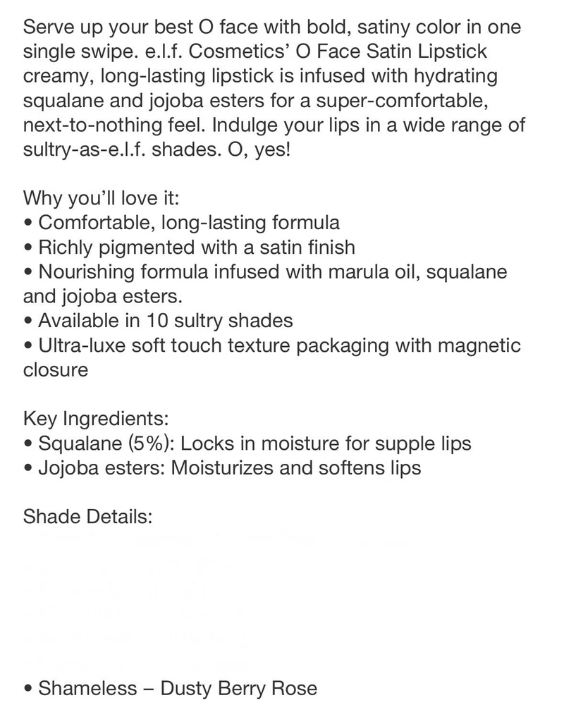 4 Pack e.l.f. O Face Satin Lipstick *SHAMELESS* Rich Pigment (7913) BB3401