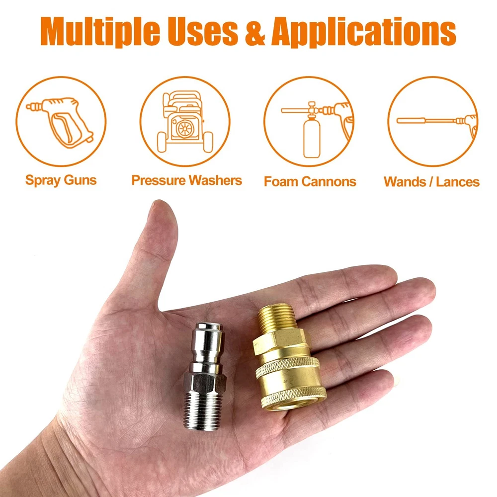 NPT : These adapter sets and quick connector plug connectors are NPT compliant Before connecting, please check the specifications , you can connect to most connectors that are NPT compliant. Specifications: Material: Stainless steel male connect nipples; Brass quick connector Quantity: 8 pieces Size: 1/4 inches Package included: 4 Pairs x NPT 1/4 inch quick connector pressure washer adapter sets Note: Please check the detail before purchasing, if there is any help. Please contact us, we will reply you asap. Withstand Pressures: These quick connector kit and stainless steel male connect nipples withstands pressure is up to 5000-6000 PSI NPT Compatible: These 1/4 quick connect fittings adapter sets and quick connector plug nipples are all NPT compatible, so please check the specifications before connect them and you can connect to most NPT- compliant connectors Quantity: The Brass quick connector and Stainless Steel male connect nipples are 1/4 inch, please check and connect to the right size. 4 Pairs of quick connector pressure washer adapters will sufficient for your need to replacement Durable Features: 1/4 quick pressure washers and pressure washers nipples kit are made with accurate process, safe, and strong and sturdy, not easy to break and don't leak and fade easily, sturdy and durable for long time use Easy to Connect: These pressure washers and quick connector plug nipples kit is easy to be assembled, they can fit for hose, water pump, ball valve, telescoping wand, surface cleaner and so on