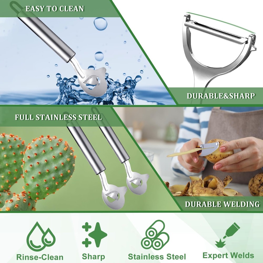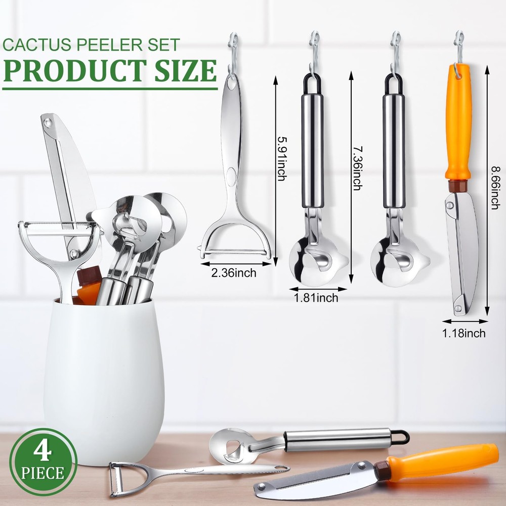 Features: Stylish and practical design: Our silver cactus peeler set combines functionality with style, complementing any kitchen decoration. The sleek, professional look paired with practical features makes it a valuable addition to modern kitchens, offering both aesthetic appeal and unmatched efficiency in various culinary tasks. Multipurpose kitchen tool: The cactus peeler set is a practical choice for increasing safety and convenience in your kitchen. Whether for home cooking or professional use in hotels and restaurants, these tools provide a multipurpose solution for efficient food preparation, catering to the diverse needs of any kitchen. Specifications: Material: stainless steel Color: silver, orange Size: Peeler: 5.91 inches long, 2.36 inches wide Peeler knife: 8.66 inches long, 1.1 inches wide Peeler spoon: 7.36 inches long, 1.81 inches wide Package includes: 1 x Peeler 1 x Peeler knife 2 x Peeler spoon Notes: Manual measurement, please allow slight errors on size. The color may exist a slight difference due to different screen displays. Versatile Culinary Companion: introducing our comprehensive cactus peeler set, featuring 1 peeler, 1 cactus peeler knife, and 2 cactus peeler spoons; Designed to meet your diverse kitchen needs, this set is nice for effortlessly peeling cactus skin, slicing dough, and cutting pie crusts, making it an essential tool for every culinary enthusiast Efficient and Safe Cutting: our cactus peeler features grooved blade designs for precise, efficient cutting and slicing; This ensures you enjoy a safe, convenient cooking experience that maximizes efficiency while minimizing the probability of hand injuries, making it a reliable tool for safe and precise kitchen tasks Reliable Material and Non Slip Handle Design: our cactus peeler is made of stainless steel, which is sturdy and durable; The non slip handle ensures a firm grip and minimizes hand fatigue even after long term use; This practical design is nice for chefs and home cooks, giving you comfort when preparing food Convenient Storage and Maintenance: each tool in the cactus peeler set is carefully designed with a hanging hole for easy storage; The stainless steel material can be cleaned quickly and easily with water or a damp cloth without leaving any stains; This ensures your tools remain hygienic and long lasting; Pointed items are included, please be careful when using Ideal Gift for Cooking Aficionados: this exquisite cactus peeler tool set makes a thoughtful gift for those who adore cooking; It's an ideal present that promises enhanced efficiency and precision in meal preparation, catered specifically to chefs and cooking enthusiasts looking for reliable and versatile kitchen tools