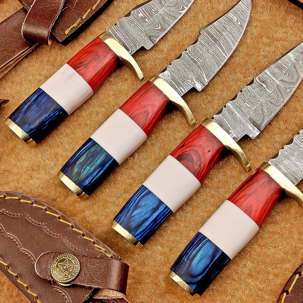 LOT OF 4 PCS! Handmade Damascus Hunting Knives – Multicolor Wood Handles Specifications: Overall Length: 6.00" Blade Thickness: ~4 mm Blade Material: Damascus Steel Handle Material: Multicolor wood and camel bone with mosaic pin with hand casted brass bolster. Includes: Leather sheaths. Blade Craftsmanship: Blades are made from 1095 & 15N20 High Carbon Tool Steel with over 256 layers and a hardness of 58-60 HRC for durability and sharpness. Spine of the blade tang has excellent fire work Care Instructions: Sharpen with a Diamond Wet Stone at a 20-degree angle. Clean with soap and water, dry thoroughly, and apply gun oil. Store away from the sheath to prevent rust. Important Notes for Buyers: Verify your country’s import regulations before purchase. Customs duties, if any, are the buyer’s responsibility. Shipping & Returns: Free shipping included. 14-day return policy applies. Contact Us: Message us anytime. We respond within 24 hours.